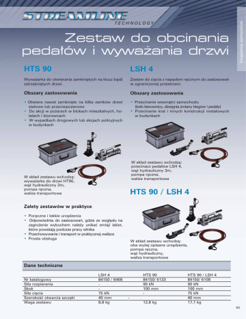 Zestaw do obcinania pedałów i wyważania drzwi HTS 90 LSH 4 Wyważarka do otwierania zamkniętych na klucz bądź zatrzaśniętych drzwi. Zestaw do cięcia z napędem ręcznym do zastosowań w ograniczonej przestrzeni. Obszary zastosowania Obszary zastosowania • Otwiera nawet zamknięte na kilka zamków drzwi stalowe lub przeciwpożarowe • Do akcji w pożarach w blokach mieszkalnych, hotelach i biurowcach • W wypadkach drogowych lub akcjach policyjnych w budynkach • Przecinanie wewnątrz samochodu (koło kierownicy, dźwignia zmiany biegów i pedały) • Przecinanie krat i innych konstrukcji metalowych w budynkach Urządzenia pomocnicze TECHNOLOGY W skład zestawu wchodzą: przecinacz pedałów LSH 4, wąż hydrauliczny 3m, pompa ręczna, waliza transportowa W skład zestawu wchodzą: wyważarka do drzwi HT90, wąż hydrauliczny 3m, pompa ręczna, waliza transportowa HTS 90 / LSH 4 Zalety zestawów w praktyce • Poręczne i lekkie urządzenia • Odpowiednia do zastosowań, gdzie ze względu na zagrożenie wybuchem należy unikać emisji iskier, które powstają podczas pracy silnika • Przechowywanie i transport w praktycznej walizce • Prosta obsługa W skład zestawu wchodzą: oba wyżej opisane urządzenia, pompa ręczna, wąż hydrauliczny, waliza transportowa Dane techniczne Nr katalogowy Siła rozpierania Skok Siła cięcia Szerokość otwarcia szczęki Waga zestawu LSH 4 84150 / 6468 75 kN 40 mm 8,8 kg HTS 90 84150/ 6133 90 kN 100 mm 12,8 kg HTS 90 / LSH 4 84150/ 6108 90 kN 100 mm 75 kN 40 mm 17,1 kg 63