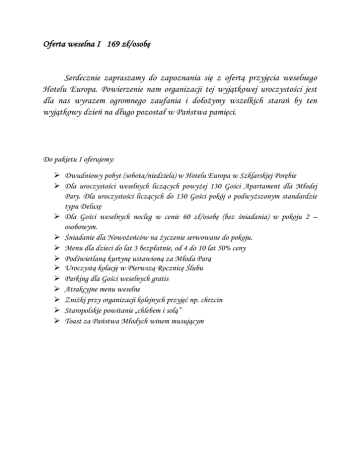 Oferta weselna I 169 zł/osobę Serdecznie zapraszamy do zapoznania się z ofertą przyjęcia weselnego Hotelu Europa. Powierzenie nam organizacji tej wyjątkowej uroczystości jest dla nas wyrazem ogromnego zaufania i dołożymy wszelkich starań by ten wyjątkowy dzień na długo pozostał w Państwa pamięci. Do pakietu I oferujemy: Dwudniowy pobyt (sobota/niedziela) w Hotelu Europa w Szklarskiej Porębie Dla uroczystości weselnych liczących powyżej 130 Gości Apartament dla Młodej Pary. Dla uroczystości liczących do 130 Gości pokój o podwyższonym standardzie typu Deluxe Dla Gości weselnych nocleg w cenie 60 zł/osobę (bez śniadania) w pokoju 2 – osobowym. Śniadanie dla Nowożeńców na życzenie serwowane do pokoju. Menu dla dzieci do lat 3 bezpłatnie, od 4 do 10 lat 50% ceny Podświetlaną kurtynę ustawioną za Młoda Parą Uroczystą kolację w Pierwszą Rocznicę Ślubu Parking dla Gości weselnych gratis Atrakcyjne menu weselne Zniżki przy organizacji kolejnych przyjęć np. chrzcin Staropolskie powitanie „chlebem i solą” Toast za Państwa Młodych winem musującym Zupa Tradycyjny rosół z trzech rodzajów mięsa z domowym makaronem, marchewką i świeżą natką pietruszki Drugie danie (w wersji półmiskowej) 2 porcje mięsa na osobę (do wyboru pięć rodzajów) Tradycyjny kotlet schabowy smażony na smalcu De Volaille z serem i natką pietruszki Roladki drobiowe z pieczarkami Roladki drobiowe ze szpinakiem Rolada schabowa nadziewana mięsem i suszonymi pomidorami Rolada schabowa nadziewana szpinakiem i pieczarkami Szpikowana czosnkiem pieczeń z karkówki Rolada wieprzowa na sposób śląski Stek wieprzowy z cebulką Dodatki warzywne 1,5 porcji na osobę Surówka z białej kapusty Surówka z buraczków Surówka z marchwi z ananasem Zasmażana kapusta (opcjonalnie) Dodatki skrobiowe 1,5 porcji/osobę Gotowane ziemniaki z masłem i koperkiem Tradycyjne kluski śląskie Frytki Dla dzieci proponujemy: Panierowany kotlet z kurczaka z frytkami Deser Ciasta eksponowane na lustrach (100 g/osobę) Wraz z bufetem kawowo/herbacianym *Tort zamawiany z cukierni za pośrednictwem Hotelu lub we własnym zakresie Zimne zakąski (podawane do stołu) Deska mięs pieczystych a wśród nich: Schab z morelą Karczek marynowany w ziołach Galantyna z drobiu Boczek faszerowany Babeczki z sałatkami Tymbaliki drobiowe/wieprzowe Śledź po polsku Sałatka brokułowa Sałatka gyros Pikle Pieczywo, masło Gorące kolacje I Szaszłyki i golonka na kapuście II Barszcz z pasztecikiem lub krokietem III Zupa gulaszowa lub flaki *Płonący udziec serwowany przez Kucharza podawany z prażoną kaszą, zasmażaną kapustą oraz sosem borowikowo – podgrzybkowym (przy dopłacie 5 zł/osobę istnieje możliwość zamiany I gorącej kolacji) Napoje 1l/osobę Woda z miętą i cytryną, soki owocowe (jabłkowy, pomarańczowy, grapefruitowy, z czarnej porzeczki), napoje gazowane (coca – cola, sprite, fanta) Ponadto proponujemy: Owoce eksponowane na lustrach w bufecie 600 zł (mały) i 1000 zł (duży) Bufet Słodkości 600 zł (mały) i 1200 zł (duży) Fontanna czekoladowa (z szaszłykami owocowymi, piankami, rurkami) 800 zł (mała) i 1500 zł (duża) Stół wiejski (do ustalenia) od 1000 do 2500 zł Stół rybny (do ustalenia) od 1000 do 1500 zł