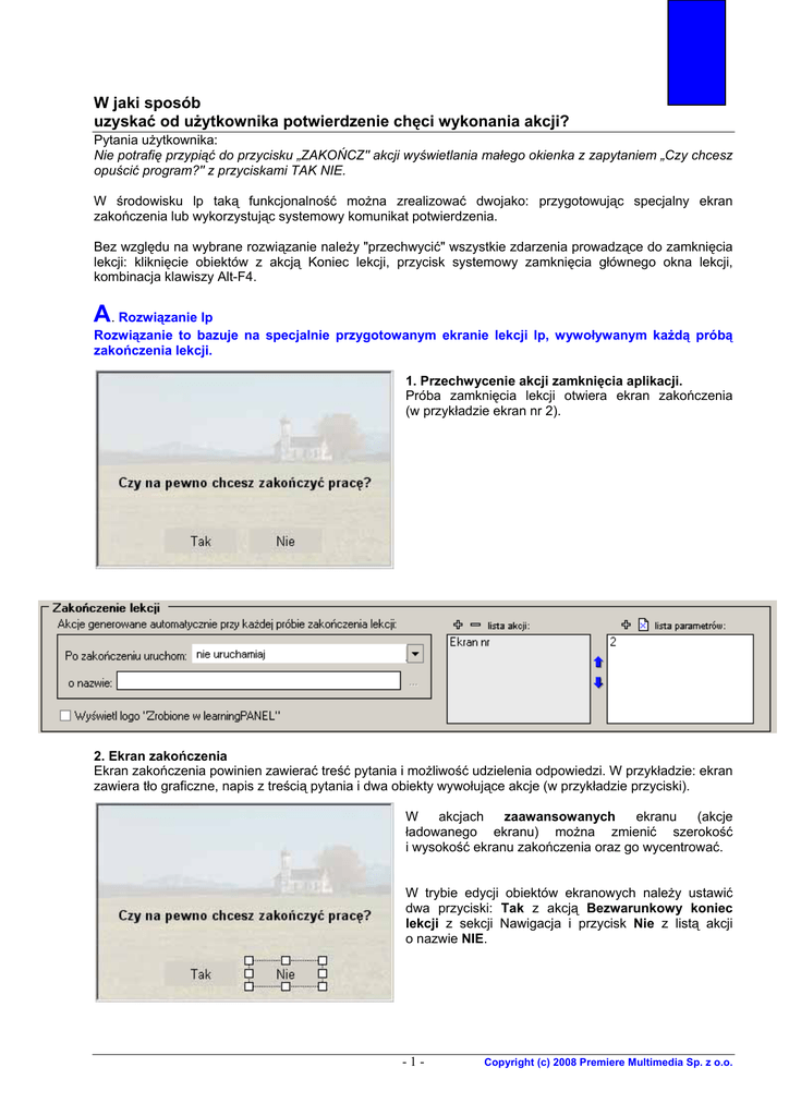W jaki sposób uzyskać od użytkownika potwierdzenie chęci wykonania akcji? Pytania użytkownika: Nie potrafię przypiąć do przycisku „ZAKOŃCZ" akcji wyświetlania małego okienka z zapytaniem „Czy chcesz opuścić program?" z przyciskami TAK NIE. W środowisku lp taką funkcjonalność można zrealizować dwojako: przygotowując specjalny ekran zakończenia lub wykorzystując systemowy komunikat potwierdzenia. Bez względu na wybrane rozwiązanie należy "przechwycić" wszystkie zdarzenia prowadzące do zamknięcia lekcji: kliknięcie obiektów z akcją Koniec lekcji, przycisk systemowy zamknięcia głównego okna lekcji, kombinacja klawiszy Alt-F4. A. Rozwiązanie lp Rozwiązanie to bazuje na specjalnie przygotowanym ekranie lekcji lp, wywoływanym każdą próbą zakończenia lekcji. 1. Przechwycenie akcji zamknięcia aplikacji. Próba zamknięcia lekcji otwiera ekran zakończenia (w przykładzie ekran nr 2). 2. Ekran zakończenia Ekran zakończenia powinien zawierać treść pytania i możliwość udzielenia odpowiedzi. W przykładzie: ekran zawiera tło graficzne, napis z treścią pytania i dwa obiekty wywołujące akcje (w przykładzie przyciski). W akcjach zaawansowanych ekranu (akcje ładowanego ekranu) można zmienić szerokość i wysokość ekranu zakończenia oraz go wycentrować. W trybie edycji obiektów ekranowych należy ustawić dwa przyciski: Tak z akcją Bezwarunkowy koniec lekcji z sekcji Nawigacja i przycisk Nie z listą akcji o nazwie NIE. -1- Copyright (c) 2008 Premiere Multimedia Sp. z o.o. W liście akcji NIE wywołujemy następujące akcje: - przywrócenie pierwotnego rozmiaru okna - akcje ustawiające szerokość i wysokość oraz wyśrodkowujące okno na ekranie - Wstecz z sekcji Nawigacja (cofanie po śladach) Uwaga 1. Zmiana rozmiaru okna lekcji (ekranu lekcji) w trakcie pracy z lekcją może pogorszyć komfort pracy użytkownika (nagłe zmiany stałych obiektów na ekranie, migotanie krawędzi). 2. Ekrany o różnych rozmiarach lepiej wyglądają w lekcji wykorzystującej zasłonięcie pulpitu. 3. Okno potwierdzające może zostać zrealizowane bez zmiany jego rozmiaru. 4. Okno potwierdzające powinno być pomijane przy "chodzeniu" po lekcji poleceniami Dalej/Wstecz. Aby ukryć ekran należy zaznaczyć pole Ukryj ekran w sekcji Karta ekranu. -2- Copyright (c) 2008 Premiere Multimedia Sp. z o.o. B. Rozwiązanie systemowe Rozwiązanie to wykorzystuje systemowe okno dialogowe z gotowymi przyciskami Tak/Nie/Anuluj lub innymi, zdefiniowanymi przez użytkownika. Rozwiązanie systemowe - komunikat zakończenia wywoływany każdą próbą zamknięcia aplikacj. Wersja dwuprzyciskowa z domyślnymi nadrukami Tak/Nie. Wywołanie akcji można związać z dowolnym zdarzeniem np. zamknięciem lekcji, kliknięciem przycisku na odpowiednim ekranie, wywołaniem procedury interpretacji wyników. W przykładzie okno dialogowe wywoływane jest przez procedurę zamykania lekcji. Wszystkie potrzebne akcje znajdują się w sekcji Systemowe. Pierwsze dwie akcje odpowiadają za nagłówek i treść pytania. Trzecia akcja przyporządkowuje przyciskowi Nie akcję Anuluj zakończenie. Akcja ta przerywa proces zamykania aplikacji. W omawianym przykładzie nie ma potrzeby określania jakiejkolwiek funkcjonalności dla przycisku Tak - po jego kliknięciu system sam z siebie zamknie okienko dialogowe, a ponieważ omawiane akcje są reakcją na próbę zamknięcia lekcji, więc jeśli program nie napotka w wyniku ich realizacji żadnej przeszkody, to lekcja zostanie zamknięta. Parametrem akcji Dialog potwierdzający - przycisk2 - akcja jest akcja Anuluj zakończenie wskazana w oknie parametry akcji, zakładka Listy akcji, akcje, przycisk Akcje, sekcja Nawigacja. Akcja Anuluj zakończenie jest akcją bezparametrową. Informacja o liczbie i treści nadruków przycisków informuje parametr akcji Dialog potwierdzający przyciski. Można użyć od jednego do trzech przycisków z dowolnymi nadrukami i dowolną funkcjonalnością. Treści nadruków separowane są znakami średnika (;), dlatego też tego znaku nie należy używać w nadrukach. -3- Copyright (c) 2008 Premiere Multimedia Sp. z o.o. Uwaga W akcjach realizowanych w reakcji na próbę zamknięcia lekcji nie wolno umieszczać akcji: - Koniec lekcji, - Bezwarunkowy koniec lekcji. Próba umieszczenia akcji wywołującej koniec lekcji w procedurze końca lekcji spowoduje zapętlenie programu (akcja wywołuje samą siebie = pętla nieskończona) prowadzące do błędu krytycznego. Inne warianty okna dialogowego Trójprzyciskowy komunikat został zrealizowany za pomocą poniższej listy akcji wykonywanej przy próbie zamknięcia lekcji. Komunikat z przyciskiem definiowanym przez użytkownika odwleka zamknięcie aplikacji. Powyższa lista akcji przerywa polecenie zamknięcia lekcji. Aby użytkownik mógł jednak lekcję przerwać, w odpowiednim miejscu programu (np. po spełnieniu określonego warunku) umieszczono wywołanie zakończenia bezwarunkowego. -4- Copyright (c) 2008 Premiere Multimedia Sp. z o.o.