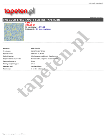 Informacje o produkcie Utworzono 07-03-2017 VAN GOGH 17150 TAPETY ŚCIENNE TAPETA BN Cena : 205,50 zł VAN GOGH Producent: BN INTERNATIONAL Wymiar rolki: 0,53 m x 10,05 mb Rodzaj tapety: pe te n Kolekcja: .p l Nr katalogowy : 17150 Producent : BN International Winylowa na podkładzie flizelinowym Odporność na zmywanie: Bardzo dobra, odporna na szorowanie Pasowanie wzoru: 64 cm Tapety uzupełniające: Zalecany klej: Metylan Direct 5 -15 dni roboczych ta Realizacja: 17131 Wygenerowano w programie www.oscGold.com