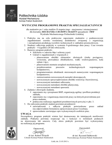 Politechnika Łódzka Wydział Mechaniczny Komisja Praktyk Studenckich WYTYCZNE PROGRAMOWE PRAKTYK SPECJALIZACYJNYCH dla studentów po 1 roku studiów II stopnia (mgr - stacjonarne i niestacjonarne) dla kierunku MECHANIKA I BUDOWA MASZYN specjalność: TBM Wydziału Mechanicznego Politechniki Łódzkiej 1. Praktyka ma na celu praktyczne zapoznanie studentów z podstawowymi zagadnieniami szeroko rozumianej działalności związanej z organizacją i zarządzaniem produkcją wyrobów technicznych w zakładzie przemysłowym. 2. Studenci odbywają praktykę w systemie 8-godzinnego dnia pracy. Czas trwania praktyki – 4 tygodnie (20 dni roboczych). 3. Ramowy program praktyki: Szkolenie w zakresie bhp i ochrony p.poż. Udział w zagadnieniach z wiązanych z: - planowaniem obróbki elementów złożonych (śruby pociągowe, wrzeciona, prowadnice obrabiarkowe, wałki wielowypustowe, koła zębate i itp.), - planowaniem montażu urządzeń mechanicznych, - projektowaniem procesów technologicznych wspomaganym komputerowo, - programowaniem obrabiarek sterowanych numerycznie wspomaganym komputerowo, - zastosowaniem nowoczesnych narzędzi skrawających, - nowoczesnym oprzyrządowaniem obróbki wiórowej i bezwiórowej, - nowoczesnymi metodami odlewania, - nowoczesnymi metodami obróbki plastycznej, - nowoczesnymi metodami spawania. 4. Zadania i obowiązki studenta. zapoznanie się z przepisami BHP, organizacją ogólną i profilem produkcji zakładu, zapoznanie się z organizacją stanowisk pracy na których przewidziana jest praca studenta, praktyczna realizacja zagadnień przedstawionych powyżej w pkt. 3. 5. Do zaliczenia praktyki student powinien przedstawić: zaświadczenie z odbycia praktyki potwierdzone przez zakład (na odpowiednim formularzu opracowanym przez Uczelnię), sprawozdanie zawierające opis wykonywanych osobiście prac. UWAGA Szczegółowy program praktyki winien być dostosowany do istniejących możliwości zakładu. Praktyka powinna rozpocząć się i kończyć w terminach podanych na skierowaniu lub umowie. Cały okres praktyki powinien być wykorzystany na realizację jej programu. Zatwierdził: Opracował: dr inż. Robert Święcik Członek Komisji Praktyk Studenckich dr inż. Ryszard Dębkowski Przewodniczący Komisji Praktyk Studenckich Łódź, dn. 21.03.2013 r.