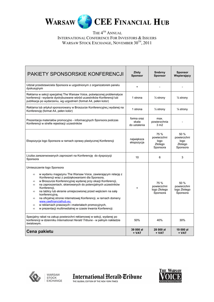 THE 4TH ANNUAL INTERNATIONAL CONFERENCE FOR INVESTORS & ISSUERS WARSAW STOCK EXCHANGE, NOVEMBER 30TH, 2011 Złoty Sponsor Srebrny Sponsor Sponsor Wspierający + - - Reklama w sekcji specjalnej The Warsaw Voice, poświęconej problematyce konferencji –wydanie dystrybuowane wśród uczestników Konferencji lub publikacja po wydarzeniu, wg uzgodnień (format A4, pełen kolor) 1 strona ½ strony ¼ strony Reklama lub artykuł sponsorowany w Broszurze Konferencyjne,j wydanej na Konferencję (format A4, pełen kolor) 1 strona ½ strony ¼ strony Prezentacja materiałów promocyjno - informacyjnych Sponsora podczas Konferencji w strefie rejestracji uczestników forma oraz skala do ustalenia max. powierzchnia 3 m2 - Ekspozycja logo Sponsora w ramach oprawy plastycznej Konferencji największa ekspozycja 75 % powierzchni logo Złotego Sponsora 50 % powierzchni logo Złotego Sponsora 10 6 3 + 75 % powierzchni logo Złotego Sponsora 50 % powierzchni logo Złotego Sponsora 50% 40% 30% 39 000 zł + VAT 28 000 zł + VAT 19 000 zł + VAT PAKIETY SPONSORSKIE KONFERENCJI Udział przedstawiciela Sponsora w uzgodnionym z organizatorem panelu dyskusyjnym Liczba zarezerwowanych zaproszeń na Konferencję do dyspozycji Sponsora Umieszczenie logo Sponsora • • • • • • • w wydaniu magazynu The Warsaw Voice, zawierającym relację z Konferencji wraz z podziękowaniami dla Sponsora, w Broszurze Konferencyjnej wydanej przy okazji Konferencji, na zaproszeniach, skierowanych do potencjalnych uczestników Konferencji, na tablicy lub ekranie umiejscowionej przed wejściem na salę konferencyjną, na oficjalnej stronie internetowej Konferencji, w ramach domeny www.ceefinancialhub.eu, w reklamach prasowych i materiałach promocyjnych, w prezentacji multimedialnej w czasie trwania Konferencji. Specjalny rabat na zakup powierzchni reklamowej w sekcji, wydanej po konferencji w dzienniku International Herald Tribune - w pełnym nakładzie światowym. Cena pakietu