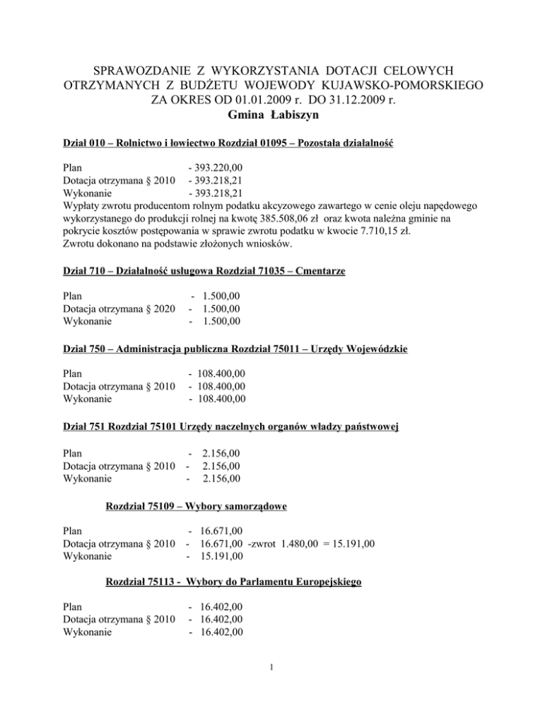 SPRAWOZDANIE Z WYKORZYSTANIA DOTACJI CELOWYCH OTRZYMANYCH Z BUDŻETU WOJEWODY KUJAWSKO-POMORSKIEGO ZA OKRES OD 01.01.2009 r. DO 31.12.2009 r. Gmina Łabiszyn Dział 010 – Rolnictwo i łowiectwo Rozdział 01095 – Pozostała działalność Plan - 393.220,00 Dotacja otrzymana § 2010 - 393.218,21 Wykonanie - 393.218,21 Wypłaty zwrotu producentom rolnym podatku akcyzowego zawartego w cenie oleju napędowego wykorzystanego do produkcji rolnej na kwotę 385.508,06 zł oraz kwota należna gminie na pokrycie kosztów postępowania w sprawie zwrotu podatku w kwocie 7.710,15 zł. Zwrotu dokonano na podstawie złożonych wniosków. Dział 710 – Działalność usługowa Rozdział 71035 – Cmentarze Plan Dotacja otrzymana § 2020 Wykonanie - 1.500,00 - 1.500,00 - 1.500,00 Dział 750 – Administracja publiczna Rozdział 75011 – Urzędy Wojewódzkie Plan Dotacja otrzymana § 2010 Wykonanie - 108.400,00 - 108.400,00 - 108.400,00 Dział 751 Rozdział 75101 Urzędy naczelnych organów władzy państwowej Plan Dotacja otrzymana § 2010 Wykonanie - 2.156,00 2.156,00 2.156,00 Rozdział 75109 – Wybory samorządowe Plan Dotacja otrzymana § 2010 Wykonanie - 16.671,00 - 16.671,00 -zwrot 1.480,00 = 15.191,00 - 15.191,00 Rozdział 75113 - Wybory do Parlamentu Europejskiego Plan Dotacja otrzymana § 2010 Wykonanie - 16.402,00 - 16.402,00 - 16.402,00 1 Dział 801 Rozdział 80101- Szkoły podstawowe Plan Dotacja otrzymana § 2030 Wykonanie „Radosna Szkoła” - 6.000,00 - 6.000,00 - 6.000,00 Dział 801 Rozdział 80195 – Pozostała działalność Plan - 660,00 Dotacja otrzymana § 2030 - 660,00 Wykonanie - 660,00 Prace Komisji Kwalifikacyjnej powołanej do rozpatrzenia wniosków nauczycieli o wyższy stopień awansu zawodowego. Dział 852 Rozdział 85212 - Realizacja świadczeń rodzinnych : Plan roczny - 3.098.535,00 Dotacja otrzymana § 2010 - 3.098.535,00 -zwrot 21.198,41 Wykonanie - 3.077.336,59 ZWROTY Z LAT UBIEGŁYCH - 2.964,00 307,90 2.364,47 2.364,36 = 3.077.336,59 85212 §2910 85212 §0900 85212 §0970 85212 §0670 Zal. Państwo Zal.Gmina ZWROTY FUNDUSZU ALIMENTACYJNEGO: - do budżetu Państwa - 19.536,88 - do obcych gmin - 3.598,07 - dochody własne - 8.920,03 + z obcych gmin 3.066,94 + zaliczka 2.364,36 = 14.351,33 - odsetki - 1.180,76 wypłaty świadczeń rodzinnych § 3110 ZASIŁKI RODZINNE Z DODATKAMI : - zasiłki rodzinne - urodzenia dziecka - opieki nad dzieckiem w okresie korzystania z urlopu wychowawczego - samotnego wychowywania dziecka i utraty prawa do zasiłku dla bezrobotnych na skutek upływu ustawowego okresu jego pobierania - samotnego wychowywania dziecka - kształcenia i rehabilitacji do 5 lat powyżej 5 lat 2 - rozpoczęcie roku szkolnego - na pokrycie wydatków związanych z dojazdem - na pokrycie wydatków związanych z zamieszkaniem w miejscowości w której znajduje się szkoła - wychowania dziecka w rodzinie wielodzietnej ========================================================= Wydatek rodzinnego z dodatkami - 2.020.791,70 - Świadczenia opiekuńcze - Fundusz alimentacyjny Ogółem wydatek 85212 § 3110 - 565.658,00 358.645,90 - 2.945.095,60 Wydatki osobowe nie zaliczone do wynagrodzeń Wynagrodzenia dodatkowe wynagrodzenia roczne składki społeczne składki na fundusz pracy zakup materiałów na potrzeby św. Rodzinnych zakup usług pozostałych podróże służbowe krajowe odpisy na ZFŚS szkolenia pracowników zakup materiałów papierniczych zakup akcesoriów komp. i licencji RAZEM § 3020 316,00 § 4010 - 68.668,76 § 4040 - 6.877,73 § 4110 - 10.918,48 - 21.865,82 § 4120 - 1.741,10 § 4210 - 2.914,00 § 4300 - 11.727,14 § 4410 144,96 § 4440 - 3.067,00 § 4700 - 1.000,00 § 4740 - 1.000,00 § 4750 - 2.000,00 132.240,99 OGÓŁEM WYKONANIE ŚWIADCZEŃ RODZINNYCH 3.077.336,59 Dział 852 Rozdział 85213 -Składki na ubezpieczenie zdrowotne Plan Dotacja otrzymana §2010 §2030 Wykonanie - 18.000,00 11.661,00 6.339,00 – zwrot 32,29 = 6.306,71 17.967,71 Wykorzystanie dotacji na składki zdrowotne zostały zrealizowane dla świadczeniobiorców z MOPS : - zasiłki stałe - świadczenia pielęgnacyjne - 13.702,13 - 4.265,58 ------------------------------------------------------------------------------ RAZEM - 17.967,71 3 Dział 852 Rozdział 85214 § 2010 - Zasiłki Stałe Plan Dotacja otrzymana Wykonanie - 91.243,00 - 91.296,00 - zwrot 53,89 = 91.242,11 - 91.242,11 Dział 852 Rozdział 85214 § 2030 Zasiłki okresowe Plan Dotacja otrzymana Wykonanie - 426.000,00 -426.000,00 - zwrot 1.794,10 = 424.205,90 - 424.205,90 Źródła wydatków Zasiłki okresowe na kwotę / z budżetu państwa/ - 424.205,90 /z innych jednostek/ 9.264,55 Dział 852 Rozdział 85219 § 2030 – Utrzymanie Ośrodka Plan Dotacja otrzymana Wykonanie - 151.880,00 - 151.880,00 - zwrot 2,23 = 151.877,77 - 151.877,77 Źródła wydatków /z budżetu państwa/ wydatki osob. nie zalicz. do wynagr. wynagrodzenia dla pracowników zakładowy fundusz składki na ubezpieczenie społeczne składki na fundusz pracy zakup materiałów i wyposażenia zakup usług remontowych zakup usług pozostałych zakup usług zdrowotnych opłaty z tyt. zak. usł.telekom. podróże służbowe krajowe odpisy na ZFŚS szkolenia pracowników zakup materiałów papier. do druk. zakup akc. komp. i licencji § 3020 § 4010 § 4040 § 4110 § 4120 § 4210 § 4270 § 4300 § 4280 § 4370 § 4410 § 4440 § 4700 § 4740 § 4750 - 1.082,00 106.080,00 8.700,00 16.880,00 2.700,00 1.488,00 126,39 6.109,00 0,00 4.408,00 3.400,00 175,00 318,24 411,14 /z innych jednostek/ 144,00 104.095,69 7.718,00 16.686,27 2.316,37 2.386,92 0,00 2.439,11 670,00 4.313,75 206,84 2.500,00 353,20 263,71 1.178,65 ------------------------------------------------------------------------------------------------------------------RAZEM 151.877,77 145.272,51 4 Dział 852 Rozdział 85228 - Usługi opiekuńcze i specjalistyczne usługi opiekuńcze Plan Roczny Dotacja otrzymana Wykonanie - 20.000,00 20.000,00 - zwrot 0,92 = 19.999,08 19.999,08 składki społeczne skł