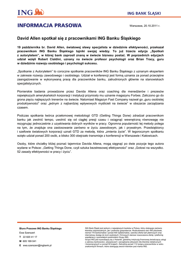 Warszawa, 20.10.2011 r. David Allen spotkał się z pracownikami ING Banku Śląskiego 19 października br. David Allen, światowej sławy specjalista w dziedzinie efektywności, przekazał pracownikom ING Banku Śląskiego tajniki swojej wiedzy. To już trzecia edycja „Spotkań z autorytetem”, w której bank zaprosił znaną w świecie biznesu postać. W poprzednich edycjach udział wzięli Robert Cialdini, uznany na świecie profesor psychologii oraz Brian Tracy, guru w dziedzinie rozwoju osobistego i psychologii sukcesu. „Spotkanie z Autorytetem” to coroczne spotkanie pracowników ING Banku Śląskiego z uznanym ekspertem w zakresie rozwoju zawodowego i osobistego. Udział w konferencji jest formą uznania za ponad przeciętne zaangażowanie w wykonywaną pracę dla pracowników banku, zatrudnionych głównie na stanowiskach specjalistycznych. Pionierskie badania prowadzone przez Davida Allena oraz coaching dla menedżerów i prezesów największych amerykańskich korporacji i instytucji przyniosły mu uznanie magazynu Forbes. Zaliczono go do grona pięciu najlepszych trenerów na świecie. Natomiast Magazyn Fast Company nazwał go „guru osobistej produktywności” oraz „jednym z najbardziej wpływowych myślicieli na świecie” w obszarze zarządzania czasem. Podczas spotkania twórca przełomowej metodologii GTD (Getting Things Done) zdradzał pracownikom banku jak zwolnić tempo, uwolnić się od ciągłej presji czasu i osiągnąć wewnętrzną równowagę nie rezygnując jednocześnie z uzyskiwania dobrych wyników w pracy. Ogromna popularność tej metody polega na tym, że znajduje ona zastosowanie zarówno w życiu zawodowym, jak i prywatnym. Przedsiębiorcy i szefowie światowych korporacji uznali GTD za metodę, która „zmienia życie”. W tegorocznym spotkaniu wzięło udział ponad 200 osób, a blisko 300 obejrzało transmisje z konferencji w Warszawie i Katowicach. Osoby, które chciałby bliżej poznać tajemnice Davida Allena, mogą sięgnąć po dwie pozycje tego autora wydane w Polsce: „Getting Things Done, czyli sztuka bezstresowej efektywności” oraz „Gotowi na wszystko. 52 zasady efektywności w pracy i życiu”. Biuro Prasowe ING Banku Śląskiego Ewa Szerszeń T 22 820 41 17 M 605 169 041 E [email protected] ING Bank Śląski jest jednym z największych banków w Polsce, który obsługuje zarówno klientów indywidualnych, jak i podmioty gospodarcze. Rozbudowana sieć 440 placówek, niemal 770 bankomatów i ponad 400 wpłatomatów, szeroka oferta kart płatniczych oraz internetowy dostęp do kont osobistych i firmowych stanowi nowoczesna ofertę i platformę współpracy z pozostałymi podmiotami Grupy ING. Grupa ING jest wywodzącą się z Holandii, globalną instytucją finansową świadczącą usługi z zakresu bankowości, ubezpieczeń i zarządzania aktywami dla klientów detalicznych i korporacyjnych w ponad 50 krajach. Zatrudnia ponad 114 tysięcy pracowników w wielu znakomitych firmach, które obsługują swoich klientów pod marka ING.