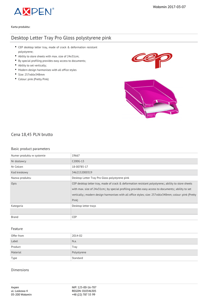 Wołomin 2017-03-07 Karta produktu: Desktop Letter Tray Pro Gloss polystyrene pink CEP desktop letter tray, made of crack & deformation resistant polystyrene; Ability to store sheets with max. size of 24x31cm; By special profiling provides easy access to documents; Ability to set vertically; Modern design harmonises with all office styles Size: 257x66x348mm Colour: pink (Pretty Pink) Cena 18,45 PLN brutto Basic product parameters Numer produktu w systemie 19667 Nr dostawcy C200G-13 Nr Celcen 18-00785-17 Kod kreskowy 3462152000319 Nazwa produktu Desktop Letter Tray Pro Gloss polystyrene pink Opis CEP desktop letter tray, made of crack & deformation resistant polystyrene;; ability to store sheets with max. size of 24x31cm;; by special profiling provides easy access to documents;; ability to set vertically;; modern design harmonises with all office styles; size: 257x66x348mm; colour: pink (Pretty Pink) Kategoria Desktop letter trays Brand CEP Feature Offer from 2014-02 Label N.a. Product Tray Material Polystyrene Type Standard Dimensions Axpen ul. Laskowa 4 05-200 Wołomin NIP: 125-00-16-787 REGON: 010346305 +48 (22) 787 55 99 Wołomin 2017-03-07 Karta katalogowa produktu cd. Desktop Letter Tray Pro Gloss polystyrene pink Format A4 Dimensions (mm) 257x66x348 Colour Drawer colour Light blue Colour Pink Procurement vocabulary CPV 30193200-0 Korytka i organizatory na biurka Certifications New product Standard Hit Standard Pozostałe zdjęcia produktu Serdecznie zapraszamy do współpracy Axpen zespół. Axpen ul. Laskowa 4 05-200 Wołomin NIP: 125-00-16-787 REGON: 010346305 +48 (22) 787 55 99