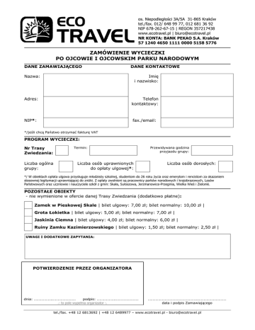 os. Niepodległości 3A/5A 31-865 Kraków tel./fax. 012/ 648 99 77, 012 681 36 92 NIP 678-262-67-15 | REGON 357217438 www.ecotravel.pl | [email protected] NR KONTA: BANK PEKAO S.A. Kraków 57 1240 4650 1111 0000 5158 5776 ZAMÓWIENIE WYCIECZKI PO OJCOWIE I OJCOWSKIM PARKU NARODOWYM DANE ZAMAWIAJĄCEGO DANE KONTAKTOWE Nazwa: Imię i nazwisko: Adres: Telefon kontaktowy: NIP*: fax./email: */jeśli chcą Państwo otrzymać fakturę VAT PROGRAM WYCIECZKI: Nr Trasy Zwiedzania: Liczba ogólna grupy: Termin: Liczba osób uprawnionych do opłaty ulgowej*: Przewidywana godzina przyjazdu grupy: Liczba osób dorosłych: */ W obiektach opłata ulgowa przysługuje młodzieży szkolnej, studentom do 26 roku życia oraz emerytom i rencistom za okazaniem stosownej legitymacji uprawniającej do zniżki. Z opłaty zwolnieni są pracownicy parków narodowych i krajobrazowych, Lasów Państwowych oraz uczniowie i nauczyciele szkół z gmin: Skała, Sułoszowa, Jerzmanowice-Przeginia, Wielka Wieś i Zielonki. POZOSTAŁE OBIEKTY - nie wymienione w ofercie danej Trasy Zwiedzania (dodatkowo płatne): Zamek w Pieskowej Skale | bilet ulgowy: 7,00 zł; bilet normalny: 10,00 zł | Grota Łokietka | bilet ulgowy: 5,00 zł; bilet normalny: 7,00 zł | Jaskinia Ciemna | bilet ulgowy: 4,00 zł; bilet normalny: 6,00 zł | Ruiny Zamku Kazimierzowskiego | bilet ulgowy: 1,50 zł; bilet normalny: 2,50 zł | UWAGI I DODATKOWE ZAPYTANIA: POTWIERDZENIE PRZEZ ORGANIZATORA dnia: ………………..…………………… podpis: ………………..…………………… .: to pole wypełnia organizator :. ……………………………………………..………………………… data i podpis Zamawiającego tel./fax. +48 12 6813692 | +48 12 6489977 – www.ecotravel.pl - [email protected] tel./fax. +48 12 6813692 | +48 12 6489977 – www.ecotravel.pl - [email protected]