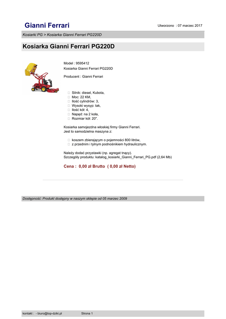 Gianni Ferrari Utworzono : 07 marzec 2017 Kosiarki PG > Kosiarka Gianni Ferrari PG220D Kosiarka Gianni Ferrari PG220D Model : 9595412 Kosiarka Gianni Ferrari PG220D Producent : Gianni Ferrari � Silnik: diesel, Kubota, � Moc: 22 KM, � Ilość cylindrów: 3, � Wysoki wysyp: tak, � Ilość kół: 4, � Napęd: na 2 koła, � Rozmiar kół: 20". Kosiarka samojezdna włoskiej firmy Gianni Ferrari. Jest to samodzielna maszyna z: � koszem zbierającym o pojemności 800 litrów, � z przednim i tylnym podnośnikiem hydraulicznym. Należy dodać przystawki (np. agregat tnący). Szczegóły produktu: katalog_kosiarki_Gianni_Ferrari_PG.pdf (2,64 Mb) Cena : 0,00 zł Brutto ( 0,00 zł Netto) Dostępność: Produkt dostępny w naszym sklepie od 05 marzec 2009 kontakt : - [email protected] Strona 1
