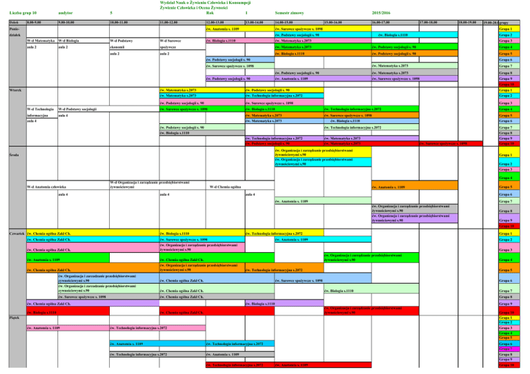 Liczba grup 10 audytor 5 Wydział Nauk o Żywieniu Człowieka i Konsumpcji Żywienie Człowieka i Ocena Żywności Rok I Dzień 9.00-10.00 10.00-11.00 11.00-12.00 8.00-9.00 12.00-13.00 13.00-14.00 ćw. Anatomia s. 1109 Ponie- Semestr zimowy 14.00-15.00 2015/2016 15.00-16.00 W-d Matematyka W-d Biologia W-d Podstawy W-d Surowce aula 2 ekonomii spożywcze aula 2 aula 2 17.00-18.00 18.00-19.00 ćw. Biologia s.1110 Grupa 1 Grupa 2 ćw. Matematyka s.2073 ćw. Podstawy socjologii s. 90 Grupa 4 ćw. Biologia s.1110 ćw. Podstawy socjologii s. 90 ćw. Matematyka s.2073 Grupa 3 Grupa 5 ćw. Podstawy socjologii s. 90 Grupa 6 ćw. Matematyka s.2073 ćw. Surowce spożywcze s. 1098 ćw. Podstawy socjologii s. 90 19.00-20.00grupy ćw. Biologia s.1110 ćw. Podstawy socjologii s. 90 działek aula 2 16.00-17.00 ćw. Surowce spożywcze s. 1098 Grupa 7 ćw. Podstawy socjologii s. 90 ćw. Matematyka s.2073 Grupa 8 ćw. Anatomia s. 1109 ćw. Surowce spożywcze s. 1098 Grupa 9 Grupa 10 ćw. Matematyka s.2073 Wtorek W-d Technologia W-d Podstawy socjologii informacyjna aula 4 ćw. Podstawy socjologii s. 90 Grupa 1 ćw. Matematyka s.2073 ćw. Technologia informacyjna s.2072 Grupa 2 ćw. Podstawy socjologii s. 90 ćw. Surowce spożywcze s. 1098 Grupa 3 ćw. Surowce spożywcze s. 1098 ćw. Biologia s.1110 ćw. Technologia informacyjna s.2072 Grupa 4 ćw. Matematyka s.2073 ćw. Surowce spożywcze s. 1098 Grupa 5 ćw. Matematyka s.2073 aula 4 ćw. Podstawy socjologii s. 90 ćw. Biologia s.1110 Grupa 6 ćw. Technologia informacyjna s.2072 Grupa 7 ćw. Matematyka s.2073 ćw. Matematyka s.2073 Grupa 9 Grupa 10 ćw. Biologia s.1110 Grupa 8 ćw. Technologia informacyjna s.2072 ćw. Podstawy socjologii s. 90 ćw. Surowce spożywcze s. 1098 ćw. Organizacja i zarządzanie przedsiębiorstwami żywnościowymi s.90 ćw. Organizacja i zarządzanie przedsiębiorstwami żywnościowymi s.90 Środa Grupa 1 Grupa 2 Grupa 3 Grupa 4 W-d Anatomia człowieka W-d Organizacja i zarządzanie przedsiębiorstwami żywnościowymi aula 4 ćw. Anatomia s. 1109 W-d Chemia ogólna aula 4 aula 4 Grupa 5 Grupa 6 ćw. Anatomia s. 1109 Grupa 7 ćw. Organizacja i zarządzanie przedsiębiorstwami żywnościowymi s.90 ćw. Organizacja i zarządzanie przedsiębiorstwami żywnościowymi s.90 Grupa 8 Grupa 9 Grupa 10 Czwartek ćw. Chemia ogólna Zakł Ch. ćw. Biologia s.1110 ćw. Technologia informacyjna s.2072 ćw. Chemia ogólna Zakł Ch. ćw. Surowce spożywcze s. 1098 ćw. Chemia ogólna Zakł Ch. ćw. Organizacja i zarządzanie przedsiębiorstwami żywnościowymi s.90 ćw. Anatomia s. 1109 ćw. Chemia ogólna Zakł Ch. ćw. Chemia ogólna Zakł Ch. ćw. Organizacja i zarządzanie przedsiębiorstwami żywnościowymi s.90 Grupa 3 ćw. Technologia informacyjna s.2072 ćw. Chemia ogólna Zakł Ch. ćw. Organizacja i zarzadzanie przedsiębiorstwami zywnościowymi s.90 ćw. Chemia ogólna Zakł Ch. ćw. Surowce spożywcze s. 1098 ćw. Chemia ogólna Zakł Ch. Grupa 6 ćw. Biologia s.1110 Grupa 7 Grupa 8 ćw. Biologia s.1110 ćw. Biologia s.1110 Grupa 4 Grupa 5 ćw. Surowce spożywcze s. 1098 ćw. Chemia ogólna Zakł Ch. Grupa 9 ćw. Organizacja i zarządzanie przedsiębiorstwami żywnościowymi s.90 ćw. Chemia ogólna Zakł Ch. Piątek ćw. Anatomia s. 1109 Grupa 2 ćw. Organizacja i zarządzanie przedsiębiorstwami żywnościowymi s.90 ćw. Anatomia s. 1109 ćw. Organizacja i zarzadzanie przedsiębiorstwami zywnościowymi s.90 Grupa 1 ćw. Technologia informacyjna s.2072 Grupa 10 Grupa 1 Grupa 2 Grupa 3 Grupa 4 Grupa 5 ćw. Anatomia s. 1109 ćw. Technologia informacyjna s.2072 Grupa 6 Grupa 7 ćw. Technologia informacyjna s.2072 ćw. Anatomia s. 1109 Grupa 8 Grupa 9 ćw. Technologia informacyjna s.2072 ćw. Anatomia s. 1109 Grupa 10