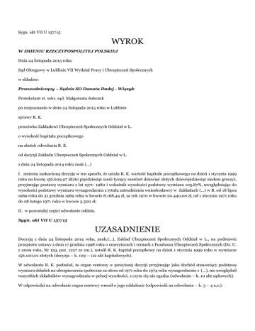 Sygn. akt VII U 137/15 WYROK W IMIENIU RZECZYPOSPOLITEJ POLSKIEJ Dnia 24 listopada 2015 roku. Sąd Okręgowy w Lublinie VII Wydział Pracy i Ubezpieczeń Społecznych w składzie: Przewodniczący – Sędzia SO Danuta Dadej - Więsyk Protokolant st. sekr. sąd. Małgorzata Sobczuk po rozpoznaniu w dniu 24 listopada 2015 roku w Lublinie sprawy R. K. przeciwko Zakładowi Ubezpieczeń Społecznych Oddział w L. o wysokość kapitału początkowego na skutek odwołania R. K. od decyzji Zakładu Ubezpieczeń Społecznych Oddział w L. z dnia 24 listopada 2014 roku znak (...) I. zmienia zaskarżoną decyzję w ten sposób, że ustala R. K. wartość kapitału początkowego na dzień 1 stycznia 1999 roku na kwotę 156.609,97 zł(sto pięćdziesiąt sześć tysięcy sześćset dziewięć złotych dziewięćdziesiąt siedem groszy), przyjmując postawę wymiaru z lat 1971- 1980 i wskaźnik wysokości podstawy wymiaru 105,87%, uwzględniając do wysokości podstawy wymiaru wynagrodzenia z tytułu zatrudnienia wnioskodawcy w Zakładach (...) w B. od 18 lipca 1969 roku do 31 grudnia 1969 roku w kwocie 8.168,44 zł, za rok 1970 w kwocie 20.440,00 zł, od 1 stycznia 1971 roku do 28 lutego 1971 roku w kwocie 3.500 zł; II. w pozostałej części odwołanie oddala. Sygn. akt VII U 137/15 UZASADNIENIE Decyzją z dnia 24 listopada 2014 roku, znak:(...), Zakład Ubezpieczeń Społecznych Oddział w L., na podstawie przepisów ustawy z dnia 17 grudnia 1998 roku o emeryturach i rentach z Funduszu Ubezpieczeń Społecznych (Dz. U. z 2009 roku, Nr 153, poz. 1227 ze zm.), ustalił R. K. kapitał początkowy na dzień 1 stycznia 1999 roku w wymiarze 156.100,01 złotych (decyzja – k. 109 – 112 akt kapitałowych). W odwołaniu R. K. podniósł, że organ rentowy w powyższej decyzji przyjmując jako dochód stanowiący podstawę wymiaru składek na ubezpieczenia społeczne za okres od 1971 roku do 1974 roku wynagrodzenie z (...), nie uwzględnił wszystkich składników wynagrodzenia w pełnej wysokości, z czym się nie zgadza (odwołanie – k. 10 akt sądowych). W odpowiedzi na odwołanie organ rentowy wnosił o jego oddalenie (odpowiedź na odwołanie – k. 3 – 4 a.s.). Na posiedzeniu w dniu 2 września 2015 roku R. K. wnosiło u uwzględnienie przy ustalaniu wysokości kapitału początkowego wynagrodzenia za okres od dnia 18 lipca 1969 roku do dnia 28 lutego 1970 roku według stawki godzinowej 70 złotych wynikającej z umowy o pracę oraz premii w wysokości 30 %, za okres od dnia 1 marca 1970 roku do dnia 1 marca 1971 roku według stawki wynagrodzenia zasadniczego wynikającej z umowy o pracę oraz za okres od dnia 1 kwietnia 1971 roku do dnia 10 stycznia 1976 roku przy uwzględnieniu wynagrodzenia otrzymywanego przez H. D. i M. O. (1) z uwagi na nie uwzględnienie przez Zakład wypłacanej w tym okresie premii oraz dodatku z tytułu pracy w warunkach szkodliwych (protokół – k. 37v. – 38, 39 a.s.). Sąd Okręgowy ustalił, co następuje: W okresie od dnia 18 lipca 1969 roku do dnia 10 stycznia 1976 roku R. K. był zatrudniony w Zakładach (...) w B.. W zaskarżonej decyzji do obliczenia wskaźnika wysokości podstawy wymiaru kapitału początkowego za okres od dnia 18 lipca 1969 roku do dnia 28 lutego 1971 roku organ rentowy przyjął wynagrodzenie minimalne pracowników. Natomiast za okres od dnia 1 marca 1973 roku do dnia 10 stycznia 1976 roku Zakład przyjął we wskazanym zakresie wynagrodzenie ubezpieczonego ustalone w oparciu o przedłożone angaże. Do ustalenia wartości kapitału początkowego na dzień 1 stycznia 1999 roku w wymiarze 156.100,01 złotych Zakład przyjął podstawę wymiaru kapitału początkowego w kwocie 1.286,09 złotych oraz wskaźnik wysokości podstawy wymiaru z lat 1971 – 1980 o wartości 105,34 % (okoliczności bezsporne). Z tytułu zatrudnienia w Zakładach (...) w B. w pełnym wymiarze czasu pracy na stanowisku robotnika transportowego w okresie od dnia 18 lipca 1969 roku do dnia 28 lutego 1970 roku ubezpieczonemu przysługiwało wynagrodzenie według stawki godzinowej w wysokości 7,10 złotych za godzinę oraz 50 złotych deputatu węglowego. Natomiast w okresie od dnia 1 marca 1970 roku do dnia 28 lutego 1971 roku ubezpieczonemu jako stażyście zatrudnionemu w ramach wstępnego stażu pracy do wykonywania pracy na stanowisku mistrza farbiarni przysługiwało wynagrodzenie zasadnicze w wysokości 1.700 złotych miesięcznie. Przy uwzględnieniu wskazanych składników wynagrodzenia, ich wysokości oraz wymiaru zatrudnienia ubezpieczony w okresie od dnia 18 lipca 1969 roku do dnia 31 grudnia 1969 roku osiągnął wynagrodzenie w wysokości 8.168,44 złotych, w okresie od dnia 1 stycznia 1970 roku do dnia 31 grudnia 1970 roku w wysokości 20.440,00 złotych a w okresie od dnia 1 stycznia 1971 roku do dnia 28 lutego 1971 roku w wysokości 3.500,00 złotych. Przy uwzględnieniu powyższych kwot wynagrodzenia w podstawie wymiaru kapitału początkowego wskaźnik wysokości podstawy wymiaru kapitału początkowego z okresu od 1971 roku do 1980 roku wyniósł 105,87 %, a wartość kapitału początkowego na dzień 1 stycznia 1999 roku wyniosła 156.609,97 złotych. W okresie objętym sporem osoby zatrudnione w Zakładach (...) w B. na stanowiskach mistrzów były uprawnione do premii regulaminowych, których wypłata i wysokość zależała od realizacji zadań produkcyjnych w zakresie jakości i ilości. Co do zasady wysokość premii regulaminowej mistrzów była zbliżona ale jednocześnie istniały możliwości jej różnicowania. (świadectwo pracy – k. 5 – 6 a.k.; umowa o pracę z dnia 18 lipca 1969 roku – k. 7 a.k.; umowa wstępnego stażu pracy z dnia 1 marca 1970 roku – k. 35 – 36 a.s., pismo Zakładu – k. 44 a.s.; wykaz wprowadzonych danych ubezpieczonego – k. 46 – 47v. a.s.; zeznania ubezpieczonego – k. 38, 39, 39v. a.s.; zeznania świadka M. O. (1) – k. 38v. – 39 a.s.; zeznania świadka H. D. – k. 39 a.s.) Stan faktyczny Sąd