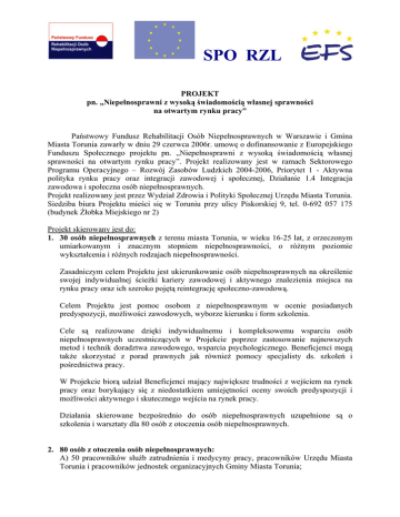 SPO RZL PROJEKT pn. „Niepełnosprawni z wysoką świadomością własnej sprawności na otwartym rynku pracy” Państwowy Fundusz Rehabilitacji Osób Niepełnosprawnych w Warszawie i Gmina Miasta Torunia zawarły w dniu 29 czerwca 2006r. umowę o dofinansowanie z Europejskiego Funduszu Społecznego projektu pn. „Niepełnosprawni z wysoką świadomością własnej sprawności na otwartym rynku pracy”. Projekt realizowany jest w ramach Sektorowego Programu Operacyjnego – Rozwój Zasobów Ludzkich 2004-2006, Priorytet 1 - Aktywna polityka rynku pracy oraz integracji zawodowej i społecznej, Działanie 1.4 Integracja zawodowa i społeczna osób niepełnosprawnych. Projekt realizowany jest przez Wydział Zdrowia i Polityki Społecznej Urzędu Miasta Torunia. Siedziba biura Projektu mieści się w Toruniu przy ulicy Piskorskiej 9, tel. 0-692 057 175 (budynek Żłobka Miejskiego nr 2) Projekt skierowany jest do: 1. 30 osób niepełnosprawnych z terenu miasta Torunia, w wieku 16-25 lat, z orzeczonym umiarkowanym i znacznym stopniem niepełnosprawności, o różnym poziomie wykształcenia i różnych rodzajach niepełnosprawności. Zasadniczym celem Projektu jest ukierunkowanie osób niepełnosprawnych na określenie swojej indywidualnej ścieżki kariery zawodowej i aktywnego znalezienia miejsca na rynku pracy oraz ich szeroko pojętą reintegrację społeczno-zawodową. Celem Projektu jest pomoc osobom z niepełnosprawnym w ocenie posiadanych predyspozycji, możliwości zawodowych, wyborze kierunku i form szkolenia. Cele są realizowane dzięki indywidualnemu i kompleksowemu wsparciu osób niepełnosprawnych uczestniczących w Projekcie poprzez zastosowanie najnowszych metod i technik doradztwa zawodowego, wsparcia psychologicznego. Beneficjenci mogą także skorzystać z porad prawnych jak również pomocy specjalisty ds. szkoleń i pośrednictwa pracy. W Projekcie biorą udział Beneficjenci mający największe trudności z wejściem na rynek pracy oraz borykający się z niedostatkiem umiejętności oceny swoich predyspozycji i możliwości aktywnego i skutecznego wejścia na rynek pracy. Działania skierowane bezpośrednio do osób niepełnosprawnych uzupełnione są o szkolenia i warsztaty dla 80 osób z otoczenia osób niepełnosprawnych. 2. 80 osób z otoczenia osób niepełnosprawnych: A) 50 pracowników służb zatrudnienia i medycyny pracy, pracowników Urzędu Miasta Torunia i pracowników jednostek organizacyjnych Gminy Miasta Torunia; SPO RZL B) 30 pracodawców i potencjalnych pracodawców osób niepełnosprawnych. Celem tegoż działania jest stworzenie atmosfery życzliwości i zrozumienia potrzeb osób niepełnosprawnych stających wobec wyzwań rynku pracy poprzez podniesienie umiejętności w zakresie pracy z niepełnosprawnym klientem i jego rodziną, rozumienia potrzeb osób niepełnosprawnych a także organizowania stanowisk i warunków pracy dla niepełnosprawnych pracobiorców. Projekt realizowany jest w okresie od 1 sierpnia 2006 r. do 31 lipca 2007r. Wartość projektu 251.540,00 zł, w 100% pokrywana jest ze środków EFS i PFRON. 1. PFRON 28,20% 2. EFS 71,80% DZIAŁANIA ZREALIZOWANE: I. Szkolenie dla pracowników: W dniach 27-29 listopada 2006 r., w Sanatorium Uzdrowiskowym „Pod Tężniami” w Ciechocinku, zorganizowane zostało szkolenie dla pracowników Urzędu Miasta Torunia, jednostek organizacyjnych samorządu oraz pracowników służb zatrudnienia i medycyny pracy pn: „Prawne, medyczne i doradcze aspekty zatrudnienia i rehabilitacji osób niepełnosprawnych w warunkach gospodarki rynkowej”. Szkolenie finansowane było w całości ze środków EFS i PFRON w ramach Projektu: „Niepełnosprawni z wysoką świadomością własnej sprawności na otwartym rynku pracy”. Celem szkolenia było: - zwiększenie zainteresowania i zrozumienia problemów oraz uwarunkowań aktywizacji zawodowej i społecznej osób niepełnosprawnych wśród kadry urzędów i służb, - podniesienie umiejętności publicznych służb zatrudnienia, służb medycyny pracy oraz kadry zarządzającej i pracowników jednostek samorządu terytorialnego w zakresie współpracy z niepełnosprawnym klientem, - podniesienie aktywności publicznych służb zatrudnienia, służb medycyny pracy oraz pracowników jednostek samorządu terytorialnego w zakresie podejmowania i realizacji programów oraz zadań z zakresu aktywizacji zawodowej osób niepełnosprawnych na SPO RZL otwartym rynku pracy oraz z zakresu podejmowania aktywności społecznej osób niepełnosprawnych. Udział w szkoleniu był bezpłatny. II. Szkolenie dla pracodawców: W dniach 25-27 stycznia 2007. w Sanatorium Uzdrowiskowym „Pod Tężniami” w Ciechocinku, zorganizowane zostało szkolenie dla pracodawców, zatrudniających lub zamierzających zatrudnić osoby niepełnosprawne pn: „Prawne, psychologiczno – doradcze i medyczne aspekty zatrudnienia osób niepełnosprawnych w warunkach gospodarki rynkowej”. Szkolenie finansowane było w całości ze środków EFS i PFRON, mieszczących się w kategorii pomocy de minimis dla przedsiębiorstw, w ramach Projektu: „Niepełnosprawni z wysoką świadomością własnej sprawności na otwartym rynku pracy”. Celem szkolenia było: - zwiększenie zainteresowania i rozumienia problemów oraz uwarunkowań aktywizacji zawodowej i społecznej osób niepełnosprawnych wśród pracodawców i ich otoczenia, - podniesienie umiejętności, zwłaszcza kadry zarządzającej, w zakresie współpracy z niepełnosprawnym pracownikiem, - rozwijanie świadomości pracodawców, co do ich uprawnień w zakresie zatrudniania osób niepełnosprawnych, w tym pozyskiwania funduszy na utworzenie stanowisk pracy dla osób z różnego typu niepełnosprawnościami i ułatwianie im wejścia na rynek pracy. Udział w szkoleniu był bezpłatny. III. Informator o ulgach i uprawnieniach osób niepełnosprawnych W ramach realizowanego Projektu został opracowany i wydany informator o ulgach i uprawnien
