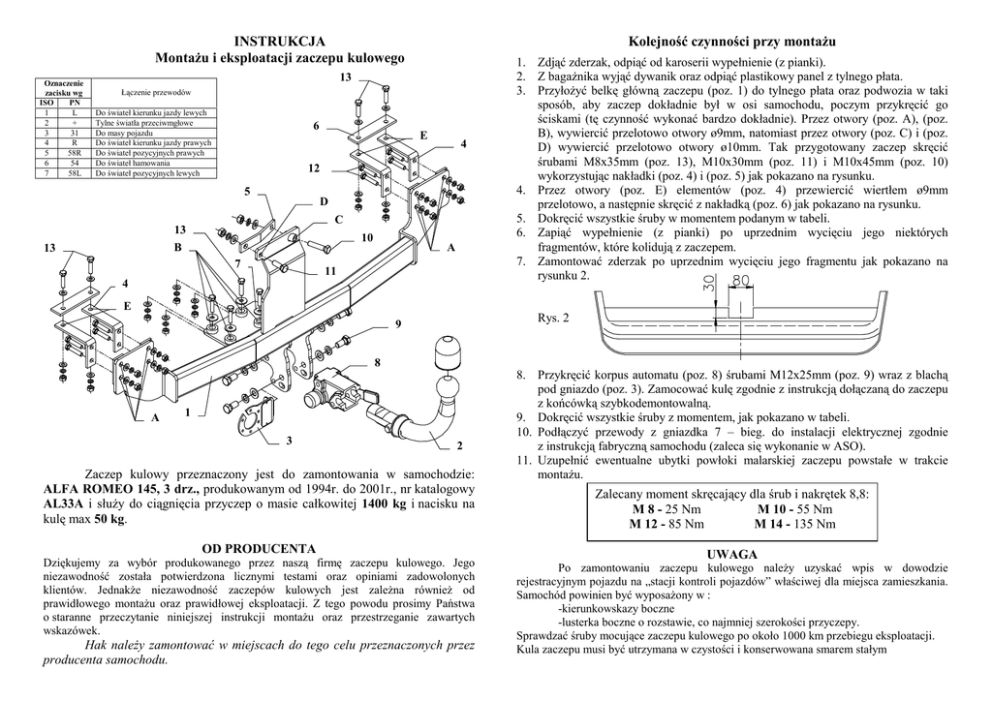 INSTRUKCJA MontaŜu i eksploatacji zaczepu kulowego Oznaczenie zacisku wg ISO PN 1 L 2 + 3 31 4 R 5 58R 6 54 7 58L Kolejność czynności przy montaŜu 13 Łączenie przewodów Do świateł kierunku jazdy lewych Tylne światła przeciwmgłowe Do masy pojazdu Do świateł kierunku jazdy prawych Do świateł pozycyjnych prawych Do świateł hamowania Do świateł pozycyjnych lewych 6 4 12 5 D C 13 B 13 E 10 7 A 11 4 1. Zdjąć zderzak, odpiąć od karoserii wypełnienie (z pianki). 2. Z bagaŜnika wyjąć dywanik oraz odpiąć plastikowy panel z tylnego płata. 3. PrzyłoŜyć belkę główną zaczepu (poz. 1) do tylnego płata oraz podwozia w taki sposób, aby zaczep dokładnie był w osi samochodu, poczym przykręcić go ściskami (tę czynność wykonać bardzo dokładnie). Przez otwory (poz. A), (poz. B), wywiercić przelotowo otwory ø9mm, natomiast przez otwory (poz. C) i (poz. D) wywiercić przelotowo otwory ø10mm. Tak przygotowany zaczep skręcić śrubami M8x35mm (poz. 13), M10x30mm (poz. 11) i M10x45mm (poz. 10) wykorzystując nakładki (poz. 4) i (poz. 5) jak pokazano na rysunku. 4. Przez otwory (poz. E) elementów (poz. 4) przewiercić wiertłem ø9mm przelotowo, a następnie skręcić z nakładką (poz. 6) jak pokazano na rysunku. 5. Dokręcić wszystkie śruby w momentem podanym w tabeli. 6. Zapiąć wypełnienie (z pianki) po uprzednim wycięciu jego niektórych fragmentów, które kolidują z zaczepem. 7. Zamontować zderzak po uprzednim wycięciu jego fragmentu jak pokazano na rysunku 2. E Rys. 2 9 8 A 1 3 2 Zaczep kulowy przeznaczony jest do zamontowania w samochodzie: ALFA ROMEO 145, 3 drz., produkowanym od 1994r. do 2001r., nr katalogowy AL33A i słuŜy do ciągnięcia przyczep o masie całkowitej 1400 kg i nacisku na kulę max 50 kg. OD PRODUCENTA Dziękujemy za wybór produkowanego przez naszą firmę zaczepu kulowego. Jego niezawodność została potwierdzona licznymi testami oraz opiniami zadowolonych klientów. JednakŜe niezawodność zaczepów kulowych jest zaleŜna równieŜ od prawidłowego montaŜu oraz prawidłowej eksploatacji. Z tego powodu prosimy Państwa o staranne przeczytanie niniejszej instrukcji montaŜu oraz przestrzeganie zawartych wskazówek. Hak naleŜy zamontować w miejscach do tego celu przeznaczonych przez producenta samochodu. 8. Przykręcić korpus automatu (poz. 8) śrubami M12x25mm (poz. 9) wraz z blachą pod gniazdo (poz. 3). Zamocować kulę zgodnie z instrukcją dołączaną do zaczepu z końcówką szybkodemontowalną. 9. Dokręcić wszystkie śruby z momentem, jak pokazano w tabeli. 10. Podłączyć przewody z gniazdka 7 – bieg. do instalacji elektrycznej zgodnie z instrukcją fabryczną samochodu (zaleca się wykonanie w ASO). 11. Uzupełnić ewentualne ubytki powłoki malarskiej zaczepu powstałe w trakcie montaŜu. Zalecany moment skręcający dla śrub i nakrętek 8,8: M 8 - 25 Nm M 10 - 55 Nm M 12 - 85 Nm M 14 - 135 Nm UWAGA Po zamontowaniu zaczepu kulowego naleŜy uzyskać wpis w dowodzie rejestracyjnym pojazdu na „stacji kontroli pojazdów” właściwej dla miejsca zamieszkania. Samochód powinien być wyposaŜony w : -kierunkowskazy boczne -lusterka boczne o rozstawie, co najmniej szerokości przyczepy. Sprawdzać śruby mocujące zaczepu kulowego po około 1000 km przebiegu eksploatacji. Kula zaczepu musi być utrzymana w czystości i konserwowana smarem stałym PPUH AUTO-HAK S. J. WyposaŜenie zaczepu: Produkcja Zaczepów Kulowych Henryk & Zbigniew Nejman 76-200 SŁUPSK ul. Słoneczna 16K tel/fax (059) 8-414-414; 8-414-413 E-mail: [email protected] www.autohak.com.pl Zaczep kulowy bez wyposaŜenia elektrycznego Klasa: A50-X Nr kat. AL33A Przeznaczony do zamontowania w samochodzie: Producent: ALFA ROMEO Model: 145 Typ: 3 drz. produkowanym od 1994r. do 2001r. KARTA GWARANCYJNA Dane techniczne: Wartość siły D : 7,73 kN maksymalna masa przyczepy: 1400 kg maksymalny nacisk na kulę: 50 kg Numer homologacji zgodnie z dyrektywą 94/20/WE: e20*94/20*0386*00 Producent udziela gwarancji niniejszą kartą gwarancyjną na okres 24 miesięcy licząc od dnia zakupu zaczepu kulowego do samochodu: ALFA ROMEO 145, 3 drz. produkowanego od 1994r. do 2001r. Data produkcji .............................. Data zakupu.................................. Zakres gwarancji obejmuje wyłącznie wady jakościowe wynikające z winy producenta. Gwarancja nie obejmuje natomiast uszkodzeń zawinionych przez nabywcę, wynikających z niewłaściwego montaŜu, uŜytkowania lub konserwacji, uszkodzeń mechanicznych, normalnego zuŜycia podczas eksploatacji itp. Gwarancja udzielona na zakupiony towar nie wyłącza, nie ogranicza ani nie zawiesza uprawnień kupującego wynikających z niezgodności towaru z umową. Reklamacje naleŜy zgłaszać w punkcie sprzedaŜy, składając jednocześnie kartę gwarancyjną. Usunięcie "wady" następuje po stwierdzeniu przez punkt sprzedaŜy wspólnie z producentem słuszności złoŜonej reklamacji. Reklamacja powinna być załatwiona w ciągu czternastu dni od dnia uznania reklamacji. Karta gwarancyjna jest niewaŜna jeŜeli nie jest wypełniona i podpisana. Data zgłoszenia reklamacji: ................................................................... INFORMACJA WSTĘPNA Zaczep kulowy jest skonstruowany zgodnie z zasadami bezpieczeństwa ruchu drogowego. Zaczep kulowy jest elementem wpływającym na bezpieczeństwo jazdy i moŜe zostać zainstalowany wyłącznie przez personel wyspecjalizowany. Niedopuszczalne jest dokonywanie jakichkolwiek zmian w konstrukcji zaczepu. Powoduje to wygaśniecie dopuszczenia do stosowania. W przypadku obecności masy izolacyjnej lub osłony podwozia w miejscu przylegania zaczepu, naleŜy ją usunąć. Nieosłonięte miejsca karoserii oraz wywiercone otwory naleŜy pomalować farbą antykorozyjną. Informacjami wiąŜącymi odnośnie wartości obciąŜeń są dane podawane przez producenta samochodu, względnie wartości maksymalnej masy przyczepy oraz maksymalnego nacisku na kulę,