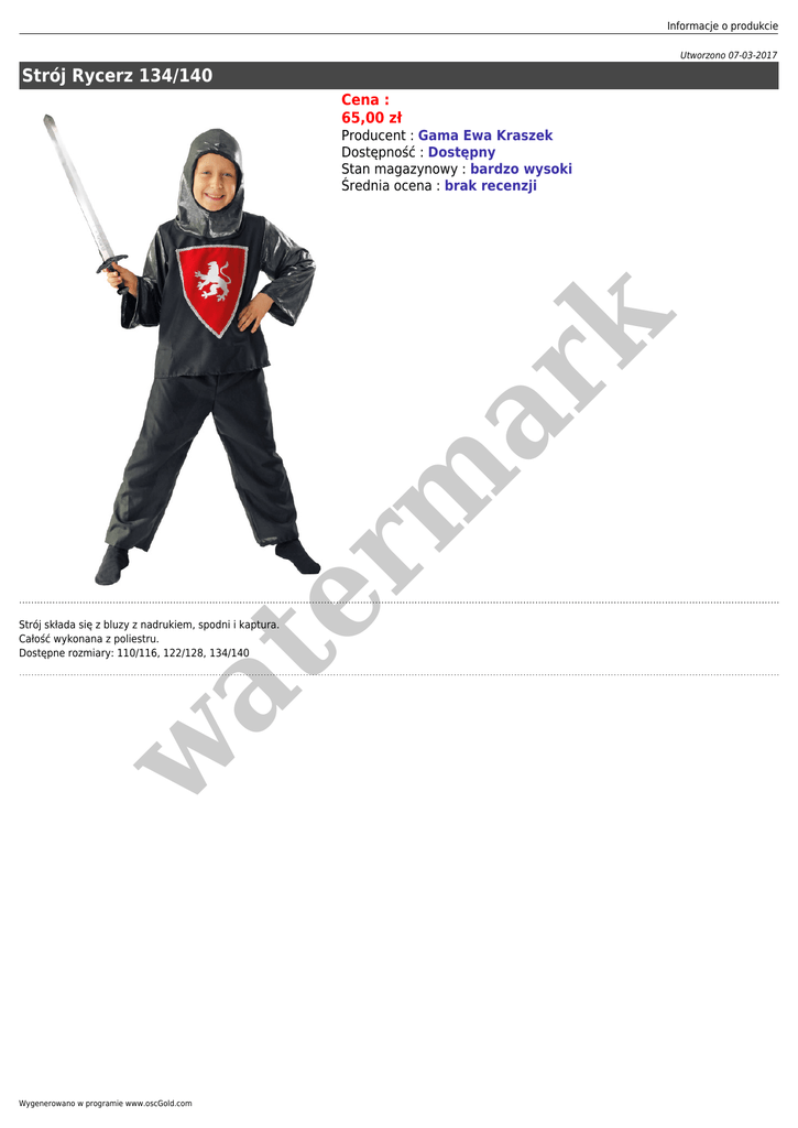 Informacje o produkcie Utworzono 07-03-2017 Strój Rycerz 134/140 Cena : 65,00 zł er m ar k Producent : Gama Ewa Kraszek Dostępność : Dostępny Stan magazynowy : bardzo wysoki Średnia ocena : brak recenzji w at Strój składa się z bluzy z nadrukiem, spodni i kaptura. Całość wykonana z poliestru. Dostępne rozmiary: 110/116, 122/128, 134/140 Wygenerowano w programie www.oscGold.com