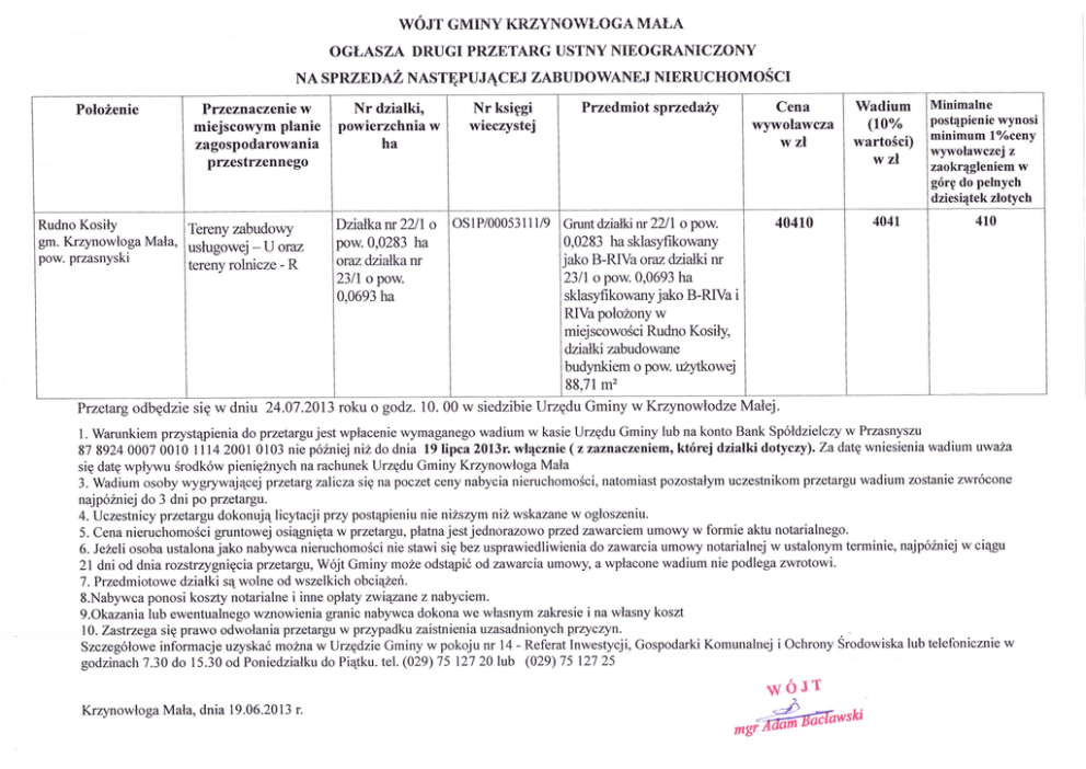 woJT GMINY KRZYNowŁoGA MAŁA oGŁAsZA DRUGI PRZETARG