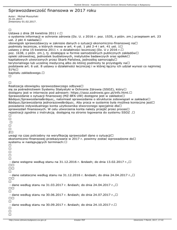 Wydział Zdrowia - Kujawsko-Pomorskie Centrum Zdrowia Publicznego w Bydgoszczy Sprawozdawczość finansowa w 2017 roku Autor: Michał Muszyński 31.01.2017. Zmieniony 01.02.2017. Ustawa z dnia 28 kwietnia 2011 r. o systemie informacji w ochronie zdrowia (Dz. U. z 2016 r. poz. 1535, z późn. zm.) przepisem art. 23 ust. 2 pkt 4 nakłada obowiązek sprawozdawczy w zakresie danych o sytuacji ekonomiczno-finansowej na podmioty lecznicze, o których mowa w art. 4 ust. 1 pkt 2-4 i art. 41 ust. 1 ustawy z dnia 15 kwietnia 2011 r. o działalności leczniczej (Dz. U z 2016 r. poz. 1638, z późn. zm.), tj. działające w formie samodzielnych publicznych zakładów opieki zdrowotnej, jednostek budżetowych, instytutów badawczych oraz spółek kapitałowych utworzonych przez Skarb Państwa, jednostkę samorządu terytorialnego lub uczelnię medyczną albo do której podmioty te przystąpiły na podstawie art. 6 ust. 8 ustawy o działalności leczniczej i w której łączny ich udział wynosi co najmniej 51% kapitału zakładowego. Realizacja obowiązku sprawozdawczego odbywa się za pośrednictwem Systemu Statystyki w Ochronie Zdrowia (SSOZ), który dostępny jest w internecie pod adresem: https://ssoz.ezdrowie.gov.pl/info.html. Sprawozdanie o sytuacji finansowej (MZ-BFA UW) dostępne jest w zakładce „Sprawozdania”, natomiast sprawozdanie o strukturze zobowiązań w zakładce „Sprawozdania jednorazowe”. Aby praca w systemie była możliwa konieczne jest posiadanie indywidualnego konta użytkownika stworzonego specjalnie dla sprawozdań finansowych. W celu utworzenia konta należy przejść przez proces rejestracji zgodnie z instrukcją dostępną na stronie logowania do systemu SSOZ . Z uwagi na czas potrzebny na weryfikację sprawozdań dane o sytuacji ekonomiczno-finansowej przekazywane w 2017 r. powinny zostać wprowadzone do systemu w następujących terminach: - dane wstępne według stanu na 31.12.2016 r. – do dnia 13.02.2017 r., - dane ostateczne według stanu na 31.12.2016 r. – do dnia 24.04.2017 r., - dane według stanu na 31.03.2017 r. – do dnia 24.04.2017 r., - dane według stanu na 30.06.2017 r. – do dnia 24.07.2017 r., - dane według stanu na 30.09.2017 r. – do dnia 24.10.2017 r. http://www.zdrowie.bydgoszcz.uw.gov.pl Kreator PDF Utworzono 7 March, 2017, 17:42 Wydział Zdrowia - Kujawsko-Pomorskie Centrum Zdrowia Publicznego w Bydgoszczy Osoba do kontaktu: Waldemar Doliński tel.: 52 349-7437 e-mail: [email protected] http://www.zdrowie.bydgoszcz.uw.gov.pl Kreator PDF Utworzono 7 March, 2017, 17:42