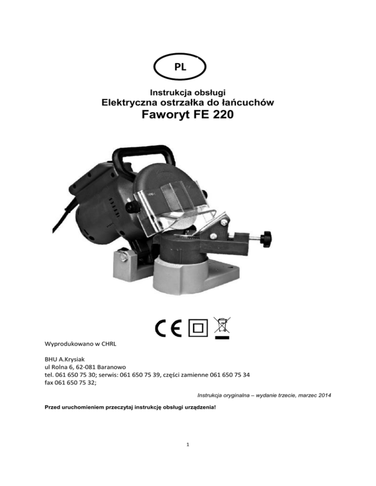 PL Instrukcja obsługi Elektryczna ostrzałka do łańcuchów Faworyt FE 220 Wyprodukowano w CHRL BHU A.Krysiak ul Rolna 6, 62-081 Baranowo tel. 061 650 75 30; serwis: 061 650 75 39, części zamienne 061 650 75 34 fax 061 650 75 32; Instrukcja oryginalna – wydanie trzecie, marzec 2014 Przed uruchomieniem przeczytaj instrukcję obsługi urządzenia! 1 Spis treści Piktogramy .............................................................................................................................................. 5 Symbole w instrukcji obsługi ................................................................................................................... 5 Ogólne zasady bezpieczeństwa ............................................................................................................... 6 Bezpieczeństwo elektryczne ................................................................................................................... 6 Praca z urządzeniem ................................................................................................................................ 6 Opis działania .......................................................................................................................................... 8 Przeznaczenie .......................................................................................................................................... 8 Dane techniczne urządzenia .................................................................................................................... 8 Uruchamianie .......................................................................................................................................... 8 Zawartość opakowania............................................................................................................................ 9 Ustawianie ............................................................................................................................................... 9 Praca z urządzeniem ................................................................................................................................ 9 Włączanie i wyłączanie .......................................................................................................................... 10 Próba działania: ..................................................................................................................................... 10 Ustawianie osłony ochronnej (20)......................................................................................................... 10 Ostrzenie łańcucha pilarki ..................................................................................................................... 10 Wskazówki dotyczące ostrzenia ............................................................................................................ 11 Konserwacja i oczyszczanie ................................................................................................................... 11 Oczyszczanie .......................................................................................................................................... 11 Wymiana tarczy ..................................................................................................................................... 12 Opis elementów ostrzałki ...................................................................................................................... 12 Ochrona środowiska .............................................................................................................................. 13 Części zamienne .................................................................................................................................... 13 Gwarancja.............................................................................................................................................. 13 Deklaracja zgodności WE....................................................................................................................... 13 2 UWAGA! Przy użytkowaniu narzędzi elektrycznych należy przestrzegać podanych w instrukcji podstawowych środków bezpieczeństwa, zabezpieczających przed porażeniem prądem elektrycznym, zranieniem i pożarem. Przed rozpoczęciem użytkowania urządzenia elektrycznego należy się zastosować do wszystkich tych zasad bezpieczeństwa; instrukcje użytkowania należy starannie przechowywać. Przekazuj tę instrukcję każdemu kolejnemu właścicielowi urządzenia, aby zawarte w niej informacje były zawsze dostępne dla osób używających urządzenie. 3 4 Piktogramy Przed pierwszym uruchomieniem urządzenia uważnie przeczytaj tę instrukcję obsługi. Niebezpieczeństwo porażenia prądem elektrycznym! Przed rozpoczęciem prac konserwacyjnych i napraw wyjmij wtyczkę z gniazdka. Niebezpieczeństwo zranienia przez obracające się narzędzie! Trzymaj dłonie w bezpiecznej odległości. Niebezpieczeństwo skaleczenia! Noś odporne na przecięcie rękawice. Niebezpieczeństwo zranienia! Noś osobiste wyposażenie ochronne, takie jak maska przeciwpyłowa, okulary ochronne, nauszniki i kask. Klasa zabezpieczenia II Maszyn elektrycznych nie należy wyrzucać razem z odpadami domowymi. Symbole w instrukcji obsługi Symbol niebezpieczeństwa z informacjami na temat ochrony osób i zapobiegania szkodom materialnym. 5 Znak nakazu (w miejscu wykrzyknika objaśnienie nakazu) z informacjami na temat zapobiegania szkodom. Znak informacyjny ze wskazówkami ułatwiającymi posługiwanie się urządzeniem. Ogólne zasady bezpieczeństwa Aby wykluczyć zranienia i szkody rzeczowe, przeczytaj poniższe zasady bezpieczeństwa: Bezpieczeństwo elektryczne • Uważaj, by napięcie sieciowe było zgodne z danymi znajdującymi się na tabliczce znamionowej. • Chroń urządzenie przed wodą i wilgocią. Urządzenie nie może być wilgotne ani 