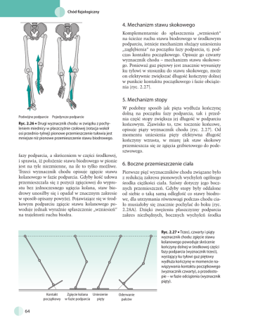 Chód fizjologiczny 4. Mechanizm stawu skokowego Komplementarnie do spłaszczenia „wzniesień” na ścieżce ruchu stawu biodrowego w środkowym podparciu, istnieje mechanizm służący uniesieniu „zagłębienia” na początku fazy podparcia, tj. podczas kontaktu początkowego. Opisuje go czwarty wyznacznik chodu – mechanizm stawu skokowego. Ponieważ guz piętowy jest znacznie wysunięty ku tyłowi w stosunku do stawu skokowego, może on efektywnie zwiększać długość kończyny dolnej w punkcie kontaktu początkowego i fazie obciążenia (ryc. 2.27). 5. Mechanizm stopy Podwójne podparcie Pojedyncze podparcie Ryc. 2.26 • Drugi wyznacznik chodu: w związku z pochyleniem miednicy w płaszczyźnie czołowej (rotacja wokół osi przednio-tylnej) pionowe przemieszczenie tułowia jest mniejsze niż pionowe przemieszczenie stawu biodrowego. fazy podparcia, a skróceniem w części środkowej, i sprawia, iż położenie stawu biodrowego w pionie jest na tyle niezmienne, na ile to tylko możliwe. Trzeci wyznacznik chodu opisuje zgięcie stawu kolanowego w fazie podparcia. Gdyby kość udowa przemieszczała się z pozycji zgięciowej do wyprostu bez jednoczesnego ugięcia kolana, staw biodrowy unosiłby się i opadał w znacznym zakresie w sposób opisany powyżej. Pojawiające się w środkowym podparciu zgięcie stawu kolanowego powoduje jednak wyraźnie spłaszczenie „wzniesień” na trajektorii ruchu biodra. W podobny sposób jak pięta wydłuża kończynę dolną na początku fazy podparcia, tak i przednia część stopy zwiększa jej długość w podparciu końcowym. Zjawisko to, tzw. toczenie końcowe, opisuje piąty wyznacznik chodu (ryc. 2.27). Od momentu uniesienia pięty efektywna długość kończyny wzrasta, w miarę jak staw skokowy przemieszcza się ze zgięcia grzbietowego do podeszwowego. 6. Boczne przemieszczenie ciała Pierwsze pięć wyznaczników chodu związane było z redukcją zakresu pionowych wychyleń ogólnego środka ciężkości ciała. Szósty dotyczy jego bocznych przemieszczeń. Gdyby stopy były oddalone od siebie o taką samą odległość co stawy biodrowe, dla utrzymania równowagi podczas chodu ciało musiałoby się znacznie pochylać do boku (ryc. 2.28A). Dzięki zwężeniu płaszczyzny podparcia zakres niezbędnych, bocznych wychyleń środka Ryc. 2.27 • Trzeci, czwarty i piąty wyznacznik chodu: zgięcie stawu kolanowego powoduje skrócenie kończyny dolnej w środkowej części fazy podparcia (wyznacznik trzeci), wystający ku tyłowi guz piętowy wydłuża kończynę w momencie nawiązywania kontaktu początkowego (wyznacznik czwarty), a przodostopie – w fazie odciążenia (wyznacznik piąty). Kontakt początkowy 64 Zgięcie kolana Uniesienie w fazie podparcia pięty Oderwanie palców
