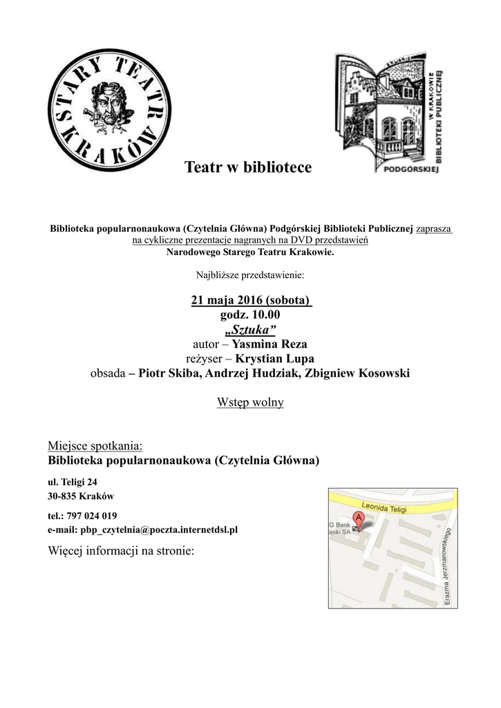 Teatr w bibliotece Biblioteka popularnonaukowa (Czytelnia Główna) Podgórskiej Biblioteki Publicznej zaprasza na cykliczne prezentacje nagranych na DVD przedstawień Narodowego Starego Teatru Krakowie. Najbliższe przedstawienie: 21 maja 2016 (sobota) godz. 10.00 „Sztuka” autor – Yasmina Reza reżyser – Krystian Lupa obsada – Piotr Skiba, Andrzej Hudziak, Zbigniew Kosowski Wstęp wolny Miejsce spotkania: Biblioteka popularnonaukowa (Czytelnia Główna) ul. Teligi 24 30-835 Kraków tel.: 797 024 019 e-mail: [email protected] Więcej informacji na stronie: