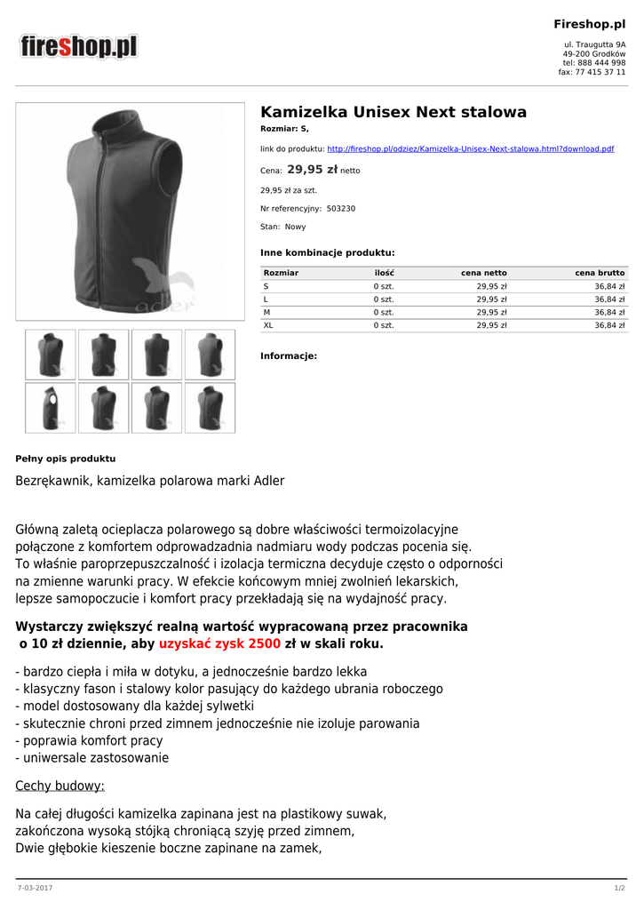Fireshop.pl ul. Traugutta 9A 49-200 Grodków tel: 888 444 998 fax: 77 415 37 11 Kamizelka Unisex Next stalowa Rozmiar: S, link do produktu: http://fireshop.pl/odziez/Kamizelka-Unisex-Next-stalowa.html?download.pdf Cena: 29,95 zł netto 29,95 zł za szt. Nr referencyjny: 503230 Stan: Nowy Inne kombinacje produktu: Rozmiar ilość cena netto cena brutto S 0 szt. 29,95 zł 36,84 zł L 0 szt. 29,95 zł 36,84 zł M 0 szt. 29,95 zł 36,84 zł XL 0 szt. 29,95 zł 36,84 zł Informacje: Pełny opis produktu Bezrękawnik, kamizelka polarowa marki Adler Główną zaletą ocieplacza polarowego są dobre właściwości termoizolacyjne połączone z komfortem odprowadzadnia nadmiaru wody podczas pocenia się. To właśnie paroprzepuszczalność i izolacja termiczna decyduje często o odporności na zmienne warunki pracy. W efekcie końcowym mniej zwolnień lekarskich, lepsze samopoczucie i komfort pracy przekładają się na wydajność pracy. Wystarczy zwiększyć realną wartość wypracowaną przez pracownika o 10 zł dziennie, aby uzyskać zysk 2500 zł w skali roku. - bardzo ciepła i miła w dotyku, a jednocześnie bardzo lekka - klasyczny fason i stalowy kolor pasujący do każdego ubrania roboczego - model dostosowany dla każdej sylwetki - skutecznie chroni przed zimnem jednocześnie nie izoluje parowania - poprawia komfort pracy - uniwersale zastosowanie Cechy budowy: Na całej długości kamizelka zapinana jest na plastikowy suwak, zakończona wysoką stójką chroniącą szyję przed zimnem, Dwie głębokie kieszenie boczne zapinane na zamek, 7-03-2017 1/2 zapobiegają zgubieniu wypadnięciu kluczy, dokumentów czy komórki. Wewnątrz dwie dodatkowe kieszenie np. na chusteczkę, rękawice, notatki itp. U dołu ocieplacza jest gumowa linka ze stoperem pozwalająca na dopasowanie do ciała, aby chronić plecy przed przewianiem. Zewnętrzna strona materiału kamizelki to antypiling, który się nie mechaci. Specyfikacja: 280g/m2, Polar, 100% poliester Zastosowanie: Polecamy do noszenia pod kurtkę lub na odzież wierzchnią, co sprawdza się przy pracy zarówno na zewnątrz jak i wewnątrz budynku. W okresie wiosna - jesień może służyć do noszenia np. na koszulkę. Praktycznie sprawdza się zarówno w biurze jak i w magazynie czy pracy w terenie. Możliwe zamówienie nadruku, haftu. Uwaga PROMOCJA! Przy zakupie 10 sztuk jedna kamizelka gratis. Oferta ważna do wyczerpania zapasów. Zamów już teraz! O szczegóły zapytaj doradcy tel. 888444998 lub email: biuro@fireshop.pl 7-03-2017 2/2