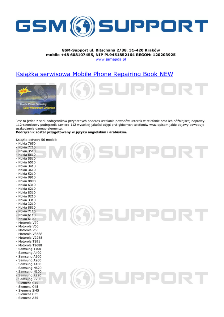 GSM-Support ul. Bitschana 2/38, 31-420 Kraków mobile +48 608107455, NIP PL9451852164 REGON: 120203925 www.jamepda.pl Książka serwisowa Mobile Phone Repairing Book NEW Jest to jedna z serii podręczników przydatnych podczas ustalania powodów usterek w telefonie oraz ich późniejszej naprawy. 112-stronicowy podręcznik zawiera 112 wysokiej jakości zdjęć płyt głównych telefonów wraz opisem jakie objawy powoduje uszkodzenie danego elementu. Podręcznik został przygotowany w języku angielskim i arabiskim. Książka dotyczy 56 modeli: - Nokia 7650 - Nokia 7210 - Nokia 3510 - Nokia 6610 - Nokia 5510 - Nokia 6510 - Nokia 3410 - Nokia 3610 - Nokia 5210 - Nokia 8910 - Nokia 8890 - Nokia 6310 - Nokia 6210 - Nokia 8310 - Nokia 8210 - Nokia 3310 - Nokia 3210 - Nokia 8810 - Nokia 7110 - Nokia 6110 - Nokia 6100 - Motorola V70 - Motorola V66 - Motorola V60 - Motorola V3688 - Motorola V2288 - Motorola T191 - Motorola T2688 - Samsung T100 - Samsung A400 - Samsung A300 - Samsung A200 - Samsung A100 - Samsung N620 - Samsung N100 - Samsung R220 - Samsung R200 - Siemens S45 - Siemens C45 - Siemens Sl45 - Siemens C35 - Siemens A35 - Siemens C25 Ericsson T68 Ericsson T65 Ericsson T39 Ericsson T29 Ericsson T28 Ericsson T10 Alcatel 310 Alcatel OT-700 Alcatel OT-500 Alcatel 302 Alcatel 221 Alcatel 206 Panasonic GD92 ©2012 www.jamepda.pl Opis ten nie stanowi oferty w rozumieniu Kodeksu Cywilnego. GSM-Support zastrzega sobie prawo do możliwych błędów w opisie produktu. Prosimy o weryfikację z Państwa strony, a w razie wątpliwości o kontakt. GSM-Support ul. Bitschana 2/38 31-420 Kraków POLSKA tel. 608107455 e-mail: [email protected] Powered by TCPDF (www.tcpdf.org)