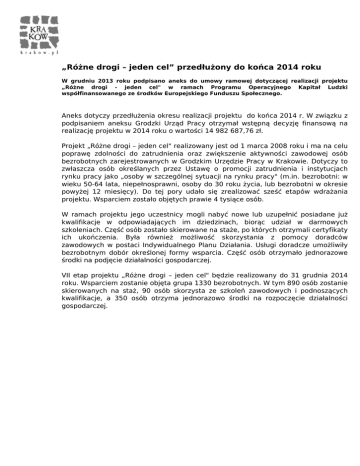 „Różne drogi – jeden cel” przedłużony do końca 2014 roku W grudniu 2013 roku podpisano aneks do umowy ramowej dotyczącej realizacji projektu „Różne drogi - jeden cel" w ramach Programu Operacyjnego Kapitał Ludzki współfinansowanego ze środków Europejskiego Funduszu Społecznego. Aneks dotyczy przedłużenia okresu realizacji projektu do końca 2014 r. W związku z podpisaniem aneksu Grodzki Urząd Pracy otrzymał wstępną decyzję finansową na realizację projektu w 2014 roku o wartości 14 982 687,76 zł. Projekt „Różne drogi – jeden cel" realizowany jest od 1 marca 2008 roku i ma na celu poprawę zdolności do zatrudnienia oraz zwiększenie aktywności zawodowej osób bezrobotnych zarejestrowanych w Grodzkim Urzędzie Pracy w Krakowie. Dotyczy to zwłaszcza osób określanych przez Ustawę o promocji zatrudnienia i instytucjach rynku pracy jako „osoby w szczególnej sytuacji na rynku pracy" (m.in. bezrobotni: w wieku 50-64 lata, niepełnosprawni, osoby do 30 roku życia, lub bezrobotni w okresie powyżej 12 miesięcy). Do tej pory udało się zrealizować sześć etapów wdrażania projektu. Wsparciem zostało objętych prawie 4 tysiące osób. W ramach projektu jego uczestnicy mogli nabyć nowe lub uzupełnić posiadane już kwalifikacje w odpowiadających im dziedzinach, biorąc udział w darmowych szkoleniach. Część osób zostało skierowane na staże, po których otrzymali certyfikaty ich ukończenia. Była również możliwość skorzystania z pomocy doradców zawodowych w postaci Indywidualnego Planu Działania. Usługi doradcze umożliwiły bezrobotnym dobór określonej formy wsparcia. Część osób otrzymało jednorazowe środki na podjęcie działalności gospodarczej. VII etap projektu „Różne drogi – jeden cel" będzie realizowany do 31 grudnia 2014 roku. Wsparciem zostanie objęta grupa 1330 bezrobotnych. W tym 890 osób zostanie skierowanych na staż, 90 osób skorzysta ze szkoleń zawodowych i podnoszących kwalifikacje, a 350 osób otrzyma jednorazowo środki na rozpoczęcie działalności gospodarczej. Powered by TCPDF (www.tcpdf.org)