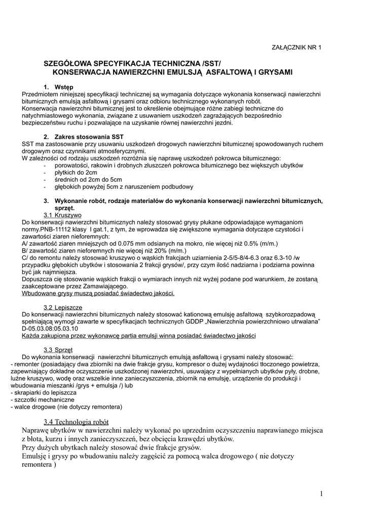 ZAŁĄCZNIK NR 1 SZEGÓŁOWA SPECYFIKACJA TECHNICZNA /SST/ KONSERWACJA NAWIERZCHNI EMULSJĄ ASFALTOWĄ I GRYSAMI 1. Wstęp Przedmiotem niniejszej specyfikacji technicznej są wymagania dotyczące wykonania konserwacji nawierzchni bitumicznych emulsją asfaltową i grysami oraz odbioru technicznego wykonanych robót. Konserwacja nawierzchni bitumicznej jest to określenie obejmujące różne zabiegi techniczne do natychmiastowego wykonania, związane z usuwaniem uszkodzeń zagrażających bezpośrednio bezpieczeństwu ruchu i pozwalające na uzyskanie równej nawierzchni jezdni. 2. Zakres stosowania SST SST ma zastosowanie przy usuwaniu uszkodzeń drogowych nawierzchni bitumicznej spowodowanych ruchem drogowym oraz czynnikami atmosferycznymi. W zależności od rodzaju uszkodzeń rozróżnia się naprawę uszkodzeń pokrowca bitumicznego: - porowatości, rakowin i drobnych złuszczeń pokrowca bitumicznego bez większych ubytków - płytkich do 2cm - średnich od 2cm do 5cm - głębokich powyżej 5cm z naruszeniem podbudowy 3. Wykonanie robót, rodzaje materiałów do wykonania konserwacji nawierzchni bitumicznych, sprzęt. 3.1 Kruszywo Do konserwacji nawierzchni bitumicznych należy stosować grysy płukane odpowiadające wymaganiom normy.PNB-11112 klasy I gat.1, z tym, że wprowadza się zwiększone wymagania dotyczące czystości i zawartości ziaren nieforemnych: A/ zawartość ziaren mniejszych od 0.075 mm odsianych na mokro, nie więcej niż 0.5% (m/m.) B/ zawartość ziaren nieforemnych nie więcej niż 20% (m/m.) C/ do remontu należy stosować kruszywo o wąskich frakcjach uziarnienia 2-5/5-8/4-6.3 oraz 6.3-10 /w przypadku głębokich ubytków i stosowania 2 frakcji grysów/, przy czym ilość nadziarna i podziarna powinna być jak najmniejsza. Dopuszcza cię stosowanie wąskich frakcji o wymiarach innych niż wyżej podane pod warunkiem, że zostaną zaakceptowane przez Zamawiającego. Wbudowane grysy muszą posiadać świadectwo jakości. 3.2 Lepiszcze Do konserwacji nawierzchni bitumicznych należy stosować kationową emulsję asfaltową szybkorozpadową spełniającą wymogi zawarte w specyfikacjach technicznych GDDP „Nawierzchnia powierzchniowo utrwalana” D-05.03.08:05.03.10 Każda zakupiona przez wykonawcę partia emulsji winna posiadać świadectwo jakości 3.3 Sprzęt Do wykonania konserwacji nawierzchni bitumicznych emulsją asfaltową i grysami należy stosować: - remonter (posiadający dwa zbiorniki na dwie frakcje grysu, kompresor o dużej wydajności tłoczonego powietrza, zapewniający dokładne oczyszczenie uszkodzonej nawierzchni, usuwający z wypełnianych ubytków pyły, drobne, luźne kruszywo, wodę oraz wszelkie inne zanieczyszczenia, zbiornik na emulsję, urządzenie do produkcji i wbudowania mieszanki /grys + emulsja /) lub - skrapiarki do lepiszcza - szczotki mechaniczne - walce drogowe (nie dotyczy remontera) 3.4 Technologia robót Naprawę ubytków w nawierzchni należy wykonać po uprzednim oczyszczeniu naprawianego miejsca z błota, kurzu i innych zanieczyszczeń, bez obcięcia krawędzi ubytków. Przy dużych ubytkach należy stosować dwie frakcje grysów. Emulsję i grysy po wbudowaniu należy zagęścić za pomocą walca drogowego ( nie dotyczy remontera ) 1 Zużycie grysów w. g. KNR 2-31 – Nawierzchnie na drogach i ulicach – tab1. 1108/05, 1108/06 Zużycie emulsji w ilości 10% w stosunku do grysu (wagowo) Głębokość ubytków Zużycie grysu Zużycie emulsji Zużycie materiałów 2 kg/m kg/m2 Ogółem kg/m2 1.5 cm 26.80 2.68 29.48 2.0 cm 37.90 3.79 41.69 2.5 cm 49.00 4.90 53.90 3.0 cm 60.10 6.01 66.11 3.5 cm 71.20 7.12 78.32 4.0 cm 82.30 8.23 90.53 4.5 cm 93.40 9.34 102.74 5.0 cm 104.50 10.45 114.95 4.Oznakowanie robót Ze względu na to, że konserwacja nawierzchni wykonywana jest pod ruchem, konieczne jest właściwe oznakowanie odcinka robót. Oznakowanie powinno wykonane zgodnie z Rozporządzeniem Ministra Infrastruktury z dnia 23 września 2003r w sprawie szczegółowych warunków zarządzania ruchem na drogach oraz wykonywania nadzoru nad tym zarządzaniem. Za prawidłowość oznakowania robót w obrębie odcinka, na którym jest wykonywana konserwacja nawierzchni, od chwili rozpoczęcia robot aż do ich zakończenia, odpowiedzialny jest Wykonawca robót. 5.Kontrola jakości robót Roboty winny być wykonywane przez Wykonawcę zgodnie z dokumentami przetargowymi i zgodnie z zasadami wiedzy technicznej. 5.1 Badania i kontrola w trakcie konserwacji W trakcie wykonywania napraw uszkodzeń nawierzchni należy kontrolować: -czystość konserwowanej nawierzchni -głębokość ubytków -ilość /powierzchnię/ wykonanej konserwacji -równość naprawianych uszkodzeń -jakość użytych materiałów 6.Obmiar robót Jednostką obmiaru jest 1 m2 / metr kwadratowy/ naprawionej nawierzchni (zgodnie z ofertą) 7.Odbiór robót Odbiór robót objęty zleceniem dokonywany będzie przez Inspektora Nadzoru Inwestorskiego , Inspektora ds. budownictwa. Odbiór robót polegać będzie na ocenie ilości i jakości wykonanych robót przez Inspektora Nadzoru Inwestorskiego , Inspektora ds. budownictwa . Badania przy odbiorze obejmują ocenę wizualną wyglądu zewnętrznego i jednorodności naprawionej nawierzchni, równości oraz szczelności struktury i szorstkości. Gotowość robót objętych odbiorem Wykonawca zgłasza na piśmie. Zamawiający jest zobowiązany dokonać odbioru do 7 dni od daty zgłoszenia. W przypadku stwierdzenia, złej jakości robót Wykonawca usunie wady w terminie ustalonym przez Zamawiającego w protokole odbioru. Odbiór końcowy robót objętych umową będzie dokonywany po zakończeniu robot przez komisję odbioru. 2 8. Podstawa płatności Cena jednostki obmiarowej 1m2 (jednego metra kwadratowego zgodnie z ofertą) naprawionej nawierzchni emulsją i grysami obejmuje : - prace pomiarowe i roboty przygotowawcze - oznakowanie robót - koszt użytych materiałów - transport i składowanie materiałów - dostawę i pracę 