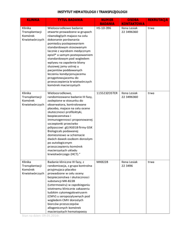 INSTYTUT HEMATOLOGII I TRANSFUZJOLOGII KLINIKA TYTUL BADANIA Klinika Transplantacji Komórek Krwiotwórczych Wieloosrodkowe badanie otwarte prowadzone w grupach równoleglych majace na celu dokonanie porównania pomiedzy postepowaniem standardowym stosowanym lacznie z wyrobem medycznym episil® a samym postepowaniem standardowym pod wzgledem wplywu na zapalenie blony sluzowej jamy ustnej u pacjentów poddawanych leczeniu kondycjonujacemu przygotowujacemu do przeszczepienia krwiotwórczych komórek macierzystych HS-10-396 Ilona Lesiak 22 3496360 trwa Klinika Transplantacji Komórek Krwiotwórczych Wieloosrodkowe, randomizowane badanie III fazy, zaslepione w stosunku do obserwatora, kontrolowane placebo, majace na celu ocene skutecznosci profilaktyki, bezpieczenstwa i immunogennosci proponowanej szczepionki przeciwko pólpascowi gE/AS01B firmy GSK Biologicals podawanej domiesniowo w schemacie dwóch dawek osobom doroslym po autologicznym przeszczepieniu komórek macierzystych ukladu krwiotwórczego (HCT).” 115523ZOSTER Ilona Lesiak 22 3496360 trwa MK8228 Ilona Lesiak 22 3496 trwa Klinika Transplantacji Komórek Krwiotwórczych Badanie kliniczne III fazy, z randomizacja, z grupa kontrolna przyjmujaca placebo prowadzone w celu oceny bezpieczenstwa i skutecznosci substancji MK-8228 (Letermowiru) w zapobieganiu istotnemu klinicznie zakazeniu ludzkim cytomegalowirusem (CMV) u seropozytywnych pod wzgledem CMV doroslych biorców przeszczepów allogenicznych komórek macierzystych hematopoezy Stan na dzien: 09.05.2014r. NUMER BADANIA OSOBA REKRUTACJA KONTAKTOWA