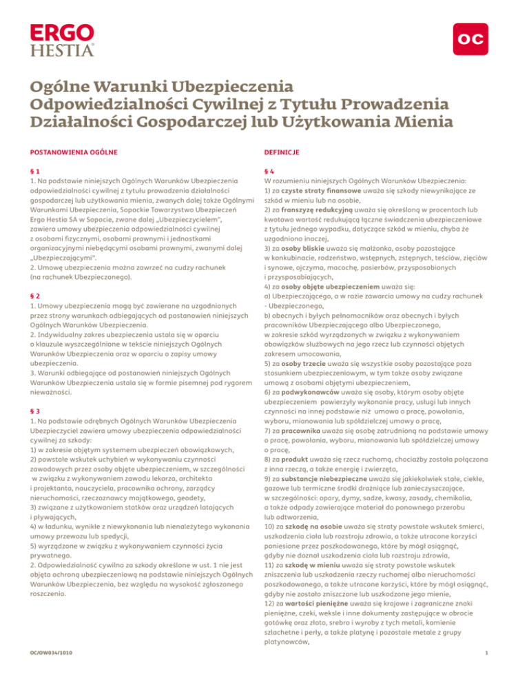 Ogólne Warunki Ubezpieczenia Odpowiedzialności Cywilnej z Tytułu Prowadzenia Działalności Gospodarczej lub Użytkowania Mienia POSTANOWIENIA OGÓLNE DEFINICJE §1 1. Na podstawie niniejszych Ogólnych Warunków Ubezpieczenia odpowiedzialności cywilnej z tytułu prowadzenia działalności gospodarczej lub użytkowania mienia, zwanych dalej także Ogólnymi Warunkami Ubezpieczenia, Sopockie Towarzystwo Ubezpieczeń Ergo Hestia SA w Sopocie, zwane dalej „Ubezpieczycielem”, zawiera umowy ubezpieczenia odpowiedzialności cywilnej z osobami fizycznymi, osobami prawnymi i jednostkami organizacyjnymi niebędącymi osobami prawnymi, zwanymi dalej „Ubezpieczającymi”. 2. Umowę ubezpieczenia można zawrzeć na cudzy rachunek (na rachunek Ubezpieczonego). §4 W rozumieniu niniejszych Ogólnych Warunków Ubezpieczenia: 1) za czyste straty finansowe uważa się szkody niewynikające ze szkód w mieniu lub na osobie, 2) za franszyzę redukcyjną uważa się określoną w procentach lub kwotowo wartość redukującą łączne świadczenia ubezpieczeniowe z tytułu jednego wypadku, dotyczące szkód w mieniu, chyba że uzgodniono inaczej, 3) za osoby bliskie uważa się małżonka, osoby pozostające w konkubinacie, rodzeństwo, wstępnych, zstępnych, teściów, zięciów i synowe, ojczyma, macochę, pasierbów, przysposobionych i przysposabiających, 4) za osoby objęte ubezpieczeniem uważa się: a) Ubezpieczającego, a w razie zawarcia umowy na cudzy rachunek - Ubezpieczonego, b) obecnych i byłych pełnomocników oraz obecnych i byłych pracowników Ubezpieczającego albo Ubezpieczonego, w zakresie szkód wyrządzonych w związku z wykonywaniem obowiązków służbowych na jego rzecz lub czynności objętych zakresem umocowania, 5) za osoby trzecie uważa się wszystkie osoby pozostające poza stosunkiem ubezpieczeniowym, w tym także osoby związane umową z osobami objętymi ubezpieczeniem, 6) za podwykonawców uważa się osoby, którym osoby objęte ubezpieczeniem powierzyły wykonanie pracy, usługi lub innych czynności na innej podstawie niż umowa o pracę, powołania, wyboru, mianowania lub spółdzielczej umowy o pracę, 7) za pracownika uważa się osobę zatrudnioną na podstawie umowy o pracę, powołania, wyboru, mianowania lub spółdzielczej umowy o pracę, 8) za produkt uważa się rzecz ruchomą, chociażby została połączona z inna rzeczą, a także energię i zwierzęta, 9) za substancje niebezpieczne uważa się jakiekolwiek stałe, ciekłe, gazowe lub termiczne środki drażniące lub zanieczyszczające, w szczególności: opary, dymy, sadze, kwasy, zasady, chemikalia, a także odpady zawierające materiał do ponownego przerobu lub odtworzenia, 10) za szkodę na osobie uważa się straty powstałe wskutek śmierci, uszkodzenia ciała lub rozstroju zdrowia, a także utracone korzyści poniesione przez poszkodowanego, które by mógł osiągnąć, gdyby nie doznał uszkodzenia ciała lub rozstroju zdrowia, 11) za szkodę w mieniu uważa się straty powstałe wskutek zniszczenia lub uszkodzenia rzeczy ruchomej albo nieruchomości poszkodowanego, a także utracone korzyści, które by mógł osiągnąć, gdyby nie zostało zniszczone lub uszkodzone jego mienie, 12) za wartości pieniężne uważa się krajowe i zagraniczne znaki pieniężne, czeki, weksle i inne dokumenty zastępujące w obrocie gotówkę oraz złoto, srebro i wyroby z tych metali, kamienie szlachetne i perły, a także platynę i pozostałe metale z grupy platynowców, §2 1. Umowy ubezpieczenia mogą być zawierane na uzgodnionych przez strony warunkach odbiegających od postanowień niniejszych Ogólnych Warunków Ubezpieczenia. 2. Indywidualny zakres ubezpieczenia ustala się w oparciu o klauzule wyszczególnione w tekście niniejszych Ogólnych Warunków Ubezpieczenia oraz w oparciu o zapisy umowy ubezpieczenia. 3. Warunki odbiegające od postanowień niniejszych Ogólnych Warunków Ubezpieczenia ustala się w formie pisemnej pod rygorem nieważności. §3 1. Na podstawie odrębnych Ogólnych Warunków Ubezpieczenia Ubezpieczyciel zawiera umowy ubezpieczenia odpowiedzialności cywilnej za szkody: 1) w zakresie objętym systemem ubezpieczeń obowiązkowych, 2) powstałe wskutek uchybień w wykonywaniu czynności zawodowych przez osoby objęte ubezpieczeniem, w szczególności w związku z wykonywaniem zawodu lekarza, architekta i projektanta, nauczyciela, pracownika ochrony, zarządcy nieruchomości, rzeczoznawcy majątkowego, geodety, 3) związane z użytkowaniem statków oraz urządzeń latających i pływających, 4) w ładunku, wynikłe z niewykonania lub nienależytego wykonania umowy przewozu lub spedycji, 5) wyrządzone w związku z wykonywaniem czynności życia prywatnego. 2. Odpowiedzialność cywilna za szkody określone w ust. 1 nie jest objęta ochroną ubezpieczeniową na podstawie niniejszych Ogólnych Warunków Ubezpieczenia, bez względu na wysokość zgłoszonego roszczenia. OC/OW034/1010 1 13) za wypadek uważa się śmierć, doznanie rozstroju zdrowia, uszczerbku na zdrowiu, uszkodzenie lub zniszczenie mienia, 14) za producenta produktu finalnego uważa się osobę, która wykorzystuje rzeczy pochodzące od osób objętych ubezpieczeniem w celu wytworzenia produktu, 15) za poszkodowanego uważa się osobę trzecią, która poniosła szkodę na osobie lub w mieniu; w przypadku rozszerzenia zakresu ubezpieczenia o klauzule 002 lub 004 za poszkodowanych w zakresie wyżej wymienionych szkód i klauzul uważa się również osoby objęte ubezpieczeniem i ich podwykonawców oraz pracowników. PRZEDMIOT I ZAKRES UBEZPIECZENIA §5 1. Przedmiotem ubezpieczenia jest odpowiedzialność cywilna osób objętych ubezpieczeniem za szkody na osobie lub w mieniu wyrządzone poszkodowanym w związku z prowadzeniem działalności gospodarczej wskazanej w umowie ubezpieczenia, użytkowaniem mienia oraz wprowadzeniem produktu do obrotu (odpowiedzialność cywilna za produkt), w zakresie ryzyk o