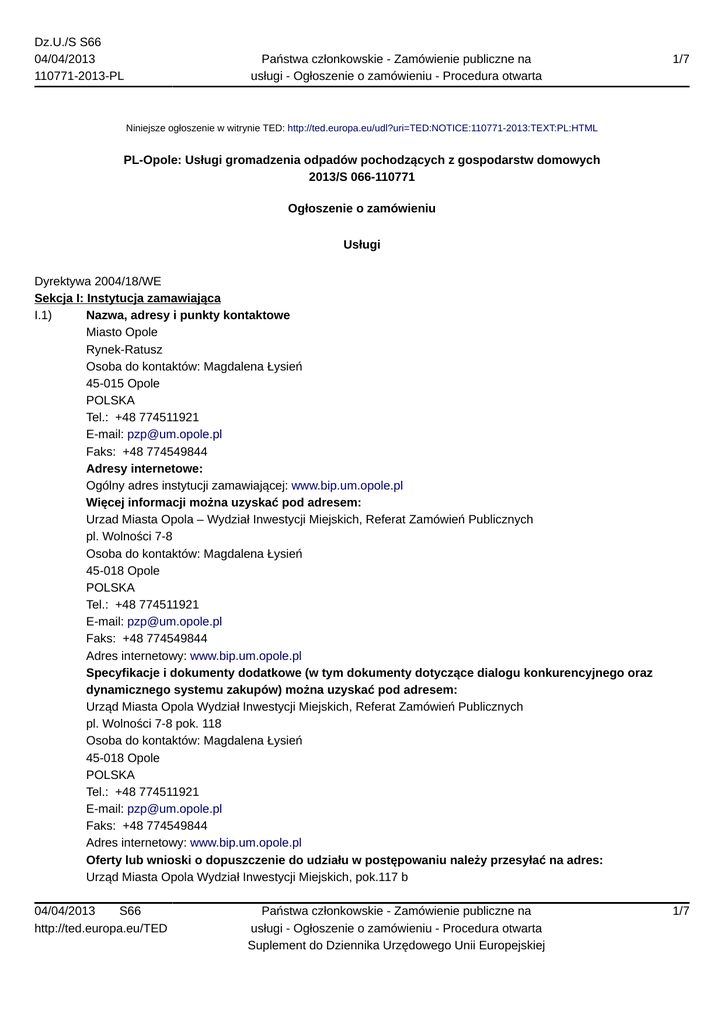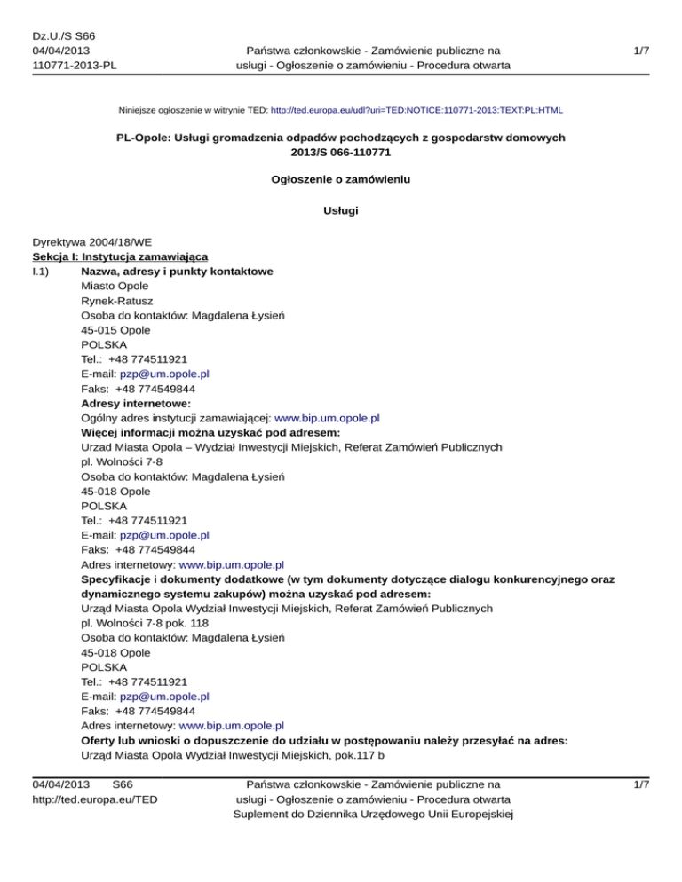 Dz.U./S S66 04/04/2013 110771-2013-PL Państwa członkowskie - Zamówienie publiczne na usługi - Ogłoszenie o zamówieniu - Procedura otwarta 1/7 Niniejsze ogłoszenie w witrynie TED: http://ted.europa.eu/udl?uri=TED:NOTICE:110771-2013:TEXT:PL:HTML PL-Opole: Usługi gromadzenia odpadów pochodzących z gospodarstw domowych 2013/S 066-110771 Ogłoszenie o zamówieniu Usługi Dyrektywa 2004/18/WE Sekcja I: Instytucja zamawiająca I.1) Nazwa, adresy i punkty kontaktowe Miasto Opole Rynek-Ratusz Osoba do kontaktów: Magdalena Łysień 45-015 Opole POLSKA Tel.: +48 774511921 E-mail: [email protected] Faks: +48 774549844 Adresy internetowe: Ogólny adres instytucji zamawiającej: www.bip.um.opole.pl Więcej informacji można uzyskać pod adresem: Urzad Miasta Opola – Wydział Inwestycji Miejskich, Referat Zamówień Publicznych pl. Wolności 7-8 Osoba do kontaktów: Magdalena Łysień 45-018 Opole POLSKA Tel.: +48 774511921 E-mail: [email protected] Faks: +48 774549844 Adres internetowy: www.bip.um.opole.pl Specyfikacje i dokumenty dodatkowe (w tym dokumenty dotyczące dialogu konkurencyjnego oraz dynamicznego systemu zakupów) można uzyskać pod adresem: Urząd Miasta Opola Wydział Inwestycji Miejskich, Referat Zamówień Publicznych pl. Wolności 7-8 pok. 118 Osoba do kontaktów: Magdalena Łysień 45-018 Opole POLSKA Tel.: +48 774511921 E-mail: [email protected] Faks: +48 774549844 Adres internetowy: www.bip.um.opole.pl Oferty lub wnioski o dopuszczenie do udziału w postępowaniu należy przesyłać na adres: Urząd Miasta Opola Wydział Inwestycji Miejskich, pok.117 b 04/04/2013 S66 http://ted.europa.eu/TED Państwa członkowskie - Zamówienie publiczne na usługi - Ogłoszenie o zamówieniu - Procedura otwarta Suplement do Dziennika Urzędowego Unii Europejskiej 1/7 Dz.U./S S66 04/04/2013 110771-2013-PL Państwa członkowskie - Zamówienie publiczne na usługi - Ogłoszenie o zamówieniu - Procedura otwarta 2/7 pl. Wolności 7-8, pok. 117b Osoba do kontaktów: Magdalena Łysień 45-018 Opole POLSKA Tel.: +48 774511921 E-mail: [email protected] Faks: +48 774549844 Adres internetowy: www.bip.um.opole.pl I.2) Rodzaj instytucji zamawiającej Organ władzy regionalnej lub lokalnej I.3) Główny przedmiot lub przedmioty działalności Ogólne usługi publiczne I.4) Udzielenie zamówienia w imieniu innych instytucji zamawiających Instytucja zamawiająca dokonuje zakupu w imieniu innych instytucji zamawiających: nie Sekcja II: Przedmiot zamówienia II.1) Opis II.1.1) Nazwa nadana zamówieniu przez instytucję zamawiającą: Prowadzenie 2 punktów selektywnego zbierania odpadów komunalnych powstających na terenie miasta Opola zwanych zbiornicami. II.1.2) Rodzaj zamówienia oraz lokalizacja robót budowlanych, miejsce realizacji dostawy lub świadczenia usług Usługi Główne miejsce lub lokalizacja robót budowlanych, miejsce realizacji dostawy lub świadczenia usług: Opole. Kod NUTS II.1.3) Informacje na temat zamówienia publicznego, umowy ramowej lub dynamicznego systemu zakupów (DSZ) Ogłoszenie dotyczy zamówienia publicznego II.1.4) Informacje na temat umowy ramowej II.1.5) Krótki opis zamówienia lub zakupu Prowadzenie 2 punktów selektywnego zbierania odpadów komunalnych powstających na terenie miasta Opola zwanych zbiornicami. Szczegółowy opis przedmiotu zamówienia został określony we wzorze umowy. II.1.6) Wspólny Słownik Zamówień (CPV) 90511200 II.1.7) Informacje na temat Porozumienia w sprawie zamówień rządowych (GPA) II.1.8) Części To zamówienie podzielone jest na części: nie II.1.9) Informacje o ofertach wariantowych Dopuszcza się składanie ofert wariantowych: nie II.2) Wielkość lub zakres zamówienia II.2.1) Całkowita wielkość lub zakres: Postępowanie o wartości powyżej 200 000,00 EUR. Szacunkowa wartość bez VAT: 3 000 000,00 PLN 04/04/2013 S66 http://ted.europa.eu/TED Państwa członkowskie - Zamówienie publiczne na usługi - Ogłoszenie o zamówieniu - Procedura otwarta Suplement do Dziennika Urzędowego Unii Europejskiej 2/7 Dz.U./S S66 04/04/2013 110771-2013-PL Państwa członkowskie - Zamówienie publiczne na usługi - Ogłoszenie o zamówieniu - Procedura otwarta II.2.2) Informacje o opcjach Opcje: nie II.2.3) Informacje o wznowieniach Jest to zamówienie podlegające wznowieniu: nie II.3) Czas trwania zamówienia lub termin realizacji Rozpoczęcie 20.6.2013. Zakończenie 15.6.2017 3/7 Sekcja III: Informacje o charakterze prawnym, ekonomicznym, finansowym i technicznym III.1) Warunki dotyczące zamówienia III.1.1) Wymagane wadia i gwarancje: Na podstawie art. 45 ust.1 Prawa zamówień publicznych Zamawiający żąda od Wykonawców wniesienia wadium. 1) Zamawiający określa kwotę wadium w wysokości: 30 000,00 PLN. 2) Wadium ma być wniesione przed upływem terminu składania ofert, w jednej lub kilku formach podanych w art. 45 ust. 6 Prawa. Wadium wnoszone w pieniądzu wpłaca się przelewem na rachunek bankowy Zamawiającego Nr 47 1160 2202 0000 0002 1515 3330 w Banku Millenium. Kserokopię polecenia przelewu załącza się do oferty. 3) W przypadku wniesienia wadium w poręczeniach lub gwarancjach, złożenia ich należy dokonać w kasie Urzędu Miasta Opola, Rynek Ratusz, pokój nr 2, a kserokopię z potwierdzeniem złożenia (pieczątka wpływu do kasy) należy załączyć do oferty. Złożenie ma być dokonane przed terminem składania ofert. 4) Jeżeli złożenie oferty następuje za pośrednictwem poczty lub przesyłką kurierską, a Wykonawca nie złoży poręczeń lub gwarancji w kasie Urzędu, to oryginał poręczenia lub gwarancji ma być załączony do oferty wraz z kopią poręczenia lub gwarancji poświadczoną za zgodność z oryginałem. Zaleca się aby oryginał poręczenia lub gwarancji nie był trwale zszyty/zbindowany z ofertą. 5) Poręczenie lub gwarancja ma zawierać zapis uwzględniający wszystkie trzy warunki zatrzymania wadium, określone w art. 46 ust. 4a i ust. 5 Prawa. Ma również zawierać oświad