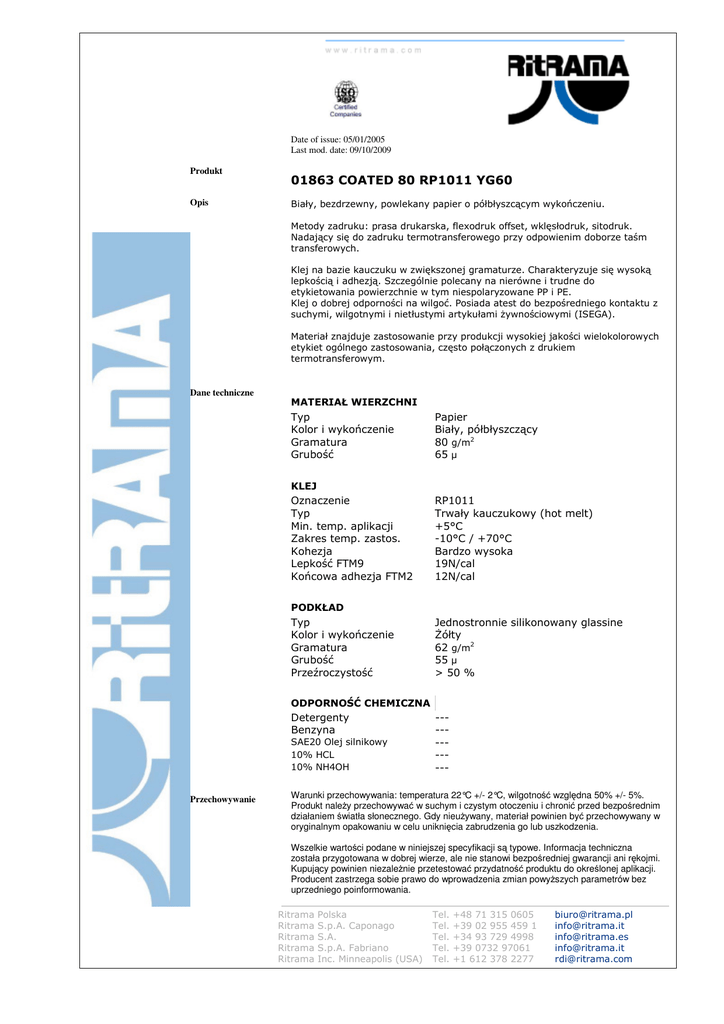 Date of issue: 05/01/2005 Last mod. date: 09/10/2009 Produkt Opis 01863 COATED 80 RP1011 YG60 Biały, bezdrzewny, powlekany papier o półbłyszcącym wykończeniu. Metody zadruku: prasa drukarska, flexodruk offset, wklęsłodruk, sitodruk. Nadający się do zadruku termotransferowego przy odpowienim doborze taśm transferowych. Klej na bazie kauczuku w zwiększonej gramaturze. Charakteryzuje się wysoką lepkością i adhezją. Szczególnie polecany na nierówne i trudne do etykietowania powierzchnie w tym niespolaryzowane PP i PE. Klej o dobrej odporności na wilgoć. Posiada atest do bezpośredniego kontaktu z suchymi, wilgotnymi i nietłustymi artykułami żywnościowymi (ISEGA). Materiał znajduje zastosowanie przy produkcji wysokiej jakości wielokolorowych etykiet ogólnego zastosowania, często połączonych z drukiem termotransferowym. Dane techniczne MATERIAŁ WIERZCHNI Typ Kolor i wykończenie Gramatura Grubość Papier Biały, półbłyszczący 80 g/m2 65 µ KLEJ Oznaczenie Typ Min. temp. aplikacji Zakres temp. zastos. Kohezja Lepkość FTM9 Końcowa adhezja FTM2 RP1011 Trwały kauczukowy (hot melt) +5°C -10°C / +70°C Bardzo wysoka 19N/cal 12N/cal PODKŁAD Typ Kolor i wykończenie Gramatura Grubość Przeźroczystość Jednostronnie silikonowany glassine Żółty 62 g/m2 55 µ > 50 % ODPORNOŚĆ CHEMICZNA Detergenty Benzyna SAE20 Olej silnikowy 10% HCL 10% NH4OH Przechowywanie ----------- Warunki przechowywania: temperatura 22°C +/- 2°C, wilgotność względna 50% +/- 5%. Produkt należy przechowywać w suchym i czystym otoczeniu i chronić przed bezpośrednim działaniem światła słonecznego. Gdy nieużywany, materiał powinien być przechowywany w oryginalnym opakowaniu w celu uniknięcia zabrudzenia go lub uszkodzenia. Wszelkie wartości podane w niniejszej specyfikacji są typowe. Informacja techniczna została przygotowana w dobrej wierze, ale nie stanowi bezpośredniej gwarancji ani rękojmi. Kupujący powinien niezależnie przetestować przydatność produktu do określonej aplikacji. Producent zastrzega sobie prawo do wprowadzenia zmian powyższych parametrów bez uprzedniego poinformowania. Ritrama Ritrama Ritrama Ritrama Ritrama Polska S.p.A. Caponago S.A. S.p.A. Fabriano Inc. Minneapolis (USA) Tel. Tel. Tel. Tel. Tel. +48 71 315 0605 +39 02 955 459 1 +34 93 729 4998 +39 0732 97061 +1 612 378 2277 [email protected] [email protected] [email protected] [email protected] [email protected]