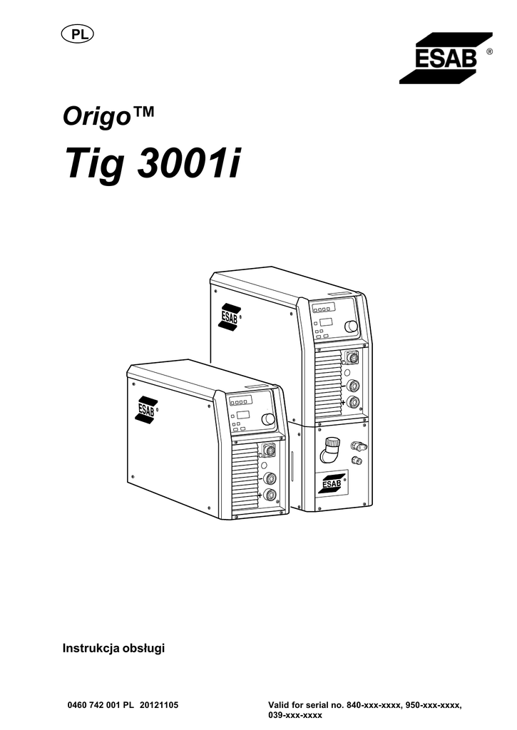 PL Origo™ Tig 3001i Instrukcja obsługi 0460 742 001 PL 20121105 Valid for serial no. 840-xxx-xxxx, 950-xxx-xxxx, 039-xxx-xxxx -2- 1 BEZPIECZEŃSTWO . . . . . . . . . . . . . . . . . . . . . . . . . . . . . . . . . . . . . . . . . . . . . . . . 2 WPROWADZENIE . . . . . . . . . . . . . . . . . . . . . . . . . . . . . . . . . . . . . . . . . . . . . . . . . . 2.1 2.2 4 6 Sprzęt . . . . . . . . . . . . . . . . . . . . . . . . . . . . . . . . . . . . . . . . . . . . . . . . . . . . . . . . . . . . . . . . . . . Panele sterowania TA23 i TA24 . . . . . . . . . . . . . . . . . . . . . . . . . . . . . . . . . . . . . . . . . . . . . 6 6 3 DANE TECHNICZNE . . . . . . . . . . . . . . . . . . . . . . . . . . . . . . . . . . . . . . . . . . . . . . . . 4 MONTA . . . . . . . . . . . . . . . . . . . . . . . . . . . . . . . . . . . . . . . . . . . . . . . . . . . . . . . . . . . 7 8 4.1 4.2 4.3 Instrukcja podnoszenia . . . . . . . . . . . . . . . . . . . . . . . . . . . . . . . . . . . . . . . . . . . . . . . . . . . . . Lokalizacja . . . . . . . . . . . . . . . . . . . . . . . . . . . . . . . . . . . . . . . . . . . . . . . . . . . . . . . . . . . . . . . Zasilanie sieciowe . . . . . . . . . . . . . . . . . . . . . . . . . . . . . . . . . . . . . . . . . . . . . . . . . . . . . . . . . 8 9 9 5 OBSŁUGA . . . . . . . . . . . . . . . . . . . . . . . . . . . . . . . . . . . . . . . . . . . . . . . . . . . . . . . . . 10 5.1 5.2 5.3 5.4 5.5 5.6 Przyłącza i elementy nastawcze . . . . . . . . . . . . . . . . . . . . . . . . . . . . . . . . . . . . . . . . . . . . . Przyłącze kabla spawania i kabla powrotnego . . . . . . . . . . . . . . . . . . . . . . . . . . . . . . . . . Sterowanie wentylatorem . . . . . . . . . . . . . . . . . . . . . . . . . . . . . . . . . . . . . . . . . . . . . . . . . . . Zabezpieczenie przed przegrzaniem . . . . . . . . . . . . . . . . . . . . . . . . . . . . . . . . . . . . . . . . . Spawanie TIG . . . . . . . . . . . . . . . . . . . . . . . . . . . . . . . . . . . . . . . . . . . . . . . . . . . . . . . . . . . . . Spawanie MMA . . . . . . . . . . . . . . . . . . . . . . . . . . . . . . . . . . . . . . . . . . . . . . . . . . . . . . . . . . . 11 11 11 12 12 12 6 KONSERWACJA . . . . . . . . . . . . . . . . . . . . . . . . . . . . . . . . . . . . . . . . . . . . . . . . . . . 12 6.1 6.2 Źródło prądu . . . . . . . . . . . . . . . . . . . . . . . . . . . . . . . . . . . . . . . . . . . . . . . . . . . . . . . . . . . . . . Uchwyt spawalniczy . . . . . . . . . . . . . . . . . . . . . . . . . . . . . . . . . . . . . . . . . . . . . . . . . . . . . . . 12 13 7 USUWANIE USTEREK . . . . . . . . . . . . . . . . . . . . . . . . . . . . . . . . . . . . . . . . . . . . . . 8 ZAMAWIANIE CZĘŚCI ZAMIENNYCH . . . . . . . . . . . . . . . . . . . . . . . . . . . . . . . . SCHEMAT . . . . . . . . . . . . . . . . . . . . . . . . . . . . . . . . . . . . . . . . . . . . . . . . . . . . . . . . . . . . NUMER ZAMÓWIENIOWY . . . . . . . . . . . . . . . . . . . . . . . . . . . . . . . . . . . . . . . . . . . . . WYPOSAŻENIE . . . . . . . . . . . . . . . . . . . . . . . . . . . . . . . . . . . . . . . . . . . . . . . . . . . . . . . 13 13 14 16 17 Zastrzegamy sobie prawo do wprowadzenia zmian. TOCo -3- PL 1 BEZPIECZEŃSTWO Użytkownicy sprzętu firmy ESAB są odpowiedzialni za przestrzeganie odpowiednich przepisów bezpieczeństwa przez osoby pracujące z lub przy tym sprzęcie. Zasady bezpieczeństwa muszą być zgodne z wymaganiami stawianymi tego rodzaju sprzętowi. Poza standardowymi przepisami dotyczącymi miejsca pracy należy przestrzegać przedstawionych zaleceń. Wszelkie prace muszą być wykonywane przez przeszkolony personel, dobrze znający zasady działania sprzętu. Niewłaściwe działanie sprzętu może prowadzić do sytuacji niebezpiecznych, a w rezultacie do obrażeń operatora oraz uszkodzenia sprzętu. 1. Każdy, kto używa sprzętu spawalniczego, musi znać się na: S jego obsłudze S lokalizacji wyłacznika awaryjnego zatrzymania S jego działaniu S Przestrzeganiu odpowiednich środków ostrożności i przepisów BHP S spawaniu i cięciu 2. Operator musi upewnić się, że: S w momencie uruchomienia sprzętu w miejscu pracy nie znajduje się żadna nieupoważniona osoba S w chwili zajarzenia łuku wszystkie osoby są odpowiednio zabezpieczone 3. Miejsce pracy musi być: S Zabezpieczone przed zagrożeniem wypadkiem, pożarem, wybuchem i promieniowaniem łuku na zewnątrz S Dobrze wentylowane, ale wolne od przeciągów 4. Sprzęt ochrony osobistej S Należy zawsze stosować zalecany sprzęt ochrony osobistej, taki jak okulary ochronne, odzież ognioodporna, rękawice ochronne. S Nie należy nosić żadnych luźnych przedmiotów, takich jak szaliki, bransolety, pierścionki, itp., które mogłyby się o coś zahaczyć lub spowodować poparzenie. 5. Ogólne środki ostrożności S Należy upewnić się czy przewód powrotny został prawidłowo podłączony. S Praca na sprzęcie zasilanym energią elektryczną powinna być wykonywana wyłącznie przez osoby posiadające odpowiednie kwalifikacje w zakresie eksploatacji takich urządzeń. S Odpowiedni sprzęt gaśniczy powinien być wyraźnie oznaczony i znajdować się w pobliżu. S Smarowania i konserwacji sprzętu nie wolno przeprowadzać podczas jego pracy. bt37o -4- © ESAB AB 2008 PL OSTRZEŻENIE Spawanie i cięcie łukowe może zagrażać bezpieczeństwu operatora i pozostałych osób przebywających w pobliżu. Dlatego podczas spawania i cięcia należy zachować szczególne środki ostrożności. Przed przystąpieniem do spawania zapoznaj się z przepisami bezpieczeństwa i higieny pracy obowiązującymi na twoim stanowisku pracy. PORAŻENIE ELEKTRYCZNE - może być przyczyną śmierci. S Urządzenie należy zainstalować zgodnie z obowiązującymi normami. S Unikaj kontaktu części znajdujących się pod napięciem lub elektrod z gołą skórą, mokrymi rękawicami lub mokrą odzieżą. S Odizoluj się od ziemi i p