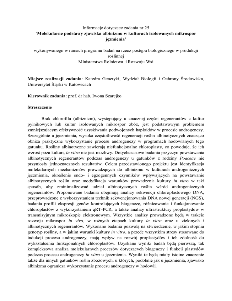 Informacje dotyczące zadania nr 25 ‘Molekularne podstawy zjawiska albinizmu w kulturach izolowanych mikrospor jęzmienia’ wykonywanego w ramach programu badań na rzecz postępu biologicznego w produkcji roślinnej Ministerstwa Rolnictwa i Rozwoju Wsi Miejsce realizacji zadania: Katedra Genetyki, Wydział Biologii i Ochrony Środowiska, Uniwersytet Śląski w Katowicach Kierownik zadania: prof. dr hab. Iwona Szarejko Streszczenie Brak chlorofilu (albiznizm), występujący u znacznej części regenerantów z kultur pylnikowych lub kultur izolowanych mikrospor zbóż, jest podstawowym problemem zmniejszającym efektywność uzyskiwania podwojonych haploidów w procesie androgenezy. Szczególnie u jęczmienia, wysoka częstotliwość regeneracji roślin albinotycznych znacząco obniża praktyczne wykorzystanie procesu androgenezy w programach hodowlanych tego gatunku. Rośliny albinotyczne zawierają niefunkcjonalne chloroplasty, co powoduje, że ich wzrost poza kulturą in vitro nie jest możliwy. Dotychczasowe badania przyczyn powstawania albinotycznych regenerantów podczas androgenezy u gatunków z rodziny Poaceae nie przyniosły jednoznacznych rezultatów. Celem przedstawionego projektu jest identyfikacja molekularnych mechanizmów prowadzących do albinizmu w kulturach androgenicznych jęczmienia, określenie endo- i egzogennych czynników wpływających na powstawanie albinotycznych roślin oraz modyfikacja warunków prowadzenia kultury in vitro w taki sposób, aby zminimalizować udział albinotycznych roślin wśród androgenicznych regenerantów. Proponowane badania obejmują analizy sekwencji chloroplastowego DNA, przeprowadzone z wykorzystaniem technik sekwencjonowania DNA nowej generacji (NGS), badania profili ekspresji genów kontrolujących biogenezę, różnicowanie i funkcjonowanie chloroplastów z wykorzystaniem qRT-PCR, a także analizy ultrastruktury proplastydów w transmisyjnym mikroskopie elektronowym. Wszystkie analizy prowadzone będą w trakcie rozwoju mikrospor in vivo, w rożnych etapach kultury in vitro oraz u zielonych i albinotycznych regenerantów. Wykonane badania pozwolą na stwierdzenie, w jakim stopniu genotyp rośliny, a w jakim warunki kultury in vitro, a przede wszystkim stresy stosowane do indukcji procesu androgenezy, mają wpływ na rozwój proplastydów i ich zdolność do wykształcenia funkcjonalnych chloroplastów. Uzyskane wyniki badań będą pierwszą, tak kompleksową analizą molekularnych procesów dotyczących biogenezy i funkcji plastydów podczas procesu androgenezy in vitro u jęczmienia. Wyniki te będą miały istotne znaczenie także dla innych gatunków roślin zbożowych, u których, podobnie jak u jęczmienia, zjawisko albinizmu ogranicza wykorzystanie procesu androgenezy w hodowli. Cele zadania Podstawowym celem projektu jest rozpoznanie przyczyn albinizmu występującego u regenerantów jęczmienia uzyskiwanych na drodze androgenezy. Zjawisko to w istotny sposób zmniejsza wydajność otrzymywania podwojonych haploidów z kultur pylnikowych i/lub kultur izolowanych mikrospor zbóż i ogranicza ich wykorzystanie w programach hodowlanych. Planowane badania będą miały na celu identyfikację molekularnych mechanizmów prowadzących do albinizmu w kulturach androgenicznych jęczmienia, określenie endo- i egzogennych czynników wpływających na powstawanie albinotycznych roślin oraz modyfikację warunków prowadzenia kultury in vitro w taki sposób, aby zminimalizować udział albinotycznych roślin wśród androgenicznych regenerantów. Planowany okres realizacji zadania: 2014 – 2018 (5 lat) Wyniki uzyskane w każdym roku realizacji zadania będą niezwłocznie zamieszczane na stronie internetowej, nie później niż do dnia 15 stycznia następnego roku, a wyniki te są dostępne nieodpłatnie dla wszystkich zainteresowanych.