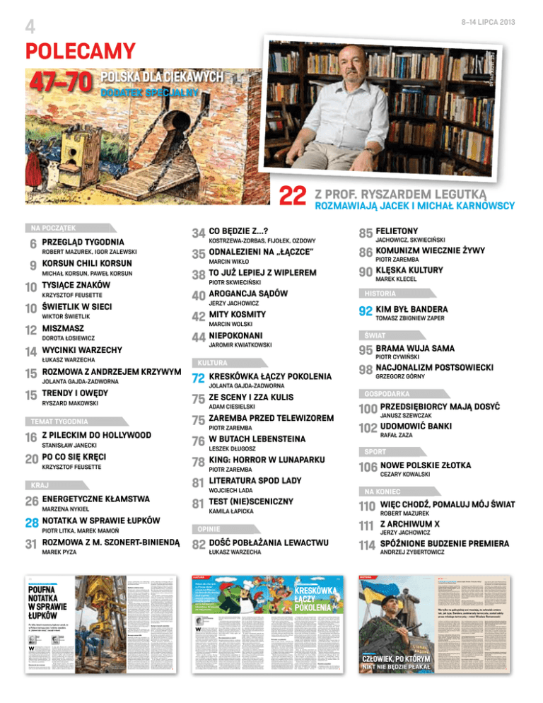 4 8–14 LIPCA 2013 POLECAMY 47–70 POLSKA DLA CIEKAWYCH DODATEK SPECJALNY 22 [ NA POCZĄTEK 6 9 PRZEGLĄD TYGODNIA ROBERT MAZUREK, IGOR ZALEWSKI KORSUN CHILI KORSUN MICHAŁ KORSUN, PAWEŁ KORSUN 10 TYSIĄCE ZNAKÓW 10 ŚWIETLIK W SIECI 12 MISZMASZ 14 WYCINKI WARZECHY 15 ROZMOWA Z ANDRZEJEM KRZYWYM 15 BĘDZIE Z...? 34 CO KOSTRZEWA-ZORBAS, FIJOŁEK, OZDOWY 85 FELIETONY JACHOWICZ, SKWIECIŃSKI NA „ŁĄCZCE” 35 ODNALEZIENI MARCIN WIKŁO WIECZNIE ŻYWY 86 KOMUNIZM PIOTR ZAREMBA JUŻ LEPIEJ Z WIPLEREM 38 TO PIOTR SKWIECIŃSKI KULTURY 90 KLĘSKA MAREK KLECEL 42 WIKTOR ŚWIETLIK ŁUKASZ WARZECHA MARCIN WOLSKI TRENDY I OWĘDY RYSZARD MAKOWSKI Z PILECKIM DO HOLLYWOOD STANISŁAW JANECKI PO CO SIĘ KRĘCI 20 KRZYSZTOF FEUSETTE [ KRAJ ENERGETYCZNE KŁAMSTWA 26 MARZENA NYKIEL 28 PIOTR LITKA, MAREK MAMOŃ 72 ROZMOWA Z M. SZONERT-BINIENDĄ KRAJ 29 FOT. FORUM/JACEK SZYDŁOWSKI POUFNA NOTATKA W SPRAWIE ŁUPKÓW JOLANTA GAJDA-ZADWORNA PIOTR LITKA dziennikarz W Pełnomocnik bez nominacji Wiceminister ochrony środowiska Piotr Woźniak nie jest nawet pełnomocnikiem rządu poczęcia wydobywania tak oczekiwanego w naszym kraju gazu, ale może zniweczyć ich dotychczasowe wysiłki. Spotkanie ostatniej szansy W marcu 2013 r. wreszcie nadarzyła się okazja, by globalni inwestorzy (m.in. Halliburton, American Chamber Of Commers) mogli podzielić się z wiceministrem „od łupków” niepokojem o przyszłość ich inwestycji w Polsce. W zamkniętym dla mediów spotkaniu w hotelu Polonia w Warszawie uczestniczyli też dyplomaci akredytowani w Polsce, z krajów zainteresowanych rozwojem przemysłu łupkowego w Europie. Zebrani liczyli na długą i rzeczową dyskusję z przedstawicielem polskiego rządu. Brak dobrej ustawy, brak jasnych reguł podatkowych oraz wakat na stanowisku pełnomocnika rządu ds. gazu łupkowego to tylko niektóre z zagadnień, o których chcieli rozmawiać z Piotrem Woźniakiem. Wielu z nich pamiętało jeszcze deklaracje szefa polskiej dyplomacji z 2010 r. Radosław Sikorski był wtedy w Nowym Jorku na spotkaniu nowo utworzonej Polsko-Amerykańskiej Rady Biznesu, zrzeszającej kilkanaście wielkich korporacji z USA. „Fakt, że amerykańscy biznesmeni z najpoważniejszych firm w różnych sektorach mówią, że Polska jest dobrym miejscem do inwestowania, potwierdza to, co mówię od jakieś czasu, że polska rzeczywistość jest lepsza od wyobrażenia o Polsce, i to zarówno za granicą, jak i w samej Polsce” – twierdził wtedy Sikorski. Minęły prawie trzy lata. Warszawa to nie Nowy Jork. Spotkanie w stolicy Polski było krótkie i już nie tak miłe jak to w Ameryce. Norwegia zamiast USA MARCIN MAMOŃ dziennikarz ds. ropy i gazu. Wiosną 2012 r. rząd III RP wprawdzie utworzył takie stanowisko, ale wciąż nikt go nie obsadził. W październiku 2012 r., gdy Rada Ministrów zatwierdziła w końcu założenia ustawy, która ma porządkować zasady eksploatacji złóż gazu i ropy na owej, przede wszystkim z łupków, premier Donald Tusk znów nie powołał nikogo na to stanowisko. „Etap dyskusji się skończył” – oświadczył. Nie wiadomo jednak, kto w niej uczestniczył, bo ustawa była przygotowywana w gronie zaledwie kilku osób, w ścisłej tajemnicy. Minęły kolejne miesiące. Gdy niektóre szczegóły ustawy poznali w końcu sami zainteresowani, poszukujący gazu w polskich łupkach, zapanowała konsternacja. Nowa ustawa nie tylko nie ułatwia im drogi do roz- [ GOSPODARKA 75 ZE SCENY I ZZA KULIS 75 ZAREMBA PRZED TELEWIZOREM 76 W BUTACH LEBENSTEINA 78 KING: HORROR W LUNAPARKU PRZEDSIĘBIORCY MAJĄ DOSYĆ 100 JANUSZ SZEWCZAK ADAM CIESIELSKI UDOMOWIĆ BANKI 102 RAFAŁ ZAZA PIOTR ZAREMBA [ LESZEK DŁUGOSZ SPORT NOWE POLSKIE ZŁOTKA 106 CEZARY KOWALSKI PIOTR ZAREMBA 81 LITERATURA SPOD LADY 81 TEST (NIE)SCENICZNY WOJCIECH LADA Wiertnia grupy PKN Orlen w Uścimowie. Jeden z niewielu odwiertów w poszukiwaniu gazu łupkowego w naszym kraju Dotarliśmy do kilku jego uczestników i notatki sporządzonej w języku angielskim przez jednego z wybitnych analityków rynku węglowodorów. Czytają ją dzisiaj ci, którzy decydują o globalnych interesach USA na świecie. Według autora notatki, wiceminister Woźniak miał oświadczyć, że dla Polski to Norwegia, a nie Ameryka jest wzorem poszukiwania i wydobywania gazu łupkowego. Polskie łupki różnią się bowiem od amerykańskich, a zatem – zdaniem wiceministra – amerykańskie technologie mają się nijak do polskiej specyfiki. Nie trzeba posiadać rządowej teki, by wiedzieć, że Norwegia nie ma gazu łupkowego ani jakiejkolwiek technologii do jego wydobywania, a przyjęte tam regulacje prawne i wysokie podatki dotyczą wyłącznie złóż gazu konwencjonalnego. Złoża norweskie są wreszcie, w przeciwieństwie do polskich łupków, już od lat dobrze rozpoznane, zaś ich eksploatacja jest znacznie tańsza. Mówiono o tym podczas spotkania w hotelu Polonia, ale nie zrobiło to na Woźniaku żadnego wrażenia. Być może niezręczne byłoby przypomnienie wiceministrowi, że dziś najważniejszym part- nerem w eksploatacji norweskiego szelfu jest Rosja. Norwegia i Rosja mają wkrótce wspólnie poszukiwać i wydobywać gaz ze złóż na Morzu Północnym i Barentsa. W maju 2012 r. umowy w tej sprawie podpisali w Oslo, w obecności premiera Władimira Putina i wicepremiera Igora Sieczyna, prezesi norweskiego Statoil i rosyjskiego Rosnie . Dzisiaj Putin jest prezydentem, a Sieczyn, osoba nr 2 w Rosji, prezesem Rosnie u. Firmy norweskie i rosyjskie łączy wspólny interes. Nie chcą, by ktoś z nimi konkurował w Europie, np. polskie łupki. „Ja bym na miejscu Norwegów tak to przeprowadził, by eksploatacja polskich łupków była nieopłacalna. Zniszczyłbym konkurencję” – powiedział nam jeden z uczestników warszawskiego spotkania. Według niego norweskie rozwiązania, w tym propozycja bardzo wysokich podatków nałożonych na inwestorów, spowodują, że polski gaz będzie znacznie droższy niż norweski 