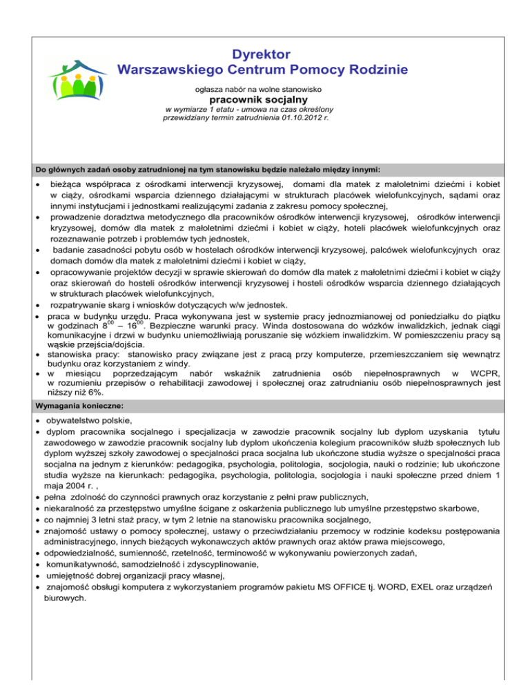 Dyrektor Warszawskiego Centrum Pomocy Rodzinie ogłasza nabór na wolne stanowisko pracownik socjalny w wymiarze 1 etatu - umowa na czas określony przewidziany termin zatrudnienia 01.10.2012 r. Do głównych zadań osoby zatrudnionej na tym stanowisku będzie należało między innymi: bieżąca współpraca z ośrodkami interwencji kryzysowej, domami dla matek z małoletnimi dziećmi i kobiet w ciąży, ośrodkami wsparcia dziennego działającymi w strukturach placówek wielofunkcyjnych, sądami oraz innymi instytucjami i jednostkami realizującymi zadania z zakresu pomocy społecznej, prowadzenie doradztwa metodycznego dla pracowników ośrodków interwencji kryzysowej, ośrodków interwencji kryzysowej, domów dla matek z małoletnimi dziećmi i kobiet w ciąży, hoteli placówek wielofunkcyjnych oraz rozeznawanie potrzeb i problemów tych jednostek, badanie zasadności pobytu osób w hostelach ośrodków interwencji kryzysowej, palcówek wielofunkcyjnych oraz domach domów dla matek z małoletnimi dziećmi i kobiet w ciąży, opracowywanie projektów decyzji w sprawie skierowań do domów dla matek z małoletnimi dziećmi i kobiet w ciąży oraz skierowań do hosteli ośrodków interwencji kryzysowej i hosteli ośrodków wsparcia dziennego działających w strukturach placówek wielofunkcyjnych, rozpatrywanie skarg i wniosków dotyczących w/w jednostek. praca w budynku urzędu. Praca wykonywana jest w systemie pracy jednozmianowej od poniedziałku do piątku 00 00 w godzinach 8 – 16 . Bezpieczne warunki pracy. Winda dostosowana do wózków inwalidzkich, jednak ciągi komunikacyjne i drzwi w budynku uniemożliwiają poruszanie się wózkiem inwalidzkim. W pomieszczeniu pracy są wąskie przejścia/dojścia. stanowiska pracy: stanowisko pracy związane jest z pracą przy komputerze, przemieszczaniem się wewnątrz budynku oraz korzystaniem z windy. w miesiącu poprzedzającym nabór wskaźnik zatrudnienia osób niepełnosprawnych w WCPR, w rozumieniu przepisów o rehabilitacji zawodowej i społecznej oraz zatrudnianiu osób niepełnosprawnych jest niższy niż 6%. Wymagania konieczne: obywatelstwo polskie, dyplom pracownika socjalnego i specjalizacja w zawodzie pracownik socjalny lub dyplom uzyskania tytułu zawodowego w zawodzie pracownik socjalny lub dyplom ukończenia kolegium pracowników służb społecznych lub dyplom wyższej szkoły zawodowej o specjalności praca socjalna lub ukończone studia wyższe o specjalności praca socjalna na jednym z kierunków: pedagogika, psychologia, politologia, socjologia, nauki o rodzinie; lub ukończone studia wyższe na kierunkach: pedagogika, psychologia, politologia, socjologia i nauki społeczne przed dniem 1 maja 2004 r. , pełna zdolność do czynności prawnych oraz korzystanie z pełni praw publicznych, niekaralność za przestępstwo umyślne ścigane z oskarżenia publicznego lub umyślne przestępstwo skarbowe, co najmniej 3 letni staż pracy, w tym 2 letnie na stanowisku pracownika socjalnego, znajomość ustawy o pomocy społecznej, ustawy o przeciwdziałaniu przemocy w rodzinie kodeksu postępowania administracyjnego, innych bieżących wykonawczych aktów prawnych oraz aktów prawa miejscowego, odpowiedzialność, sumienność, rzetelność, terminowość w wykonywaniu powierzonych zadań, komunikatywność, samodzielność i zdyscyplinowanie, umiejętność dobrej organizacji pracy własnej, znajomość obsługi komputera z wykorzystaniem programów pakietu MS OFFICE tj. WORD, EXEL oraz urządzeń biurowych. Wymagania pożądane: doświadczenie zawodowe - w jednostkach organizacyjnych pomocy społecznej ze szczególnym uwzględnieniem ośrodków interwencji kryzysowej, - w domach dla matek z małoletnimi dziećmi i kobiet w ciąży - w organizacjach pozarządowych działających na rzecz przeciwdziałania przemocy w rodzinie wiedza z zakresu praktycznego stosowania przepisów ustawy o pomocy społecznej, doświadczenie w pracy metodą kontraktu socjalnego. Wymagane dokumenty i oświadczenia życiorys z przebiegiem nauki i pracy zawodowej, list motywacyjny, kopie dokumentów potwierdzających posiadane wykształcenie, kopie świadectw pracy dokumentujących wymagany staż pracy lub zaświadczenie o zatrudnieniu w przypadku pozostawania w stosunku pracy, kopia dokumentu potwierdzającego obywatelstwo polskie i ukończenie 18 roku życia, kopie dokumentów potwierdzających posiadanie dodatkowych kwalifikacji, podpisane oświadczenie o pełnej zdolności do czynności prawnych oraz korzystaniu z pełni praw publicznych, podpisane oświadczenie, że kandydat nie był prawomocnie skazany za przestępstwo umyślne ścigane z oskarżenia publicznego lub umyślne przestępstwo skarbowe lub kopia aktualnego „Zapytania o udzielenie informacji o osobie” z Krajowego Rejestru Karnego, osoba wybrana do zatrudnienia będzie zobowiązana do przedstawienia oryginału aktualnego „Zapytania o udzielenie informacji o osobie” z Krajowego Rejestru Karnego, podpisana klauzula o treści: „Wyrażam zgodę na przetwarzanie moich danych osobowych zawartych w ofercie pracy dla potrzeb rekrutacji, zgodnie z ustawą z dnia 29.08.1997 o ochronie danych osobowych. Dz. U. z 2002 r. nr 101, poz.926 ze zm. Dokumenty aplikacyjne: list motywacyjny oraz CV powinny być opatrzone klauzulą: „Wyrażam zgodę na przetwarzanie moich danych osobowych zawartych w mojej ofercie pracy dla potrzeb niezbędnych do realizacji procesu rekrutacji, zgodnie z ustawą z dnia 29 sierpnia 1997 r. o ochronie danych osobowych (t.j. Dz. U. z 2002 r. Nr 101, poz. 926 z późn. zm) Przyjmuję do wiadomości fakt publikacji w Biuletynie Informacji Publicznej moich danych osobowych, zgodnie z wymogami ustawy z 22 marca 1990 r. o pracownikach samorządowych (t.j. Dz.U. z 2001 r. Nr 142, poz. 1593 z późn. zm)” Wymagane dokumenty aplikacyjne winny być przez kandydata własnoręcznie podpisane i złożone osobiście lub doręczone listownie w terminie do 26.092012 r. do g
