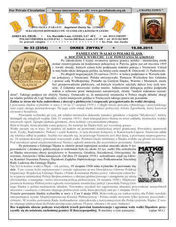 For Private Circulation Strona internetowa parafii: www.parafialeeds.org.uk „ CHAPELTOWN ” P O L SK I E J P A R A F I I Registered Charity No: 1119423 M.B.CZĘSTOCHOWSKIEJ I ŚW. STANISŁAWA KOSTKI W LEEDS. ADRES KS. PROB. + 6A, Harehills Lane, LEEDS, LS7 4EY + tel. 0113-3183397 POLSKI OŚRODEK KATOLICKI + Newton Hill Road, Leeds, LS7 4JE + tel. 0113-262 8019 Na prawach rękopisu + + + + + + + + + + + + + + + + + + + Ks. Prob. Jan Zaręba Nr 33 (2354) + OKRES ZWYKŁY + 16.08.2015 PAMIĘTAMY WALKI O POLSKI ŚLĄSK w ROCZNICĘ WYBUCHU I i II POWSTANIA ŚLĄSKIEGO Po zakończeniu I wojny światowej sprawa granicy polsko - niemieckiej miała zostać rozstrzygnięta na konferencji pokojowej w Paryżu, gdzie już od stycznia 1919 r. trwały obrady, których celem było podpisanie traktatu pokoju z Niemcami. Udział w niej brała także delegacja polska, na której czele stanęli R. Dmowski i I. Paderewski. Po długich negocjacjach 28 czerwca 1919 r. w końcu podpisano w Wersalu traktat pokojowy z Niemcami. Polska otrzymywała: Pomorze Wschodnie bez Gdańska i prawie całą Wielkopolskę. Ponadto na Górnym Śląsku, Warmii i Mazurach, miały być przeprowadzone plebiscyty, od których wyników zależały dalsze losy tych terenów. Z Gdańska utworzono wolne miasto. Jednocześnie delegacja polska podpisała traktat o ochronie praw mniejszości narodowych, zwany "małym traktatem wersalskim". Takiego podpisu nie złożyły Niemcy. Oznaczało to, że mniejszość niemiecka w Polsce mogła składać skargi na władze polskie do Ligi Narodów, z kolei mniejszość polska w Niemczech takiego prawa nie posiadała. Żadna ze stron nie była zadowolona z decyzji o plebiscycie i rozpoczęły przygotowania do walki zbrojnej. I powstanie śląskie wybuchło w nocy z 16 na 17 sierpnia 1919 r. i objęło tereny powiatu rybnickiego i pszczyńskiego oraz część okręgu przemysłowego. Na jego czele stanął śląski działacz polityczny Alfons Zgrzebniok, który kierował zrywem z Sosnowca. Powstanie wybuchło po tym, jak władze niemieckie dokonały masakry górników z kopalni "Mysłowice", którzy domagali się zaległych wypłat. Gdy 15 sierpnia 1919 r. tłum wtargnął przez bramę na teren zakładu, niemieckie wojsko otworzyło ogień. Zginęło siedmiu górników, dwie kobiety i trzynastoletni chłopiec. Była to kropla, która przelała czarę goryczy, bo nastroje na Śląsku były już wcześniej gorące. Walki zaczęły się w nocy 16 sierpnia od ataków na posterunki niemieckiej straży granicznej. Powstańcy opanowali m.in. Tychy, Radzionków, Piekary i część Katowic, w tym dworzec kolejowy w Katowicach-Ligocie. Niemcom udało się wkrótce odbić te punkty. Szybko też okazało się, że przewaga Niemców jest zbyt duża, a powstanie nieprzygotowane. 24 sierpnia dowódcy powstania wstrzymali walki. Pomimo klęski militarnej o Śląsku zrobiło się głośno na świecie. Pod naciskiem opinii międzynarodowej Niemcy ogłosili amnestię dla uczestników powstania. Teoretycznie. Po powstaniu z Górnego Śląska w obawie przed represjami uciekać musiało około 9 tys. powstańców i działaczy politycznych (z rodzinami było to około 22 tys. osób) Dla uchodźców ze Śląska stworzono obozy przejściowe w Sosnowcu, Grodźcu, Szczakowej, Oświęcimiu, Jaworznie, Zawierciu i kilka mniejszych. Od dnia 23 sierpnia 1919 r. uchodźcami zajął się Główny Komitet Niesienia Pomocy Ślązakom Zagłębia Dąbrowskiego oraz Podkomisariat Naczelnej Rady Ludowej dla Górnego Śląska. Nie był to koniec walki o Śląsk – rok później, 19 sierpnia 1920 roku wybuchło II powstanie śląskie. Tym r azem było zaplanowane i zostało ogłoszone pr zez Dowództwo Główne Polskiej Organizacji Wojskowej Górnego Śląska i Polski Komisariat Plebiscytowy. Głównym celem było wyparcie niemieckiej Policji Bezpieczeństwa z obszaru plebiscytowego i zastąpienie jej strażą obywatelską, a następnie - nowo utworzoną policją plebiscytową. 24 sierpnia 1920 r. Międzysojusznicza Komisja Plebiscytowa ogłosiła rozwiązanie niemieckiej policji i powołała Policję Górnego Śląska o polsko-niemieckim składzie. Powstańcy uzyskali też zapewnienie ukarania przywódców antypolskich ekscesów i usunięcie z obszaru objętego plebiscytem osób, które przybyły tam po 1 sierpnia 1919 r. Trzecie powstanie śląskie wybuchło w nocy z 2 na 3 maja 1921. Było r eakcją na niekor zystny dla Polski wer dykt interpretującej wyniki Międzysojuszniczej Komisji Plebiscytowej - Polska miała otrzymać tylko powiaty pszczyński i rybnicki. W wyniku powstania Rada Ambasadorów zdecydowała o korzystniejszym dla Polski podziale Śląska. Z terenu objętego plebiscytem do Polski przyłączono jedynie 29 proc. obszaru i 46 proc. ludności. Bez wątpienia obecne podczas wszystkich trzech powstań konsekwencja i ogromna wola walki Ślązaków przyczyniły się do ustalenia zachodniej granicy II Rzeczypospolitej. Winniśmy o tym pamiętać. (oprac M.I.) PORZĄDEK MSZY ŚWIĘTYCH I NABOŻEŃSTW NIEDZIELA, 16 SIERPNIA 2015; 20 ZWYKŁA; 9:30 – Za śp. brata + Władysława i bratową + Irenę oraz siostrę + Zofię i + Michała Wilińskich - w darze intencji od pp. Sztyrbickich 11:00 – Święto Żołnierza: Za poległych, zmarłych i żyjących członków SPK - w darze intencji od Związku Kombatantów Polskich Sił Zbrojnych na Zachodzie 11:00 – CHRZEST ZUZANNA SZATKOWSKA Harrogate 16.15 – O Błogosławieństwo Boże dla małżonków Sylwii i Dariusza Ćwiklińskich - w 15 rocznicę ślubu i dla dzieci Darii, Macieja, Łucji, Mateusza 19:00 – O Błogosławieństwo Boże dla matki chrzestnej Marianny Gałęzia prosząc o zdrowie z okazji imienin - w darze intencji od chrześniaczki Haliny z Mężem PONIEDZIAŁEK, 17 SIERPNIA; Wspomnienie Św. Jacka, prezbitera; 10:00 – Do Miłosierdzia Bożego z prośbą o zdrowie i Błogosławieństwo Boże dla pani Basi, Jasi, Kasi, Lusi, Ali, Małgosi i Krysa - w darze intencji
