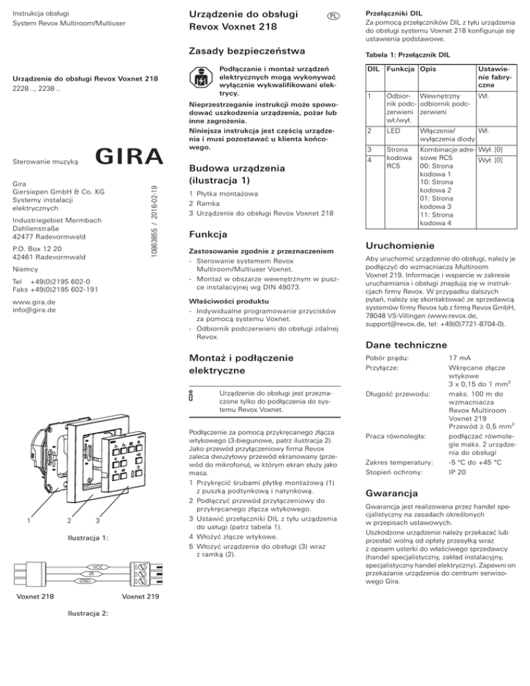 Urządzenie do obsługi Revox Voxnet 218 Instrukcja obsługi System Revox Multiroom/Multiuser PL Zasady bezpieczeństwa Podłączanie i montaż urządzeń elektrycznych mogą wykonywać wyłącznie wykwalifikowani elektrycy. Urządzenie do obsługi Revox Voxnet 218 2228 .., 2238 .. Nieprzestrzeganie instrukcji może spowodować uszkodzenia urządzenia, pożar lub inne zagrożenia. Niniejsza instrukcja jest częścią urządzenia i musi pozostawać u klienta końcowego. Sterowanie muzyką Industriegebiet Mermbach Dahlienstraße 42477 Radevormwald P.O. Box 12 20 42461 Radevormwald 10863855 / 2016-02-19 Gira Giersiepen GmbH & Co. KG Systemy instalacji elektrycznych Budowa urządzenia (ilustracja 1) Niemcy Tel +49(0)2195 602-0 Faks +49(0)2195 602-191 1 2 Ilustracja 1: VCC IR GND Voxnet 218 Voxnet 219 Ilustracja 2: DIL Funkcja Opis Ustawienie fabryczne 1 Odbior- Wewnętrzny nik podc- odbiornik podczerwieni zerwieni wł./wył. Wł. 2 LED Włączenie/ Wł. wyłączenia diody 3 Strona kodowa RC5 Kombinacje adre- Wył. [0] sowe RC5 Wył. [0] 00: Strona kodowa 1 10: Strona kodowa 2 01: Strona kodowa 3 11: Strona kodowa 4 4 Funkcja Zastosowanie zgodnie z przeznaczeniem - Sterowanie systemem Revox Multiroom/Multiuser Voxnet. - Montaż w obszarze wewnętrznym w puszce instalacyjnej wg DIN 49073. Uruchomienie Aby uruchomić urządzenie do obsługi, należy je podłączyć do wzmacniacza Multiroom Voxnet 219. Informacje i wsparcie w zakresie uruchamiania i obsługi znajdują się w instrukcjach firmy Revox. W przypadku dalszych pytań, należy się skontaktować ze sprzedawcą systemów firmy Revox lub z firmą Revox GmbH, 78048 VS-Villingen (www.revox.de, [email protected], tel: +49(0)7721-8704-0). Dane techniczne Montaż i podłączenie elektryczne Pobór prądu: Przyłącze: I Długość przewodu: Urządzenie do obsługi jest przeznaczone tylko do podłączenia do systemu Revox Voxnet. Podłączenie za pomocą przykręcanego złącza wtykowego (3-biegunowe, patrz ilustracja 2). Jako przewód przyłączeniowy firma Revox zaleca dwużyłowy przewód ekranowany (przewód do mikrofonu), w którym ekran służy jako masa. 1 Przykręcić śrubami płytkę montażową (1) z puszką podtynkową i natynkową. 2 Podłączyć przewód przyłączeniowy do przykręcanego złącza wtykowego. 3 Ustawić przełączniki DIL z tyłu urządzenia do usługi (patrz tabela 1). 4 Włożyć złącze wtykowe. 5 Włożyć urządzenie do obsługi (3) wraz z ramką (2). 3 Tabela 1: Przełącznik DIL 1 Płytka montażowa 2 Ramka 3 Urządzenie do obsługi Revox Voxnet 218 Właściwości produktu - Indywidualne programowanie przycisków za pomocą systemu Voxnet. - Odbiornik podczerwieni do obsługi zdalnej Revox. www.gira.de [email protected] Przełączniki DIL Za pomocą przełączników DIL z tyłu urządzenia do obsługi systemu Voxnet 218 konfiguruje się ustawienia podstawowe. Praca równoległa: Zakres temperatury: Stopień ochrony: 17 mA Wkręcane złącze wtykowe 3 x 0,15 do 1 mm² maks. 100 m do wzmacniacza Revox Multiroom Voxnet 219 Przewód 0,5 mm² podłączać równolegle maks. 2 urządzenia do obsługi -5 °C do +45 °C IP 20 Gwarancja Gwarancja jest realizowana przez handel specjalistyczny na zasadach określonych w przepisach ustawowych. Uszkodzone urządzenie należy przekazać lub przesłać wolną od opłaty przesyłką wraz z opisem usterki do właściwego sprzedawcy (handel specjalistyczny, zakład instalacyjny, specjalistyczny handel elektryczny). Zapewni on przekazanie urządzenia do centrum serwisowego Gira.