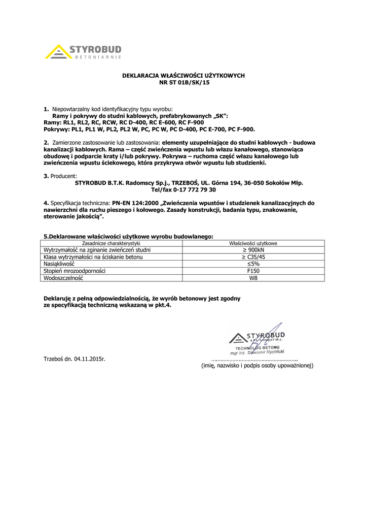 DEKLARACJA WŁAŚCIWOŚCI UŻYTKOWYCH NR ST 01B/SK/15 1. Niepowtarzalny kod identyfikacyjny typu wyrobu: Ramy i pokrywy do studni kablowych, prefabrykowanych „SK”: Ramy: RL1, RL2, RC, RCW, RC D-400, RC E-600, RC F-900 Pokrywy: PL1, PL1 W, PL2, PL2 W, PC, PC W, PC D-400, PC E-700, PC F-900. 2. Zamierzone zastosowanie lub zastosowania: elementy uzupełniające do studni kablowych - budowa kanalizacji kablowych. Rama – część zwieńczenia wpustu lub włazu kanałowego, stanowiąca obudowę i podparcie kraty i/lub pokrywy. Pokrywa – ruchoma część włazu kanałowego lub zwieńczenia wpustu ściekowego, która przykrywa otwór wpustu lub studzienki. 3. Producent: STYROBUD B.T.K. Radomscy Sp.j., TRZEBOŚ, UL. Górna 194, 36-050 Sokołów Młp. Tel/fax 0-17 772 79 30 4. Specyfikacja techniczna: PN-EN 124:2000 „Zwieńczenia wpustów i studzienek kanalizacyjnych do nawierzchni dla ruchu pieszego i kołowego. Zasady konstrukcji, badania typu, znakowanie, sterowanie jakością”. 5.Deklarowane właściwości użytkowe wyrobu budowlanego: Zasadnicze charakterystyki Właściwości użytkowe Wytrzymałość na zginanie zwieńczeń studni Klasa wytrzymałości na ściskanie betonu Nasiąkliwość Stopień mrozoodporności Wodoszczelność ≥ 900kN ≥ C35/45 ≤5% F150 W8 Deklaruję z pełną odpowiedzialnością, że wyrób betonowy jest zgodny ze specyfikacją techniczną wskazaną w pkt.4. Trzeboś dn. 04.11.2015r. ….…………………………………………….. (imię, nazwisko i podpis osoby upoważnionej)