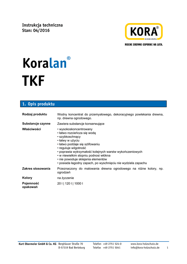 ® Rodzaj produktu Wodny koncentrat do przemysłowego, dekoracyjnego powlekania drewna, np. drewna ogrodowego. Substancje czynne Zawiera substancje konserwujące Właściwości • wysokoskoncentrowany • łatwo rozcieńcza się wodą • szybkoschnący • łatwy w użyciu • łatwo poddaje się szlifowaniu • reguluje wilgotność • poprawia wytrzymałość kolejnych warstw wykończeniowych • w niewielkim stopniu podnosi włókna • nie powoduje sklejania elementów • posiada łagodny zapach, po wyschnięciu nie wydziela zapachu Zakres stosowania Przeznaczony do malowania drewna ogrodowego na różne kolory, np. ogrodzeń Kolory na życzenie Pojemność opakowań 20 l | 120 l | 1000 l Berghäuser Straße 70 D-57319 Bad Berleburg Telefon +49 2751 524-0 Telefax +49 2751 5041 www.kora-holzschutz.de [email protected] 1 Gęstość 20 °C ok. 1,10 g/cm³ (w zależności od koloru) Lepkość 20 °C ok. 15 sek. (w zależności od koloru) (DIN pojemnik 4 mm) Czas schnięcia W warunkach umiarkowanych (23 °C, 50% względnej wilgotności powietrza wg DIN 50 014) i na zwykłych gatunkach drewna, takich jak sosna i świerk: zasychanie: po < 1 godz. szlifowanie: po ok. 2 godz. Duża wilgotność drewna i powietrza oraz wysokie temperatury opóźniają schnięcie. ż Przygotowanie Koralan® TKF rozcieńczyć wodą stale mieszając, do uzyskania stężenia odpowiedniego do stosowania. W zależności od koloru i zastosowania należy rozcieńczać w proporcji od 1:4 do 1:10. Przed użyciem preparatu Koralan® TKF należy odpowiednio przygotować powierzchnię (szlifowanie, czyszczenie). Nie wdychać pyłu powstającego przy szlifowaniu, odpowiednio go usunąć. W przypadku malowania drewna stosowanego na zewnątrz konieczne jest jego wcześniejsze zagruntowanie. Intensywność koloru zależy od stopnia rozcieńczenia, właściwości powierzchni i wilgotności drewna. Wanny do impregnacji zanurzeniowej powinny być wykonane ze stali szlachetnej lub pokryte powłoką antykorozyjną. Wilgotność malowanego drewna nie powinna przekraczać 20%. Zużycie ok. 80–120 ml/m² produktu rozcieńczonego gotowego do użycia, w zależności od chłonności podłoża i sposobu aplikacji Sposób nanoszenia Malowanie, zanurzanie, polewanie Zasady stosowania • temperatura pracy +15 °C do +30 °C • przed użyciem dobrze wymieszać, unikać dużych sił ścinających podczas pracy • przed użyciem rozcieńczyć Koralan® TKF zgodnie z instrukcją • zanurzyć na krótko elementy drewniane • zawiesić ukośnie do wyschnięcia • po użyciu preparatu na wannie do impregnacji zanurzeniowej umieścić pokrywę (pływający dekiel) Czyszczenie narzędzi Przy pomocy wody i płynu do mycia naczyń. Pozostałości po czyszczeniu usuwać zgodnie z przepisami. Berghäuser Straße 70 D-57319 Bad Berleburg Telefon +49 2751 524-0 Telefax +49 2751 5041 www.kora-holzschutz.de [email protected] 2 Oznakowanie zgodnie z Rozporządzeniem (WE) Nr 1272/2008 [CLP] Słowo sygnałowe: Uwaga Zawiera IPBC; 1,2-BENZOTIAZOL-3(2H)-ON; 2-METYLO-2H-IZOTIAZOL3-ON; MIESZANINA ZAWIERAJĄCA: 5-CHLORO-2-METYLO-2H-IZOTIAZOL-3-ON I 2-METYLO-2H-IZOTIAZOL-3-ON (3:1) Zagrożenia: H373 H317 H319 H412 Może powodować uszkodzenie narządów poprzez długotrwałe lub narażenie powtarzane. Może powodować uczulenie w kontakcie ze skórą. Działa drażniąco na oczy. Działa szkodliwie na organizmy wodne, powodując długotrwałe skutki. Środki ostrożności: P273 Unikać zrzutów do środowiska. P280 Stosować rękawice ochronne / odzież ochronną / ochronę oczu / ochronę twarzy. P310 Natychmiast skontaktować się z Ośrodkiem Zatruć lub lekarzem. P305+P351+P338 W przypadku dostania się do oczu: Ostrożnie płukać wodą przez kilka minut. Wyjąć soczewki kontaktowe, jeżeli są i można je łatwo usunąć. Dalej płukać. P302+P352 W przypadku kontaktu ze skórą: umyć dużą ilością wody z mydłem. P501 Zawartość / pojemnik poddać odpowiedniej utylizacji. Instrukcje użytkowania i ostrzeżenia Koncentrat produktu zawiera składniki biobójcze służące ochronie rozcieńczonego roztworu do zanurzania przed grzybami / drożdżami / pleśnią; w związku z tym należy bezwzględnie przestrzegać proporcji rozcieńczania. Stosować Koralan® TKF tylko zgodnie z instrukcją użytkowania. W razie potrzeby wannę zanurzeniową należy poddać konserwacji. W tym przypadku prosimy o kontakt z naszym doradcą technicznym. Przechowywać produkt w zamknięciu w miejscu niedostępnym dla dzieci. Nie przechowywać razem z żywnością, napojami i paszą dla zwierząt. Stosować odpowiednią odzież ochronną, rękawice ochronne, okulary ochronne. Nie wdychać pyłu powstającego przy szlifowaniu, odpowiednio go usunąć. Podczas szlifowania stosować maskę chroniącą przed pyłem. Nie spryskiwać. Natryskiwanie poza zamkniętymi urządzeniami stwarza zagrożenie dla zdrowia i środowiska. Po użyciu twarz i ręce starannie umyć wodą z mydłem. Zachować środki ostrożności stosowane zwykle podczas pracy z farbami i lakierami. Składowanie i ochrona środowiska Podczas składowania i użytkowania przestrzegać przepisów dotyczących ochrony wód gruntowych i powierzchniowych oraz powietrza. Unikać dostania się do wód powierzchniowych i kanalizacji. Przechowywać tylko w oryginalnych opakowaniach! Po użyciu opakowanie szczelnie zamknąć. Nie przechowywać w temperaturze poniżej +5°C lub powyżej +30°C.! Berghäuser Straße 70 D-57319 Bad Berleburg Telefon +49 2751 524-0 Telefax +49 2751 5041 www.kora-holzschutz.de [email protected] 3 Utylizacja Pozostałości po czyszczeniu oraz nieopróżnione opakowania usuwać zgodnie z przepisami (składowisko odpadów niebezpiecznych). Opróżnione całkowicie (do czysta) opakowania wrzucać do odpowiednich pojemników na odpady. Klasa zagrożenia wód Klasa zagrożenia wody WGK 2 zgodnie z VwVwS Kod produktu M-KH 01 Klasyfikacja odpadów EWC/AVV 08 01 20 zawiesiny wodne farb lub lakier