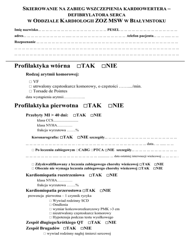 SKIEROWANIE NA ZABIEG WSZCZEPIENIA KARDIOWERTERA – DEFIBRYLATORA SERCA W ODDZIALE KARDIOLOGII ZOZ MSW W BIAŁYMSTOKU Imię nazwisko... ... ... ... ... ... ... ... ... ... ... ... ... ... ... ... ... ... PESEL ... ... ... ... ... ... ... ... ... ... ... ... ... ... ... adres... ... ... ... ... ... ... ... ... ... ... ...... ... ... ... ... ... ... ... ... ... ... ... ... ... ... .telefon pacjenta... ... ... ...... ... ... Rozpoznanie ... ... ... ... ... ... ... ... ... ... ... ... ... ... ... ... ... ... ... ... ... ... ... ... ... ... ... ... ... ... ... ... ... ... ... ... ... ... ... ... ... ... ... ... ... ... ... ... ... ... ... ... ... ... ... ... ... ... ... ... ... ... ... ... ... ... ... ... ... ... ... ... ... ... ... ... ... ... ... ... ... ... ... ... ... ... ... ... ... ... ... ... ... ... ... ... ... ... ... ... ... ... ... ... ... ... ... ... ... ... ... ... ... ... ... ... ... ... ... ... ... ... ... Profilaktyka wtórna TAK NIE Rodzaj arytmii komorowej: VF utrwalony częstoskurcz komorowy, o częstości ……..../min. Torsade de Pointes data wystąpienia arytmii…………….. Profilaktyka pierwotna TAK NIE Przebyty MI > 40 dni: TAK NIE klasa CCS.......................... klasa NYHA………… frakcja wyrzutowa …….% Koronarografia: TAK NIE szczegóły... ... ... ... ... ... ... ... ... ... ... ... ... ... ... ... ... ... ... ... ... ... ... ... ... ... ... ... ... ... ... ... . ... ... ... ... ... ... ... ... ... ... ... ... ... ... ... ... ... ... data.. ... ...... ... ... Po leczeniu zabiegowym CABG PTCA NIE szczegóły... ... ... ... ... ... ... ... ... ... ... ... ... ... ... ... ... ... ... ...... ... ... ... ... ... ... ... ... ... ... ............ ... data ostatniej interwnecji wieńcowej ... ... ... ... . Zdyskwalifikowany z leczenia zabiegowego choroby wieńcowej TAK NIE Obecnie nie wymaga leczenia zabiegowego choroby wieńcowej TAK NIE Kardiomiopatia rozstrzeniowa TAK NIE klasa NYHA………… frakcja wyrzutowa …….% Kardiomiopatia przerostowa TAK NIE prewencja pierwotna – 1 czynnik ryzyka Wywiad rodzinny SCD Omdlenia wymiar końcoworozkurczowy PMK 3 cm nieutrwalony częstoskurcz komorowy Hypotensja podczas testu wysiłkowego Zespół długiego/krótkiego QT TAK NIE Zespół Brugadów TAK NIE wywiad rodzinny nagłej śmierci sercowej Arytmogenna dysplazja prawej komory TAK NIE Wielokształtny częstoskurcz komorowy zależny od katecholamin TAK NIE VF podczas leczenia B-blokerem TAK NIE Niewydolność krążenia: TAK NIE Wskazania do stałej stymulacji serca: TAK NIE SSS blok p-k I, II, III NYHA ……… inne ... ... ... ... ... ... ... ... ... ... ... ... ... ... ... ... ... ... Migotanie/trzepotanie przedsionków: TAK NIE utrwalone z częstością QRS ........./min. napadowe data ……………… LK ........ mm EF … % PK........mm PP........mm zaburzenia kurczliwości uogólnione / odcinkowe wady zastawkowe……………….. ECHO RVSP......... mmHg Inne nieprawidłowości ... ... ... ... ... ... ... ... ... ... ... ... ... ... ... ... ... ... ... ... ... ... ... ... ... ... ... ... ... ... ... ... ... ... ... ... ... ... ... ... ... ... ... ... ... ... ... ... ... ... ... ... ... ... ... ... ... ... ... ... ... ... ... ... ... ... ... ... ... ... ... ... ... ... ... ... EKG spoczynkowe (data……………………) :... ... ... ... ... ... ... ... ... ... ... ... ... ... ... ... ... ... ... ... ... ... ... ... ... ... ... ... ... ... ... ... ... ... ... ... ... ... ... ... ... ... ... ... ... ... ... ... ... ... ... ... ... ... ... ... ... ... ... ... ... ... ... ... ... ... ... ... ... ... ... ... ... ... ... szerokość zespołów QRS... ... ... ms Przebyte operacje kardiochirurgiczne: TAK NIE: data... ... ... ... ... ... ...... ... ... CABG Zastawki (które? biologiczne/sztuczne?)... ... ... ... ... ... ... ... ... ... ... ... ... ... ... ... ... ... ... ... ... ... ... ... ... ... ... ... ... ... ... ... ... ... ... ... ... ... ... ... ... ... ... ... ... ... ... ... ... . ... ... ... ... ... ... ... ... ... ... ... ... inne... ... ... ... ... ... ... ... ... ... ... ... ... ... ... ... ... ... ... ... ... ... ... ... ... ... ... ... ... ... ... ... ... ... ... ... ... Leki: B-bloker ………………………. Dawka ……………. ACEI …………………… dawka …………………. Furosemid, dawka …………………… Digoksyna TAK/NIE Spironolakton/eplerenon Leki przeciwpłytkowe i przeciwkrzepliwe – data odstawienia ASA... ... ... ... ... ... ... ... ... ... klopidogrel/tiklopidyna ... ... ... ... ... ... ... ... ... ... heparyna drobnocząsteczkowa ... ... ... ... ... ... ... ... ... ... heparyna niefrakcjonowana ... ... ... ... ... ... ... ... ... ... acenokumarol/warfaryna ... ... ... ... ... .. INR >2 w ciągu ostatniego miesiąca TAK nie przyjmował/a Szczepienie przeciw WZW typu B (min. 2 dawki szczepionki) TAK Lekarz kierujący Ośrodek NIE NIE daty............................ tel. kontaktowy lekarza kierującego …………..…………………… Data…………..…………..