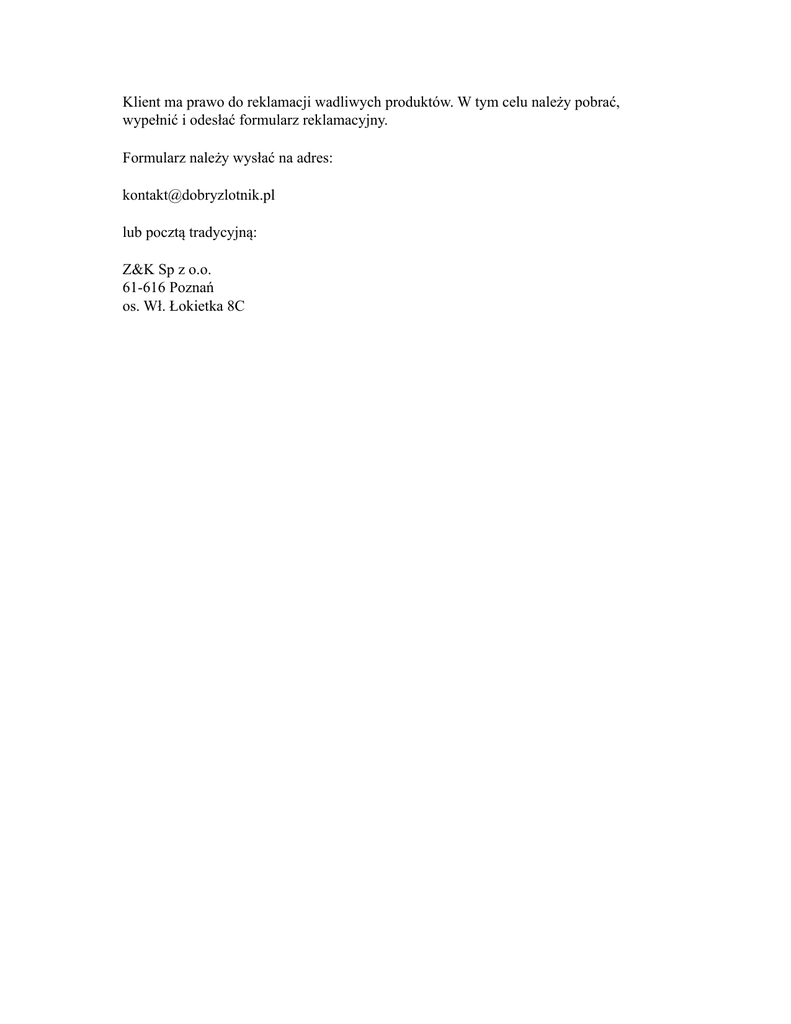 Klient ma prawo do reklamacji wadliwych produktów. W tym celu należy pobrać, wypełnić i odesłać formularz reklamacyjny. Formularz należy wysłać na adres: [email protected] lub pocztą tradycyjną: Z&K Sp z o.o. 61-616 Poznań os. Wł. Łokietka 8C