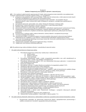 Rozdział 6 Zadania i kompetencje poszczególnych referatów i stanowisk pracy §23. 1. Do wspólnych zadań komórek organizacyjnych Urzędu, należy przygotowywanie materiałów oraz podejmowanie czynności organizatorskich na potrzeby organów Gminy, a w szczególności: 1) przygotowywanie projektów aktów prawnych Rady i Wójta oraz ich wykonywanie, a także opracowywanie innych materiałów przedkładanych tym organom lub ich przedstawicielom, 2) prowadzenie postępowań administracyjnych i przygotowywanie materiałów oraz projektów decyzji administracyjnych, a także wykonywanie zadań wynikających z przepisów o postępowaniu egzekucyjnym w administracji, 3) sporządzanie opracowań, sprawozdań, ocen, analiz i bieżących informacji o realizacji zadań, 4) przygotowanie i realizowanie planów rzeczowo-finansowych w części dotyczącej referatu, 5) udzielanie odpowiedz na wpływające wnioski i zapytania, 6) sprawowanie nadzoru merytorycznego lub współdziałania z jednostkami organizacyjnymi i pomocniczymi Gminy, 7) współdziałanie w ramach posiadanych kompetencji z organami administracji rządowej i samorządowej, samorządami zawodowymi, związkami zawodowymi, organizacjami społecznym, politycznymi oraz innymi podmiotami, 8) uczestniczenie w realizacji zadań z zakresu obronności, ochrony ludności i zarządzania kryzysowego, 9) tworzenia niezbędnych baz danych, 10) pozyskiwania środków zewnętrznych poprzez tworzenie projektów dotyczących wykorzystywania funduszy strukturalnych oraz współpracy w tym zakresie z nadzorowanymi jednostkami organizacyjnymi Gminy, 11) stosowanie obowiązującego jednolitego rzeczowego wykazu akt, stosowanie zasad dotyczących wewnętrznego obiegu akt, przechowywanie akt, 12) przygotowanie materiałów dotyczących rozpatrzenia skarg i wniosków, 13) redagowanie stron biuletynu informacji publicznej. §24. Do podstawowego zakresu działania referatów i samodzielnych stanowisk należy: I. Do zadań referatu finansowo księgowego należą: 1. 2. 3. 4. 5. 6. 7. 8. 9. 10. 11. 12. 13. 14. 15. 16. 17. 18. 19. 20. 21. 22. 23. Prowadzenie księgowości syntetycznej i analitycznej w odniesieniu do: a) budżetu gminy, b) funduszy celowych, c) mienia gminnego. Prowadzenie dokumentacji wypłat z tytułu wynagrodzeń pracowników oraz osób zatrudnionych na umowach zlecenia i o dzieło, oraz dodatków mieszkaniowych. Prowadzenie dokumentacji zasiłków ZUS oraz dokumentacji dotyczącej zgłoszenia i wyrejestrowania osób zatrudnionych na umowach. Rozliczanie składek ZUS. Prowadzenie rozliczeń z Urzędem Skarbowym (podatek od wynagrodzeń, podatek VAT). Windykacja opłat naliczonych przez referat urbanistyki. Prowadzenie ubezpieczenia grupowego pracowników Urzędu. Prowadzenie księgowości podatkowej dotyczącej – podatków i opłat od nieruchomości, podatku rolnego, podatku od środków transportu, grzywien, kar i odsetek za zwłokę, mienia gminnego. Prowadzenie i rozliczanie wpływów z tytułu opłaty skarbowej. Rozliczanie inkasa należności pieniężnych. Wystawianie zaświadczeń o stanie realizacji podatków i opłat dla osób fizycznych. Rozliczanie dłużników oraz załatwianie ich wniosków w zakresie odroczeń i umorzeń podatków i opłat. Wymiar podatków i opłat w zakresie podatku rolnego, podatku od nieruchomości, podatku od posiadania psów, podatku od posiadania środków transportu, mienia gminnego. Wydawania zaświadczeń o stanie majątkowym. Prowadzenie spraw związanych z ulgami w podatkach i opłatach. Przyjmowanie i odprowadzanie na rachunek bankowy wpływów gotówkowych. Podejmowanie i wypłaty należności z tytułu umów, zleceń i o dzieło, oraz innych należności. Prowadzenie dokumentacji obrotu gotówkowego i sporządzanie raportów kasowych. Ochrona należności pieniężnych zgodnie z zasadami gospodarki kasowej. Prowadzenie gospodarki drukami ścisłego zarachowania. Sprawozdawczość z zakresu spraw finansowych, wynikająca z przepisów dotyczących jednostek samorządu terytorialnego. Ewidencja gospodarstw rolnych do celów podatkowych. Dokonywanie wymiaru podatków i innych opłat w zakresie punktu 7 i 8. II. Do zadań referatu urbanistyki, budownictwa i infrastruktury technicznej i gospodarowania mieniem komunalnym należą: 1. Przygotowanie materiałów do opracowania miejscowych planów zagospodarowania przestrzennego i studium uwarunkowań i kierunków zagospodarowania przestrzennego. 2. 3. 4. 5. 6. 7. 8. 9. 10. 11. 12. 13. 14. 15. 16. 17. 18. 19. 20. 21. 22. 23. 24. 25. 26. 27. 28. 29. 30. 31. Wydawanie decyzji o warunkach zabudowy i zagospodarowania terenu. Nadzór nad przestrzeganiem przepisów o ochronie środowiska. Prowadzenie spraw związanych z gospodarką lokalami mieszkalnymi i użytkowymi z zasobów komunalnych. Sprawy związane z budową i utrzymaniem dróg. Nadzór nad bezpieczeństwem na drogach i przejazdach kolejowych. Budowa i remonty obiektów komunalnych, administrowanych przez Urząd. Planowanie i sprawozdawczość w zakresie inwestycji i remontów. Rozliczanie opłat za energię elektryczną, wykorzystywaną do oświetlania dróg. Zakupy inwestycyjne. Zapewnienie prawidłowego funkcjonowania oraz rozbudowa systemów inżynieryjnych, zieleni i usług komunalnych. Współudział w kontrolach prowadzonych przez państwowy nadzór Budowlany. Prowadzenie spraw związanych z przetargami na roboty i usługi budowlane, drogowe, infrastruktury i zakupy. Sprawozdawczość z zakresu zamówień publicznych. Prowadzenie ewidencji gwarancji należytego wykonania robót. Wydawanie postanowień i decyzji dotyczących podziałów nieruchomości. Wydawanie zaświadczeń o przeznaczeniu gruntów w planie zagospodarowania przestrzennego. Rozliczanie i zamykanie inwestycji zakończonych protokołami odbioru. Uzgadnianie z działem księgowości nakładów poniesionych na poszczególne inwestycje na dzień 30.06 i 31.12. Koordynacja w zakresie wynikającym z art. 98 ust.2 ustawy o gospodarce n
