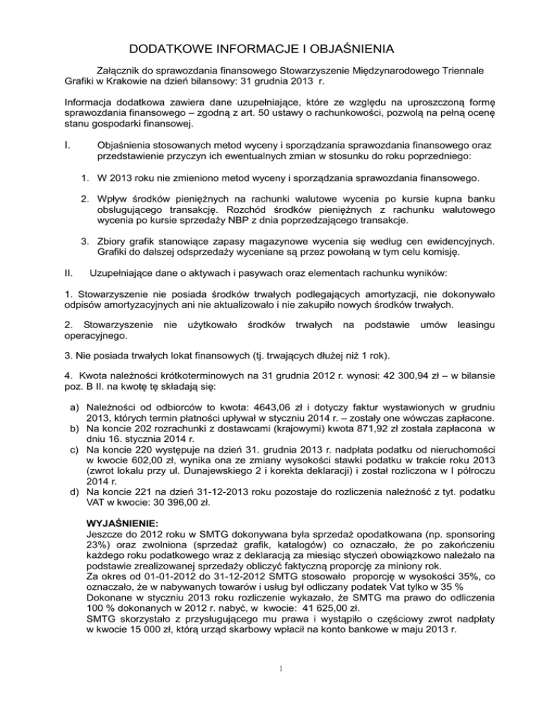 DODATKOWE INFORMACJE I OBJAŚNIENIA Załącznik do sprawozdania finansowego Stowarzyszenie Międzynarodowego Triennale Grafiki w Krakowie na dzień bilansowy: 31 grudnia 2013 r. Informacja dodatkowa zawiera dane uzupełniające, które ze względu na uproszczoną formę sprawozdania finansowego – zgodną z art. 50 ustawy o rachunkowości, pozwolą na pełną ocenę stanu gospodarki finansowej. I. Objaśnienia stosowanych metod wyceny i sporządzania sprawozdania finansowego oraz przedstawienie przyczyn ich ewentualnych zmian w stosunku do roku poprzedniego: 1. W 2013 roku nie zmieniono metod wyceny i sporządzania sprawozdania finansowego. 2. Wpływ środków pieniężnych na rachunki walutowe wycenia po kursie kupna banku obsługującego transakcję. Rozchód środków pieniężnych z rachunku walutowego wycenia po kursie sprzedaży NBP z dnia poprzedzającego transakcje. 3. Zbiory grafik stanowiące zapasy magazynowe wycenia się według cen ewidencyjnych. Grafiki do dalszej odsprzedaży wyceniane są przez powołaną w tym celu komisję. II. Uzupełniające dane o aktywach i pasywach oraz elementach rachunku wyników: 1. Stowarzyszenie nie posiada środków trwałych podlegających amortyzacji, nie dokonywało odpisów amortyzacyjnych ani nie aktualizowało i nie zakupiło nowych środków trwałych. 2. Stowarzyszenie operacyjnego. nie użytkowało środków trwałych na podstawie umów leasingu 3. Nie posiada trwałych lokat finansowych (tj. trwających dłużej niż 1 rok). 4. Kwota należności krótkoterminowych na 31 grudnia 2012 r. wynosi: 42 300,94 zł – w bilansie poz. B II. na kwotę tę składają się: a) Należności od odbiorców to kwota: 4643,06 zł i dotyczy faktur wystawionych w grudniu 2013, których termin płatności upływał w styczniu 2014 r. – zostały one wówczas zapłacone. b) Na koncie 202 rozrachunki z dostawcami (krajowymi) kwota 871,92 zł została zapłacona w dniu 16. stycznia 2014 r. c) Na koncie 220 występuje na dzień 31. grudnia 2013 r. nadpłata podatku od nieruchomości w kwocie 602,00 zł, wynika ona ze zmiany wysokości stawki podatku w trakcie roku 2013 (zwrot lokalu przy ul. Dunajewskiego 2 i korekta deklaracji) i został rozliczona w I półroczu 2014 r. d) Na koncie 221 na dzień 31-12-2013 roku pozostaje do rozliczenia należność z tyt. podatku VAT w kwocie: 30 396,00 zł. WYJAŚNIENIE: Jeszcze do 2012 roku w SMTG dokonywana była sprzedaż opodatkowana (np. sponsoring 23%) oraz zwolniona (sprzedaż grafik, katalogów) co oznaczało, że po zakończeniu każdego roku podatkowego wraz z deklaracją za miesiąc styczeń obowiązkowo należało na podstawie zrealizowanej sprzedaży obliczyć faktyczną proporcję za miniony rok. Za okres od 01-01-2012 do 31-12-2012 SMTG stosowało proporcję w wysokości 35%, co oznaczało, że w nabywanych towarów i usług był odliczany podatek Vat tylko w 35 % Dokonane w styczniu 2013 roku rozliczenie wykazało, że SMTG ma prawo do odliczenia 100 % dokonanych w 2012 r. nabyć, w kwocie: 41 625,00 zł. SMTG skorzystało z przysługującego mu prawa i wystąpiło o częściowy zwrot nadpłaty w kwocie 15 000 zł, którą urząd skarbowy wpłacił na konto bankowe w maju 2013 r. 1 W okresie od 01-01-2013 do 31-12-2013 została rozliczona (per saldo) kwota 11 229,00 złotych i na dzień 31-12-2013 pozostała do rozliczenia kwota 30 396,00 złotych w następnym okresie rozliczeniowym. e) Na koncie 249 kwota: 5 787,96 zł kaucje gwarancyjne zapłacone ZBK – lokali użytkowych znajdujących się w Rynku Głównym 29. 5. Stowarzyszenie nie posiada zobowiązań wobec budżetu z tytułu uzyskania prawa własności budynków i budowli. 6. Fundusz statutowy w 2013 roku nie uległ zmianie. 7. Nadwyżka kosztów na przychodami z roku 2012 roku w kwocie: 40 326,00 zł zwiększyła koszty roku sprawozdawczego (nadwyżka kosztów nie wymaga zatwierdzenia uchwałą na walnym zgromadzeniu. 8. W 2013 SMTG nie utworzyło rezerw celowych. 9. Zobowiązania SMTG są krótkoterminowe (do roku). 10. W pasywach na 31 grudnia 2013 r. wykazane są zobowiązania krótkoterminowe na kwotę: 67 163,34 zł (poz. B.II). Są to: a) Rozrachunki z dostawcami stanowiące kwotę: 23 617,77 zł i dotyczące między innymi: czynszu za wynajmowane lokale (w kwocie: 10 684,80 zł), usług kurierskich (TNT kwota 4000 zł, X-Press kwota 185,91 zł). Poza zaległymi czynszami na rzecz Gminy Kraków. w styczniu 2014 r., wszystkie pozostałe zobowiązania zostały uregulowane. b) Rozrachunki publiczno-prawne w kwocie: 3 301,00 zł (konto: 220-2) dotyczą zaliczek na podatek dochodowy od osób fizycznych PIT 4 (kwota: 3157zł), oraz podatków z tytułu PIT 8A (kwota: 144 zł). Zapłacone w styczniu 2014 r. Z tytułu składek ZUS na 31 grudnia 2013 roku kwota do zapłaty 11 861,00 zł, częściowo zapłacona w styczniu i marcu 2014 r. c) W 2013 roku była kontynuowana realizowane dotacji z Unii Europejskiej na projekty: International Print Network oraz Password: Printmaking. Zakończenie realizacji projektów przypada na dzień 30-04-2014 r., a rozliczenie dotacji nastąpi po akceptacji przez właściwy organ Unii Europejskiej końcowych raportów finansowego i merytorycznego, których złożenie przewidziane jest do 30 czerwca 2014 r. Do momentu ostatecznej akceptacji złożonych raportów, środki dotacji przeznaczone na realizację projektu stanowią zobowiązanie SMTG. Zobowiązanie to na dn. 31 grudnia wynosi 24 343,63 zł w tym: International Print Network kwota: 9648,84 zł a Password: Printmaking kwota: 14 694,79 zł Przyjęcie rozliczenie końcowego obu projektów będzie oznaczać zapłatę na konto SMTG 17500 EURO projekt IPNet oraz 5100 EURO projekt Password: Printmaking. Razem: 22600 EURO, po przeliczeniu na złotówki będzie to kwota około: 92 700,00zł (a strata na działalności za 2013 rok wynosi 90 949,76 zł – zaangażowanie środków własnych w realizację projektów). 10. SMTG nie posiada zobowiązań warunkowych. In
