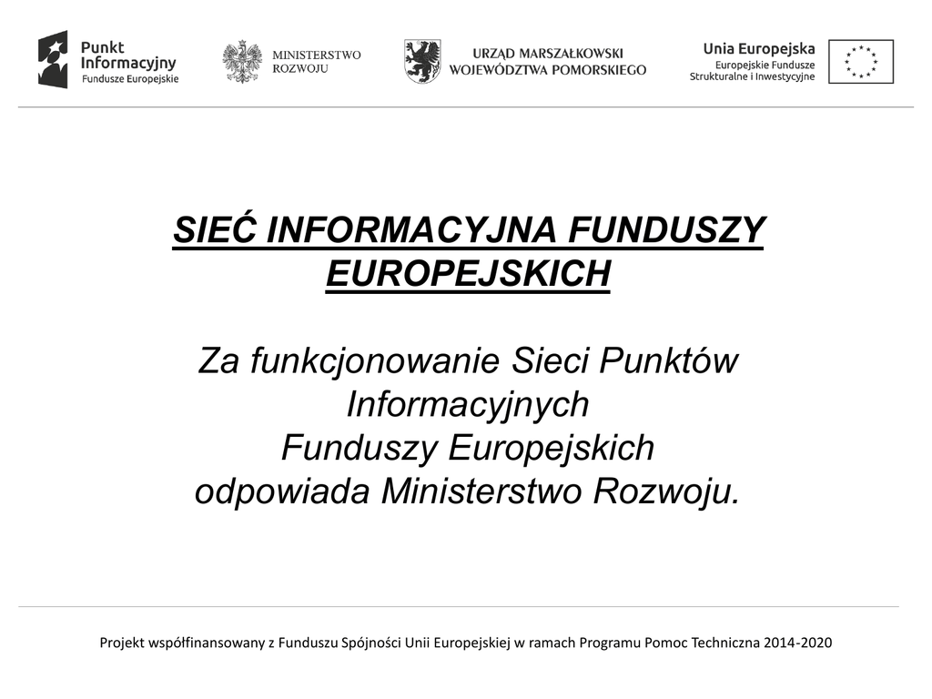 SIEĆ INFORMACYJNA FUNDUSZY EUROPEJSKICH Za funkcjonowanie Sieci Punktów Informacyjnych Funduszy Europejskich odpowiada Ministerstwo Rozwoju. Projekt współfinansowany z Funduszu Spójności Unii Europejskiej w ramach Programu Pomoc Techniczna 2014-2020 Zasady działania Punktów Informacyjnych Funduszy Europejskich w sieci koordynowanej przez Ministerstwo Rozwoju: I. ZAKRES USŁUG INFORMACYJNYCH: 1. Usługi świadczone zainteresowanego. są bezpłatne oraz dostępne dla każdego 2. Punkty Informacyjne należące do sieci oferują następujące rodzaje usług informacyjnych: • zaklasyfikowanie klienta – pomysłu na projekt do konkretnego poprzez diagnozę priorytetu i działania w programie finansowanym z Funduszy Europejskich, • informowanie o warunkach, kryteriach i procedurach przyznania dotacji, • przedstawienie „krok po kroku” procesu ubiegania się o dofinansowanie, • przekazanie danych kontaktowych do instytucji, które przyznają dotacje Projekt współfinansowany z Funduszu Spójności Unii Europejskiej w ramach Programu Pomoc Techniczna 2014-2020 zgodnie ze zdiagnozowanym pomysłem na projekt, ZAKRES USŁUG INFORMACYJNYCH (c.d.): •pomoc beneficjentom ostatecznym w znalezieniu odpowiedniego projektu, •usługi informacyjne i szkoleniowe przy przygotowywaniu wniosków/projektów – obejmuje wsparcie w zakresie przygotowywanego wniosku/projektu oraz szkolenia organizowane przed przeprowadzonym konkursem w ramach danego działania, •pomoc w realizacji projektów - zakres tej usługi obejmuje pomoc przy problemach pojawiających się w trakcie realizacji projektów np. zasady konkurencyjności przy ponoszeniu wydatków, zasady dokumentowania realizowanych przedsięwzięć, •wstępną pomoc w rozliczaniu projektów, zakres tej usługi obejmuje informowanie o etapach, procedurach, wymaganych dokumentach, terminach związanych z procesem rozliczania projektu, informowanie o wymogach przy opisywaniu dokumentów finansowo-księgowych, oraz wstępne doradztwo dla beneficjentów przy wypełnianiu wniosków o płatność pod względem formalnym poprzez objaśnianie instrukcji wypełniania i przygotowania dokumentu, Projekt współfinansowany z Funduszu Spójności Unii Europejskiej w ramach Programu Pomoc Techniczna 2014-2020 SPOSÓB UDZIELANIA INFORMACJI: 1.Pytania do Punktów Informacyjnych można kierować telefonicznie, pocztą elektroniczną i tradycyjną lub w formie konsultacji indywidualnej podczas osobistej wizyty w punkcie. 2. Punkty Informacyjne mogą wprowadzić limit określający czas trwania pojedynczej konsultacji indywidualnej podczas wizyty osobistej. 3. Punkty Informacyjne mogą wprowadzić zapisy na konsultacje indywidualne 4. Spotkania informacyjne 5. Szkolenia. Projekt współfinansowany z Funduszu Spójności Unii Europejskiej w ramach Programu Pomoc Techniczna 2014-2020 III. SPOSÓB UDZIELANIA INFORMACJI c.d.: •Termin udzielenia odpowiedzi na pytanie zadane pocztą elektroniczną wynosi 3 dni robocze; w szczególnych przypadkach okres przygotowania odpowiedzi może się wydłużyć jednak nie może przekroczyć 10 dni roboczych od daty wpływu pytania. •Informacje podane przez Punkt Informacyjny nie stanowią oficjalnego stanowiska Instytucji Zarządzających poszczególnymi Programami Operacyjnymi i nie mogą stanowić podstawy do formułowania jakichkolwiek roszczeń, a także nie stanowią oferty w rozumieniu prawa polskiego. • Punkt Informacyjny ani jego pracownicy nie odpowiadają za błędne interpretacje udzielonych informacji, ani za następstwa czynności podjętych na ich podstawie. Projekt współfinansowany z Funduszu Spójności Unii Europejskiej w ramach Programu Pomoc Techniczna 2014-2020 PUNKTY INFORMACYJNE FUNDUSZY EUROPEJSKICH – dodatkowe informacje – Świadczy ona szerokie usługi informacyjne dotyczące programów operacyjnych realizowanych w ramach Narodowej Strategii Spójności. Od 2014 r. w ramach obejmuje także swoim Umowy Partnerstwa oraz zakresem programy świadczy usługi operacyjne informacyjne uzupełniające o programach polityki rolnej i rybackiej. Projekt współfinansowany z Funduszu Spójności Unii Europejskiej w ramach Programu Pomoc Techniczna 2014-2020 Sieć Punktów Informacyjnych Funduszy Europejskich ma następującą strukturę: Centralny Punkt Informacyjny Funduszy Europejskich, 17 Głównych Punktów Informacyjnych Funduszy Europejskich, po jednym w każdym województwie (w województwie kujawsko-pomorskim działają 2 Główne Punkty Informacyjne), Branżowy Punkt Informacyjny Funduszy Europejskich przy PAIiIZ (dla inwestorów zagranicznych), 35 Lokalnych Punktów Informacyjnych Funduszy Europejskich, w liczbie od kilku do kilkunastu w poszczególnych województwach. Projekt współfinansowany z Funduszu Spójności Unii Europejskiej w ramach Programu Pomoc Techniczna 2014-2020 Za funkcjonowanie Głównych i Lokalnych Punktów Informacyjnych odpowiadają Urzędy Marszałkowskie oraz inne instytucje, z którymi Ministerstwo Rozwoju bądź Urzędy Marszałkowskie podpisały odpowiednie Porozumienia. Za koordynację sieci Punktów Informacyjnych odpowiada Wydział ds. Funkcjonowania Sieci PIFE, Departamentu Informacji i Promocji, Ministerstwa Rozwoju. Uwagi dotyczące pracy sieci Punktów Informacyjnych Funduszy Europejskich można kierować na adres: [email protected]. Projekt współfinansowany z Funduszu Spójności Unii Europejskiej w ramach Programu Pomoc Techniczna 2014-2020 Przydatne strony internetowe: www.rpo.pomorskie.eu www.funduszeeuropejskie.gov.pl www.mir.gov.pl www.dpr.pomorskie.eu www.defs.pomorskie.eu www.zielonalinia.gov.pl www.parp.gov.pl www.firma.gov.pl www.Inwestycjawkadry.pl Projekt współfinansowany z Funduszu Spójności Unii Europejskiej w ramach Programu Pomoc Techniczna 2014-2020