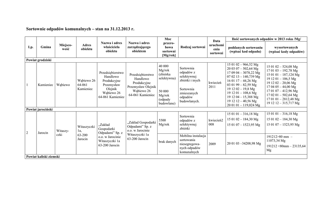 Sortownie odpadów komunalnych – stan na 31.12.2013 r. Lp. Gmina Miejscowość Adres obiektu Nazwa i adres właściciela obiektu Nazwa i adres zarządzającego obiektem Moc przerobowa sortowni [Mg/rok] Rodzaj sortowni Data uruchomi enia sortowni Ilość sortowanych odpadów w 2013 roku /Mg/ poddanych sortowaniu (wpisać kod odpadu) wysortowanych (wpisać kody odpadów) Powiat grodziski 40 000 Mg/rok (zbiórka selektywna) 1 Kamieniec Wąbiewo Przedsiębiorstwo Przedsiębiorstwo Handlowo Handlowo Wąbiewo 26 Produkcyjne Produkcyjne Przemysław 64-061 Przemysław Olejnik Olejnik Kamieniec Wąbiewo 26 50 000 Wąbiewo 26 64-061 Kamieniec Mg/rok 64-061 Kamieniec (odpady budowlane) Sortownia odpadów z selektywnej zbiórki i inych Sortownia zmieszanych odpadów budowlanych. kwiecień 2011 15 01 02 – 966,52 Mg 20 03 07 – 502,64 Mg 17 09 04 – 3078,22 Mg 07 02 13 – 140,739 Mg 16 01 17 – 44,26 Mg 03 01 99 – 82,59 Mg 19 12 02 – 19,8 Mg 19 12 01 – 108,6 Mg 19 12 04 – 15,388 Mg 19 12 12 – 40,56 Mg 20 01 01 – 119,024 Mg 15 01 02 – 524,08 Mg 17 01 03 – 192,78 Mg 15 01 01 – 187,124 Mg 19 12 01 – 106,5 Mg 19 12 02 – 20,06 Mg 17 04 05 – 44,00 Mg 17 01 07 – 412,96 Mg 17 02 01 – 502,64 Mg 17 01 01 – 2812,48 Mg 19 12 12 – 315,717 Mg 15 01 01 – 316,18 Mg 15 01 01 – 316,18 Mg 15 01 02 – 184,30 Mg 15 01 02 – 184,30 Mg 15 01 07 – 1523,95 Mg 15 01 07 – 1523,95 Mg Powiat jarociński 2 Jarocin Witaszyczki Powiat kaliski ziemski Witaszyczki 1a, 63-200 Jarocin „Zakład Gospodarki Odpadami” Sp. z o.o. w Jarocinie Witaszyczki 1a 63-200 Jarocin 5500 „Zakład Gospodarki Mg/rok Odpadami” Sp. z o.o. w Jarocinie Witaszyczki 1a 63-200 Jarocin brak danych Sortownia odpadów z selektywnej zbiórki kwiecień2 008 Mobilna instalacja sortowania niesegregowa2009 nych odpadów komunalnych 20 01 03 –34208,98 Mg 191212>80 mm – 11073,34 Mg 191212 <80mm – 23135,64 Mg Lp. 3 Miejscowość Gmina Ceków Kolonia Nowe Prażuchy k/Kalisza (Orli Staw) Adres obiektu Nowe Prażuchy k/Kalisza Orli Staw 2, 62-834 Ceków Nazwa i adres właściciela obiektu Zakład Unieszkodliwiani a Odpadów Komunalnych „Orli Staw” Związek Komunalny Gmin „Czyste Miasto, Czysta Gmina” Kalisz, Plac Św. Józefa 5, 62-800 Kalisz Nazwa i adres zarządzającego obiektem Związek Komunalny Gmin „Czyste Miasto, Czysta Gmina” Kalisz, Plac Św. Józefa 5, 62-800 Kalisz Moc przerobowa sortowni [Mg/rok] 80 000 Mg/rok Rodzaj sortowni Sortownia niesegregowanych odpadów komunalnych z możliwością sortowania odpadów z selektywnej zbiórki Data uruchomi enia sortowni wrzesień 2006 Ilość sortowanych odpadów w 2013 roku /Mg/ poddanych sortowaniu (wpisać kod odpadu) 02 01 04, 20 03 01, 20 01 01, 20 01 10, 20 01 11, 20 01 39, 20 01 40, 20 01 99, 15 01 01, 15 01 02, 15 01 04, 15 01 06, 15 01 09, 15 01 07, 17 02 01, 17 02 02, 17 02 03, 19 12 08, 19 12 05, 19 12 04, 19 12 02 – ok. 65300 Mg wysortowanych (wpisać kody odpadów) 15 01 01, 15 01 02, 15 01 04, 15 01 05, 15 01 07, 16 01 03, 16 06 01*, 16 06 05 , 17 01 07, 17 01 02, 19 12 01, 19 12 02, 19 12 03, 19 12 07, 19 12 05, 19 12 11*, 19 12 12 (frakcja bio), 16 02 14, 16 80 01, 17 04 11 – ok. 30 000 Mg 19 12 12– 29602 Mg Powiat miasto Kalisz 4 Kalisz Powiat koniński Kalisz ul. Bażancia 1a 62-800 Kalisz Przedsiębiorstwo Usług Komunalnych S.A. ul. Bażancia 1a 62-800 Kalisz Przedsiębiorstwo Usług Komunalnych S.A. ul. Bażancia 1a 62-800 Kalisz 3633,07 Mg/rok Sortownia odpadów z selektywnej zbiórki 2011 - - Lp. 5 6 Gmina Kleczew Konin Miejscowość Genowefa Konin Adres obiektu Genowefa Konin ul. Sulańska 13, 62-510 Konin Nazwa i adres właściciela obiektu UGiM Kleczew Plac Kościuszki 5 62-540 Kleczew Gmina Miejska Konin, Pl. Wolności 1, 62-500 Konin Nazwa i adres zarządzającego obiektem ZGKiM Sp.z o.o. ul. Rzemieślnicza 21,62-540Kleczew Miejski Zakład Gospodarki Odpadami Komunalnymi w Koninie, ul. Sulańska 13 Moc przerobowa sortowni [Mg/rok] Rodzaj sortowni Data uruchomi enia sortowni 20 000 Mg/rok Sortownia niesegregowanych odpadów komunalnych z marzec możliwością 2011 segregowania odpadów z selektywnej zbiórki 37.500 Mg/rok Sortownia odpadów z linią sortowniczą niesegregowanych listopad odpadów 2002 komunalnych (na linii doczyszcza się także papier i tekturę) Ilość sortowanych odpadów w 2013 roku /Mg/ poddanych sortowaniu (wpisać kod odpadu) 200301 – 18053,0 Mg 150101 – 130,0 Mg 150102 – 631,0 Mg 150106 – 284,0 Mg 150107 – 422,0 Mg 20 03 01–35380,84 Mg wysortowanych (wpisać kody odpadów) 150101 – 300 Mg 150102 – 793 Mg 150104 – 14 Mg 150106 – 210 Mg 150107 – 518 Mg 191202 – 92 Mg 191203 – 14 Mg 191201 – 58 Mg 191207 – 19 Mg 191212 – 6297 Mg 191209 – 11205 Mg 150104-6,32 Mg 191202-55,72 Mg 200101-130,62 Mg 200102-118,42 Mg 200139-114,27 Mg 191209-11459 Mg 191212-11736,3 Mg(frakcja podsitowa organiki) 191212-11759,2 Mg 150101-245,30 Mg 20 01 01– 1057,95 Mg + 86,17 Mg z roku 2012 191201-579,96 Mg 191212-318,86 Mg 2 Mg/h Linia do doczyszczania szkła z selektywnej zbiórki grudzień 2004 20 01 02 – 1612,37Mg +85,82 Mg z roku 2012 15 01 07 – 1520,19 Mg 19 12 12 –138 Mg Lp. Miejscowość Gmina Adres obiektu Nazwa i adres właściciela obiektu Nazwa i adres zarządzającego obiektem Moc przerobowa sortowni [Mg/rok] Rodzaj sortowni 0,9 Mg/h Linia do doczyszczania tworzyw sztucznych z selektywnej zbiórki 42 940 Mg/rok Sortownia odpadów z selektywnej zbiórki 165 000 Mg/rok Sortownia niesegregowanych odpadów komunalnych Data uruchomi enia sortowni grudzień 2005 Ilość sortowanych odpadów w 2013 roku /Mg/ poddanych sortowaniu (wpisać kod odpadu) 20 01 39 –1720,21 Mg wysortowanych (wpisać kody odpadów) 15 01 02 – 419,65 Mg 15 01 04 – 1,32 Mg 15 01 05 – 4,12 Mg 19 12 02 – 0,10 Mg 19 12 12 – 1220,02 Mg Powiat kościański 7 Czempiń Piotrowo Pierwsze Piotrowo Pierwsze 26/27 64-020 Czempiń Tonsmeier SELEKT Sp. z o.o. Piotrowo Pierwsze 26/27 64-020 Czempiń T