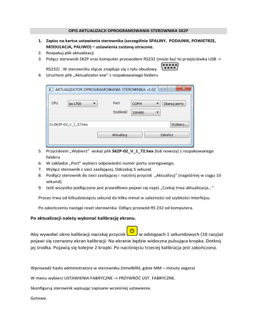 OPIS AKTUALIZACJI OPROGRAMOWANIA STEROWNIKA SKZP 1. Zapisz na kartce ustawienia sterownika (szczególnie SPALINY, PODAJNIK, POWIETRZE, MODULACJA, PALIWO) – ustawienia zostaną utracone. 2. Rozpakuj plik aktualizacji 3. Połącz sterownik SKZP oraz komputer przewodem RS232 (może być to przejściówka USB -> RS232) . W sterowniku złącze znajduje się z tyłu obudowy. 4. Uruchom plik „Aktualizator.exe” z rozpakowanego folderu 5. Przyciskiem „Wybierz” wskaż plik SKZP-02_V_1_72.hex (lub nowszy) z rozpakowanego folderu 6. W zakładce „Port” wybierz odpowiedni numer portu szeregowego. 7. Wyłącz sterownik z sieci zasilającej. Odczekaj 5 sekund. 8. Podłącz sterownik do sieci zasilającej i naciśnij przycisk „Aktualizuj” (najpóźniej w ciągu 10 sekund). 9. Jeśli wszystko podłączone jest prawidłowo pojawi się napis „Czekaj trwa aktualizacja…” Proces trwa od kilkudziesięciu sekund do kilku minut w zależności od szybkości interfejsu. Po zakończeniu nastąpi reset sterownika. Odłącz przewód RS 232 od komputera. Po aktualizacji należy wykonać kalibrację ekranu. Aby wywołać okno kalibracji naciskaj przycisk w odstępach 1 sekundowych (10 razy)aż pojawi się czerwony ekran kalibracji. Na ekranie będzie widoczna pulsująca kropka. Dotknij jej środka. Pojawią się kolejne 2 kropki. Po naciśnięciu trzeciej kalibracja jest zakończona. Wprowadź hasło administratora w sterowniku (timelMM, gdzie MM – minuty zegara) W menu wybierz USTAWIENIA FABRYCZNE -> PRZYWRÓĆ UST. FABRYCZNE. Skonfiguruj sterownik wpisując zapisane wcześniej ustawienia. Gotowe.