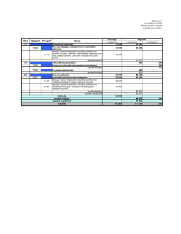 Załącznik nr 1 do Uchwały Nr 77/2007 Zarządu Powiatu w Policach z dnia 29 sierpnia 2007 r. Dział Rozdział Paragraf 010 01005 2110 750 75075 75095 852 85201 2130 6430 Nazwa Rolnictwo i łowiectwo Prace geodezyjno-urządzeniowe na potrzeby rolnictwa Dotacje celowe otrzymane z budżetu państwa na zadania bieżące z zakresu administracji rządowej oraz inne zadania zlecone ustawami realizowane przez powiat wydatki bieżące Administracja publiczna Promocja jednostek samorządu terytorialnego wydatki bieżące Pozostała działalność wydatki bieżące Pomoc społeczna Placówki opiekuńczo-wychowawcze Dotacje celowe otrzymane z budżetu państwa na realizację bieżących zadań własnych powiatu Dotacje celowe otrzymane z budżetu państwa na realizację inwestycji i zakupów inwestycyjnych własnych powiatu wydatki bieżące wydatki majątkowe dochody wydatki bieżące wydatki majątkowe RAZEM Dochody zwiększenie Wydatki zwiększenie 13 300 13 300 13 300 13 300 zmniejszenie 13 300 13 300 601 43 500 43 500 601 601 601 601 601 43 500 43 500 28 500 15 000 28 500 15 000 56 800 56 800 42 401 15 000 601 57 401 601 Załącznik nr 2 do Uchwały Nr 77/2007 Zarządu Powiatu w Policach z dnia 29 sierpnia 2007 r. Dział Rozdział Paragraf 853 85333 4110 4120 4170 4370 4430 852 85201 Dochody Rodzaj zadań Dysponent środków budżetowych zwiększenie Nazwa działu, rozdziału, jednostki, paragrafu zadania własne Dyrektor Powiatowego Urzędu Pracy Pozostałe zadania w zakresie polityki społecznej Wydatki zwiększenie Powiatowe urzędy pracy Powiatowy Urząd Pracy w Policach Składki na ubezpieczenia społeczne Składki na Fundusz Pracy Wynagrodzenia bezosobowe Opłaty z tytułu zakupu usług telekomunikacyjnych telefonii stacjonarnej Różne opłaty i składki zmniejszenie 11 636 11 636 11 636 11 636 11 636 11 636 10 386 1 386 9 000 1 250 1 250 Dyrektor Powiatowego Centrum Pomocy Rodzinie Pomoc społeczna 43 500 43 500 Placówki opiekuńczo-wychowawcze 43 500 43 500 4270 Dotacje celowe otrzymane z budżetu państwa na realizację bieżących zadań własnych powiatu Dotacje celowe otrzymane z budżetu państwa na realizację inwestycji i zakupów inwestycyjnych własnych powiatu Dom Dziecka w Policach Zakup usług remontowych Wydatki inwestycyjne jednostek budżetowych Wydatki na zakupy inwestycyjne jednostek budżetowych Dom Dziecka w Tanowie Zakup usług remontowych 750 Administracja publiczna 18 18 Starostwa powiatowe Starostwo Powiatowe w Policach Podatek od towarów i usług (VAT) Odsetki od nieterminowych wpłat podatku od towarów i usług (VAT) 18 18 18 18 18 2130 6430 4270 6050 6060 28 500 15 000 30 000 15 000 10 000 5 000 13 500 13 500 Naczelnik Wydziału Administracji i Organizacji 75020 4530 4680 18 70005 Naczelnik Wydziału Geodezji i Gospodarki Nieruchomościami Gospodarka mieszkaniowa Gospodarka gruntami i nieruchomościami 6050 6060 Starostwo Powiatowe w Policach Wydatki inwestycyjne jednostek budżetowych Wydatki na zakupy inwestycyjne jednostek budżetowych 700 10 000 10 000 10 000 10 000 10 000 10 000 10 000 10 000 Kierownik Referatu Promocji i Rozwoju 75075 750 Administracja publiczna Promocja jednostek samorządu terytorialnego 4300 Starostwo Powiatowe w Policach Zakup usług pozostałych 601 601 601 601 Kierownik Biura Bezpieczeństwa i Porządku Publicznego 754 Bezpieczeństwo publiczne i ochrona przeciwpożarowa 496 496 496 496 496 496 496 4210 4300 Pozostała działalność Starostwo Powiatowe w Policach Zakup materiałów i wyposażenia Zakup usług pozostałych 010 zadania zlecone Naczelnik Wydziału Geodezji i Gospodarki Nieruchomościami Rolnictwo i łowiectwo 13 300 75495 01005 2110 4300 496 Prace geodezyjno-urządzeniowe na potrzeby rolnictwa Dotacje celowe otrzymane z budżetu państwa na zadania bieżące z zakresu administracji rządowej oraz inne zadania zlecone ustawami realizowane przez powiat Starostwo Powiatowe w Policach Zakup usług pozostałych 13 300 13 300 13 300 13 300 13 300 13 300 porozumienia Kierownik Referatu Promocji i Rozwoju 750 75095 4309 Administracja publiczna 601 Pozostała działalność Starostwo Powiatowe w Policach Zakup usług pozostałych 601 601 601 dochody 56 800 zadania własne 65 650 zadania zlecone 13 300 porozumienia razem: 22 751 601 56 800 79 551 22 751