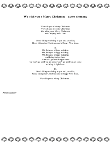 We wish you a Merry Christmas – autor nieznany We wish you a Merry Christmas; We wish you a Merry Christmas; We wish you a Merry Christmas and a Happy New Year. I. Good tidings we bring to you and your kin; Good tidings for Christmas and a Happy New Year. II. Oh, bring us a figgy pudding; Oh, bring us a figgy pudding; Oh, bring us a figgy pudding; and bring it right here. We won't go until we get some we won't go until we get some·won't go until we get some so bring it right here. III. Good tidings we bring to you and your kin; Good tidings for Christmas and a Happy New Year. We wish you a Merry Christmas ... Autor nieznany