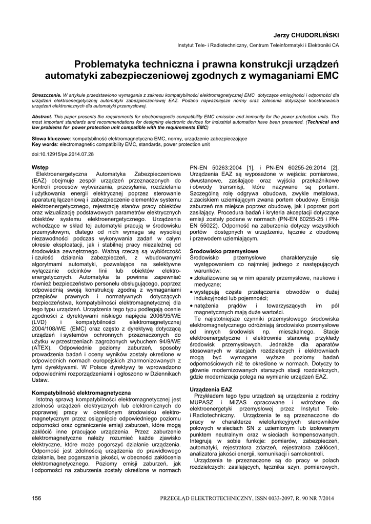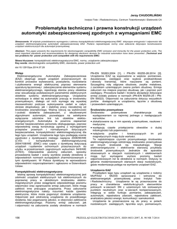 Jerzy CHUDORLIŃSKI Instytut Tele- i Radiotechniczny, Centrum Teleinformatyki i Elektroniki CA Problematyka techniczna i prawna konstrukcji urządzeń automatyki zabezpieczeniowej zgodnych z wymaganiami EMC Streszczenie. W artykule przedstawiono wymagania z zakresu kompatybilności elektromagnetycznej EMC dotyczące emisyjności i odporności dla urządzeń elektroenergetycznej automatyki zabezpieczeniowej EAZ. Podano najważniejsze normy oraz zalecenia dotyczące konstruowania urządzeń elektronicznych dla automatyki przemysłowej. Abstract. This paper presents the requirements for electromagnetic compatibility EMC emission and immunity for the power protection units. The most important standards and recommendations for designing electronic devices for industrial automation have been presented. (Technical and law problems for power protection unit compatible with the requirements EMC) Słowa kluczowe: kompatybilność elektromagnetyczna EMC, normy, urządzenie zabezpieczające Key words: electromagnetic compatibility EMC, standards, power protection unit doi:10.12915/pe.2014.07.28 Wstęp Elektroenergetyczna Automatyka Zabezpieczeniowa (EAZ) obejmuje zespół urządzeń przeznaczonych do kontroli procesów wytwarzania, przesyłania, rozdzielania i użytkowania energii elektrycznej poprzez sterowanie aparaturą łączeniową i zabezpieczenie elementów systemu elektroenergetycznego, rejestrację stanów pracy obiektów oraz wizualizację podstawowych parametrów elektrycznych obiektów systemu elektroenergetycznego. Urządzenia wchodzące w skład tej automatyki pracują w środowisku przemysłowym, dlatego od nich wymaga się wysokiej niezawodności podczas wykonywania zadań w całym okresie eksploatacji, jak i stabilnej pracy niezależnej od środowiska zewnętrznego. Ważną rzeczą są wybiórczość i czułość działania zabezpieczeń, z wbudowanymi algorytmami automatyki, pozwalające na selektywne wyłączanie odcinków linii lub obiektów elektroenergetycznych. Automatyka ta powinna zapewniać również bezpieczeństwo personelu obsługującego, poprzez odpowiednią swoją konstrukcję zgodną z wymaganiami przepisów prawnych i normatywnych dotyczących bezpieczeństwa, kompatybilności elektromagnetycznej dla tego typu urządzeń. Urządzenia tego typu podlegają ocenie zgodności z dyrektywami niskiego napięcia 2006/95/WE (LVD) i kompatybilności elektromagnetycznej 2004/108/WE (EMC) oraz często z dyrektywą dotyczącą urządzeń i systemów ochronnych przeznaczonych do użytku w przestrzeniach zagrożonych wybuchem 94/9/WE (ATEX). Odpowiednie poziomy zaburzeń, sposoby prowadzenia badań i oceny wyników zostały określone w odpowiednich normach europejskich zharmonizowanych z tymi dyrektywami. W Polsce dyrektywy te wprowadzono odpowiednimi rozporządzeniami i ogłoszono w Dziennikach Ustaw. Kompatybilność elektromagnetyczna Istotną sprawą kompatybilności elektromagnetycznej jest zdolność urządzeń elektrycznych lub elektronicznych do poprawnej pracy w określonym środowisku elektromagnetycznym przez osiągnięcie odpowiedniego poziomu odporności oraz ograniczenie emisji zaburzeń, które mogą zakłócić inne pracujące urządzenia. Przez zaburzenie elektromagnetyczne należy rozumieć każde zjawisko elektryczne, które może pogorszyć działanie urządzenia. Odporność jest zdolnością urządzenia do prawidłowego działania, bez pogarszania jakości, w obecności zakłócenia elektromagnetycznego. Poziomy emisji zaburzeń, jak i odporności na zaburzenia zostały określone w normach 156 PN-EN 50263:2004 [1], i PN-EN 60255-26:2014 [2]. Urządzenia EAZ są wyposażone w wejścia: pomiarowe, dwustanowe, zasilające oraz wyjścia przekaźnikowe i obwody transmisji, które nazywane są portami. Szczególną rolę odgrywa obudowa, zwykle metalowa, z zaciskiem uziemiającym zwana portem obudowy. Emisja zaburzeń ma miejsce poprzez obudowę, jak i poprzez port zasilający. Procedura badań i kryteria akceptacji dotyczące emisji zostały podane w normach (PN-EN 60255-25 i PNEN 55022). Odporność na zaburzenia dotyczy wszystkich portów dostępnych w urządzeniu, łącznie z obudową i przewodem uziemiającym. Środowisko przemysłowe Środowisko przemysłowe charakteryzuje się występowaniem co najmniej jednego z następujących warunków: zlokalizowane są w nim aparaty przemysłowe, naukowe i medyczne; występują częste przełączenia obwodów o dużej indukcyjności lub pojemności; natężenia prądów i towarzyszących im pól magnetycznych mają duże wartości. Te najistotniejsze czynniki przemysłowego środowiska elektromagnetycznego odróżniają środowisko przemysłowe od innych środowisk np. mieszkalnego. Stacje elektroenergetyczne i elektrownie stanowią przykłady środowisk przemysłowych. Jednakże dla aparatów stosowanych w stacjach rozdzielczych i elektrowniach mogą być wymagane wyższe poziomy badań odpornościowych niż te określone w normach. Dotyczy to głównie modernizowanych starszych stacji rozdzielczych, gdzie modernizacja polega na wymianie urządzeń EAZ. Urządzenia EAZ Przykładem tego typu urządzeń są urządzenia z rodziny MUPASZ i MIZAS opracowane i wdrożone do elektroenergetyki przemysłowej przez Instytut Telei Radiotechniczny. Urządzenia te są przeznaczone do pracy w charakterze wielofunkcyjnych sterowników polowych w sieciach SN z uziemionym lub izolowanym punktem neutralnym oraz w sieciach kompensowanych. Integrują w sobie funkcje: pomiarów, zabezpieczeń, automatyki, rejestratora zdarzeń, rejestratora zakłóceń, analizatora jakości energii, komunikacji i samokontroli. Urządzenia te przeznaczone są do pracy w polach rozdzielczych: zasilających, łącznika szyn, pomiarowych, PRZEGLĄD ELEKTROTECHNICZNY, ISSN 0033-2097, R. 90 NR 7/2014 Port wyjściowy Port wejściowy Port komunikacyjny Rys. 1. Porty przekaźników zabezpieczeniowych pomiarowych i urządzeń X X Rodzaj zaburzenia Promieniowane pol