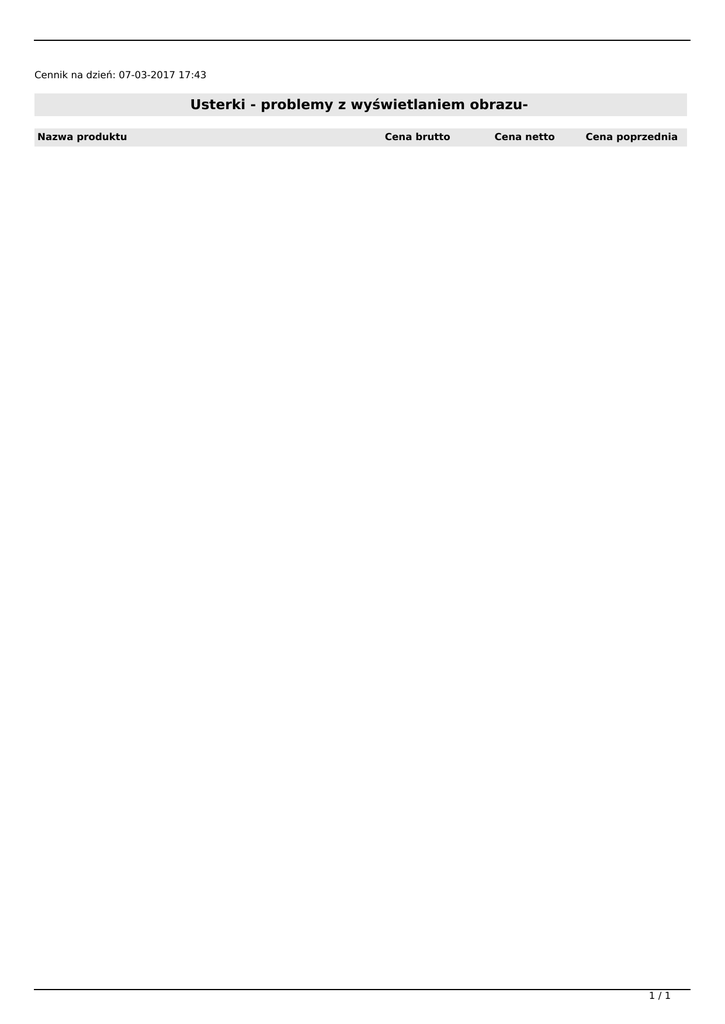 Cennik na dzień: 07-03-2017 17:43 Usterki - problemy z wyświetlaniem obrazuNazwa produktu Cena brutto Cena netto Cena poprzednia 1/1 Powered by TCPDF (www.tcpdf.org)