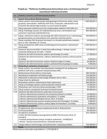 Załącznik Projekt pn. "Platforma Zunifikowanej Komunikacji wraz z Archiwizacją Danych" szacunkowa kalkulacja kosztów Lp. Zadanie z wniosku o dofinansowanie projektu 1. 1.1 System Komunikacji Wielokanałowej Zakup systemu komunikacyjnego obsługującego konferencje wideo, pracę grupową, komunikator, telefonię VoIP wraz z licencjami, wdrożeniem oraz serwisem dla wdrożonego systemu na czas trwania projektu Zakup aparatów telefonicznych dla użytkowników telefonii VoIP (500 szt.) Zakup mobilnego zestawu do wideokonferencji wraz z terminalami oraz systemem rejestracji wideokonferencji 1.2 1.3 1.4 Zakup i wdrożenie systemu pocztowego dla 1050 stanowisk wraz z aktualizacją oprogramowania na stanowiskach oraz systemem ochrony poczty 1.5 Zakup modułów PoE do gniazd sieciowych na skrzydło południowe budynku przy ul. Plac Teatralny 2 w Toruniu 1.6 Zakup komputerów (400 sztuk) umożliwiających korzystanie z wdrożonych technologii 1.7 Szkolenie dla pracowników Urzędu Marszałkowskiego z obsługi nowych systemów (48 grup po 20 osób - 1 dzień) Szkolenie dla Administratorów systemu pocztowego (3 osoby) Szkolenie dla Administratorów z zakresu administracji systemu ochrony poczty (3 osoby) Szkolenie dla Administratorów systemu telefonicznego (3 osoby) Szkolenie dla Administratorów systemu wideokonferyencyjnego (3 osoby) 2. Rozbudowa systemów serwerowych 2.1 Zakup switch-y do punktów dystrybucyjnych niezbędnych do podłączenia telefonii VoIP wraz z systemem bezpieczeństwa NAC 2.2 Modernizacja infrastruktury serwerowej 2.3 Aktualizacja środowiska wirtualizacyjnego 2.4 Wdrożenie środowiska serwerowego Windows Server 2012 2.5 Zakup macierzy dyskowej 2.6 Rozbudowa systemu wykonywania kopii zapasowych 2.7 Zakup centralnego systemu podtrzymywania zasilania UPS 2.8 Rozbudowa sieci Internetu bezprzewodowego z PAIP 2.9 Zakup systemu zarządzania licencjami komputerowymi 2.10 Szkolenia dla Administratorów systemów serwerowych Z zakresu administracji systemem do archiwizacji danych (3 osoby) Z zakresu administracji systememu wirtualizacji (3 osoby) Z zakresu administracji Windows Server 2012 (3 osoby) Z zakresu Administracji systemu bezpieczeństwa (Fortimanager) (3 osoby) Z zakresu Administracji systemu analizy logów (Fortianalizer) (3 osoby) 3. Zarządzanie projektem 3.1 Przygotowanie dokumentacji projektowej Studium Wykonalności 3.2 Promocja projektu 3.3 Zarządzanie projektem 3 etaty dla Informatyków (wynagrodzenie 6500 zł brutto przez okres 15 miesięcy) 3 zestawy komputerowe (stacje zarządcze systemów) - 24 000,00 zł + biurka + koszty utrzymania biura+ materiały biurowe 3.4 Usługa nadzoru technicznego nad wdrożeniem i realizacją projektu Suma Wkład własny samorządu województwa: 1.279.260,00 zł Wartość brutto zł 1 400 000,00 zł 320 000,00 zł 605 000,00 zł 450 000,00 zł 20 000,00 zł 1 400 000,00 zł 120 000,00 zł 27 000,00 zł 9 000,00 zł 30 000,00 zł 7 000,00 zł 350 000,00 zł 589 250,00 zł 220 000,00 zł 216 000,00 zł 330 000,00 zł 840 000,00 zł 70 000,00 zł 75 000,00 zł 80 000,00 zł 24 000,00 zł 24 000,00 zł 32 000,00 zł 9 000,00 zł 9 000,00 zł 40 000,00 zł 60 000,00 zł 422 150,00 zł 750 000,00 zł 8 528 400,00 zł