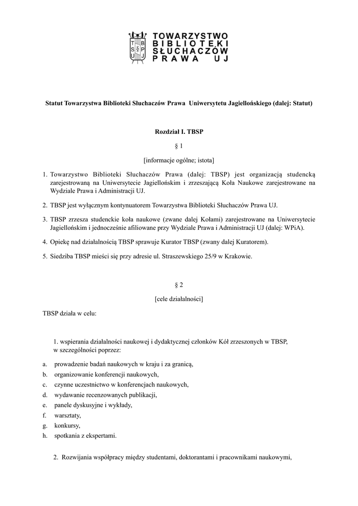 ! ! Statut Towarzystwa Biblioteki Słuchaczów Prawa Uniwersytetu Jagiellońskiego (dalej: Statut) ! Rozdział I. TBSP §1 [informacje ogólne; istota] 1. Towarzystwo Biblioteki Słuchaczów Prawa (dalej: TBSP) jest organizacją studencką zarejestrowaną na Uniwersytecie Jagiellońskim i zrzeszającą Koła Naukowe zarejestrowane na Wydziale Prawa i Administracji UJ. 2. TBSP jest wyłącznym kontynuatorem Towarzystwa Biblioteki Słuchaczów Prawa UJ. 3. TBSP zrzesza studenckie koła naukowe (zwane dalej Kołami) zarejestrowane na Uniwersytecie Jagiellońskim i jednocześnie afiliowane przy Wydziale Prawa i Administracji UJ (dalej: WPiA). 4. Opiekę nad działalnością TBSP sprawuje Kurator TBSP (zwany dalej Kuratorem). 5. Siedziba TBSP mieści się przy adresie ul. Straszewskiego 25/9 w Krakowie. ! §2 [cele działalności] TBSP działa w celu: ! 1. wspierania działalności naukowej i dydaktycznej członków Kół zrzeszonych w TBSP, w szczególności poprzez: a. prowadzenie badań naukowych w kraju i za granicą, b. organizowanie konferencji naukowych, c. czynne uczestnictwo w konferencjach naukowych, d. wydawanie recenzowanych publikacji, e. panele dyskusyjne i wykłady, f. warsztaty, g. konkursy, h. spotkania z ekspertami. ! 2. Rozwijania współpracy między studentami, doktorantami i pracownikami naukowymi, 3. Rozwoju działalności studenckich i doktoranckich kół naukowych na WPiA, 4. Integracji studenckiego ruchu naukowego na WPiA UJ, ! 5. Podtrzymywania tradycji Towarzystwa Biblioteki Słuchaczów Prawa UJ. §3 [realizacja celów] TBSP realizuje swoje cele w szczególności poprzez: 1. podział środków finansowych; 2. prowadzenie działalności wydawniczej, 3. reprezentowanie Kół, w szczególności wobec władz UJ oraz WPiA, 4. udostępnianie Kołom pomieszczeń oraz sprzętu biurowego, konferencyjnego i dydaktycznego, 5. organizowanie szkoleń dla Kół oraz przygotowywanie dla nich instrukcji i poradników, 6. opracowanie spójnej identyfikacji wizualnej Kół, 7. utrzymywanie kontaktów i nawiązywanie współpracy z byłymi członkami TBSP, 8. organizowanie praktyk studenckich, w szczególności we współpracy z kancelariami prawnymi, przedsiębiorcami, organami administracji publicznej oraz organizacjami studenckimi, 9. prowadzenie biblioteki, 10. kultywowanie pamięci o przeszłości Towarzystwa Biblioteki Słuchaczów Prawa UJ i jego wybitnych członkach. ! Rozdział II. Organy §4 [wyliczenie organów] 1. Organami TBSP są: a) Zarząd (zwany dalej Zarządem) b) Prezes (zwany dalej Prezesem); c) Sąd Koleżeński (zwany dalej Sądem); d) Komisja Rewizyjna (zwana dalej Komisją). 2. Łączenie funkcji Prezesa, członka Komisji, Sędziego jest niedopuszczalne. 3. Prezesem lub członkiem organu TBSP może być tylko student będący w chwili wyboru członkiem Koła. 4. W przypadku łączenia funkcji Prezesa, Członka Komisji lub Sądu z funkcją we władzach Koła nie przysługuje z tego tytułu dodatkowy głos. ! ! Rozdział III. Zarząd Towarzystwa §5 [istota i tryb głosowania] 1. W skład Zarządu wchodzi Prezes, Wiceprezesi oraz Przewodniczący Kół albo osoby wyznaczone przez ich władze. 2. W posiedzeniach Zarządu ma obowiązek uczestniczyć przynajmniej jeden członek Komisji oraz Sędzia. 3. Członek Komisji oraz Sędzia mają po jednym głosie. ! §6 [głosy] 1. Każde Koło dysponuje jednym głosem. 2. Prezes oraz Wiceprezesi powoływani obowiązkowo dysponują po jednym głosie. Inni Wiceprezesi nie biorą udziału w głosowaniach. 3. W razie równej ilości głosów w głosowaniu decydujący jest głos Prezesa. 4. Uchwały podejmowane są zwykłą większością głosów w obecności co najmniej połowy członków Zarządu, chyba że Statut stanowi inaczej. 5. W wypadku głosowań personalnych, a także na wniosek 1/3 członków Zarządu głosowanie odbywa się w trybie tajnym. ! §7 [kompetencje Zarządu] 1. Zarząd wykonuje kompetencje przewidziane w przepisach niniejszego statutu oraz aktach wewnętrznych wydanych na podstawie upoważnienia zawartego w statucie. 2. Zarząd w szczególności : a) uchwala uchwały finansowe b)wysłuchuje rocznego sprawozdania Prezesa oraz Wiceprezesów, podejmuje uchwałę w sprawie udzielenia absolutorium łącznie Prezesowi i Wiceprezesom. Uchwałę w sprawie absolutorium podejmuje bezwzględną większością głosów przy udziale co najmniej 2/3 członków Zarządu. 3. Inicjatywę uchwałodawczą ma każdy członek Zarządu, chyba że Statut lub Regulamin Finansowania stanowi inaczej. ! §8 [Zarząd elektroniczny] 1. W okresie letniej przerwy od zajęć dydaktycznych możliwe jest głosowanie Zarządu w formie elektronicznej. 2. Głosowanie odbywa się poprzez wysłanie wiadomości z oficjalnego adresu poczty elektronicznej TBSP. 3. Głosowanie w formie elektronicznej jest ogłaszane przez Prezesa władzom Kół za pomocą poczty elektronicznej co najmniej na 7 dni przed jego rozpoczęciem i trwa co najmniej 72 godziny, a najdłużej 7 dni. 4. Głosowanie w formie elektronicznej można przeprowadzić w sprawach bieżącej działalności TBSP, w sprawie uchwał finansowych. Niedopuszczalne jest głosowanie nad sprawami personalnymi oraz zmianami w Statucie. ! Rozdział IV. Prezes §9 [kompetencje prezesa] Prezes Towarzystwa : 1. kieruje bieżącą działalnością Towarzystwa; 2. reprezentuje Towarzystwo wobec Władz WPiA UJ, Uczelni i innych instytucji oraz może delegować przedstawicieli TBSP na posiedzenia Rady WPiA; 3. zwołuje co najmniej raz na dwa miesiące posiedzenie Zarządu, nie dotyczy to okresu letniej przerwy od zajęć dydaktycznych; 4. nadzoruje pracę Wiceprezesów i ponosi za nią pełną odpowiedzialność; 5. wykonuje inne zadania powierzone mu przez Statut. ! ! ! § 10 [wybory Prezesa, kadencja] 1. Prezesa wybiera Zarząd. 2. Prezes wybierany jest na roczną kadencję trwającą od dnia jego wyboru do dnia wyboru jego następcy. 3. Kandydatem na Prezesa może być członek Koła, zgłoszony 